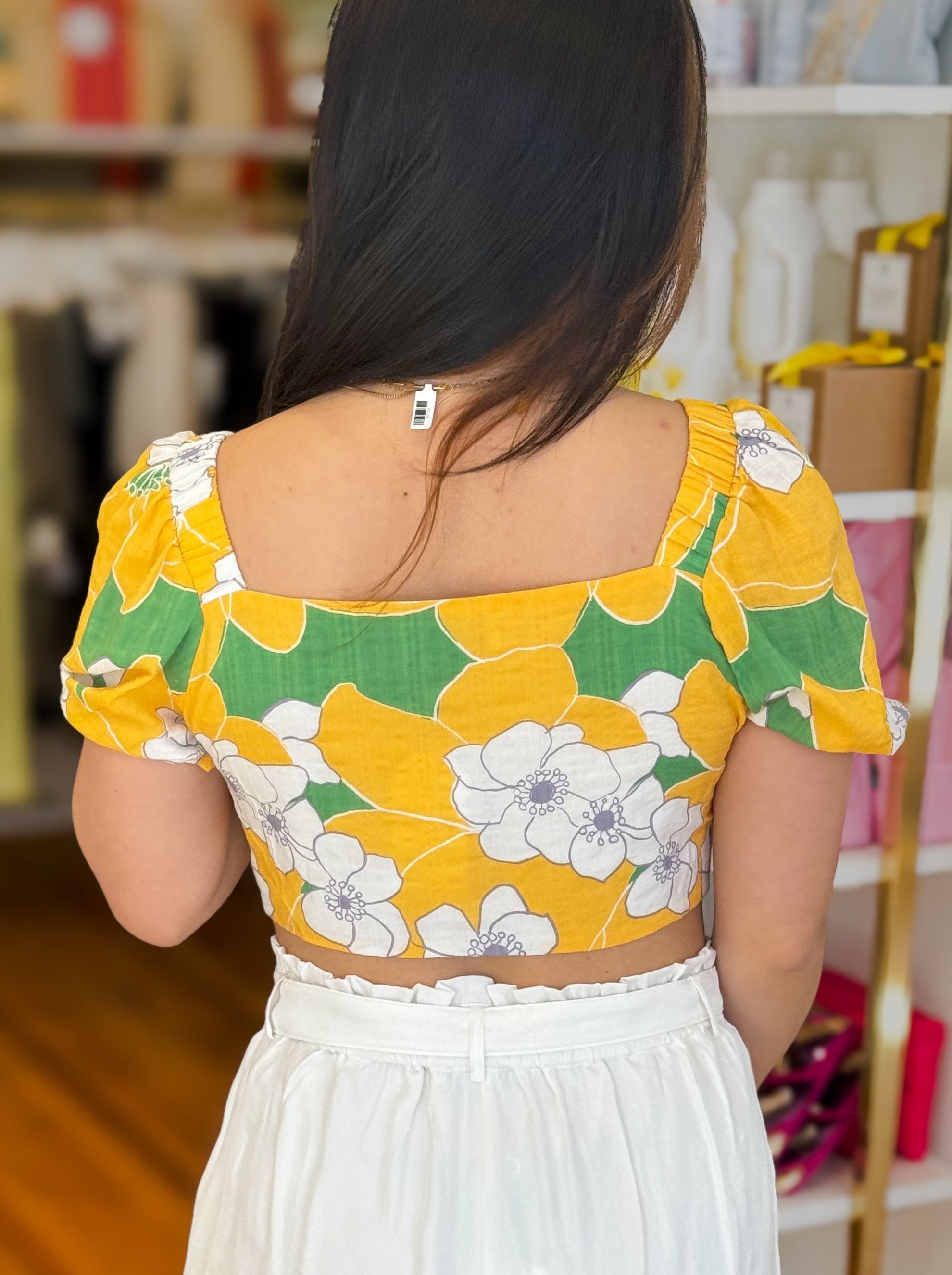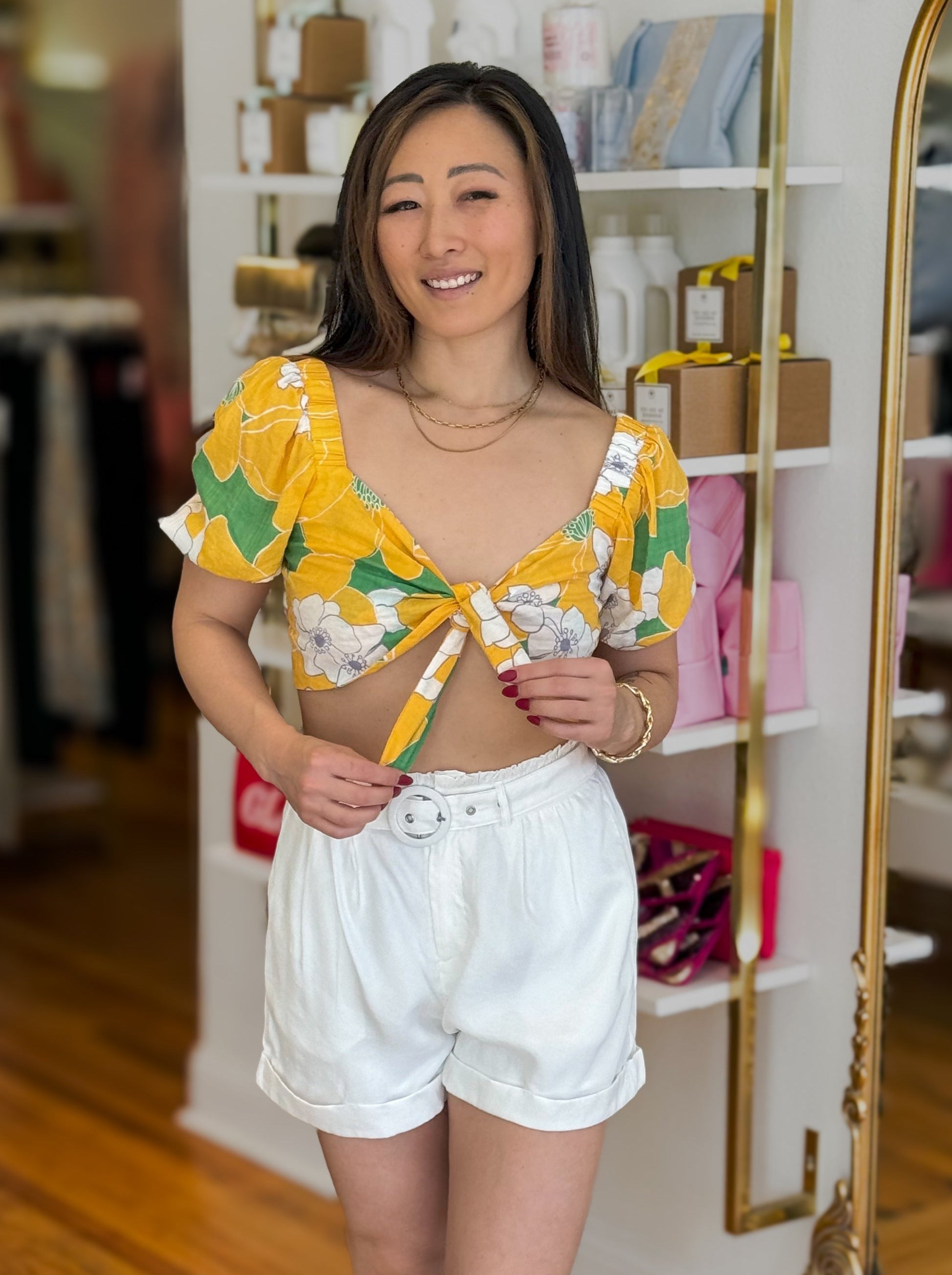 DESERT FLOWER FRONT TIE CROP TOP. SELF: 83% RAYON 17% NYLON LINING: 100% POLYESTER