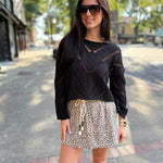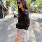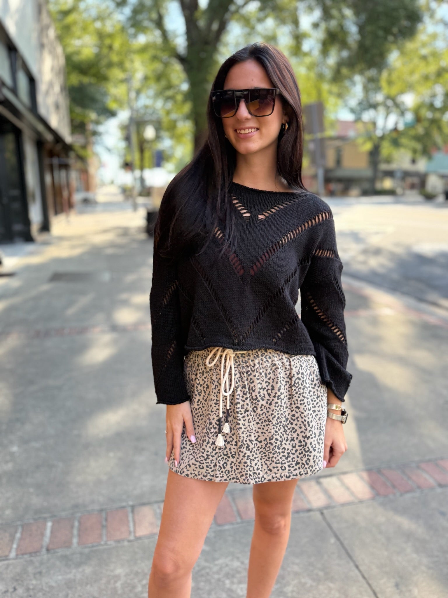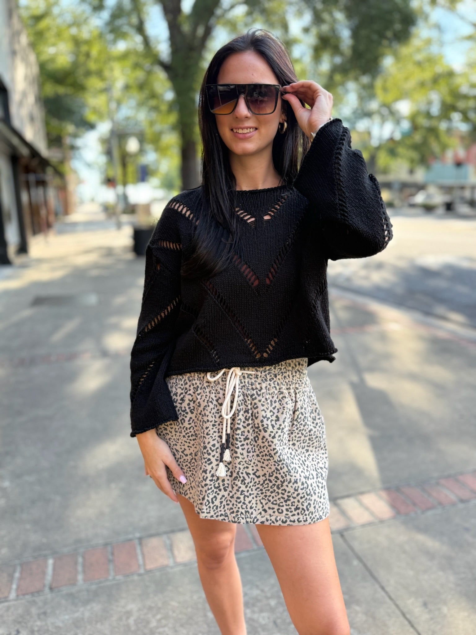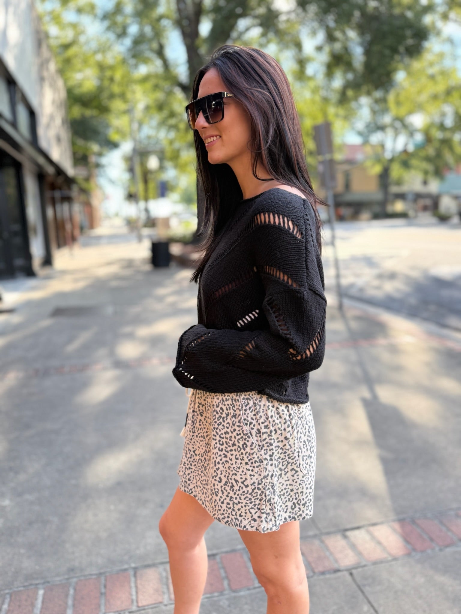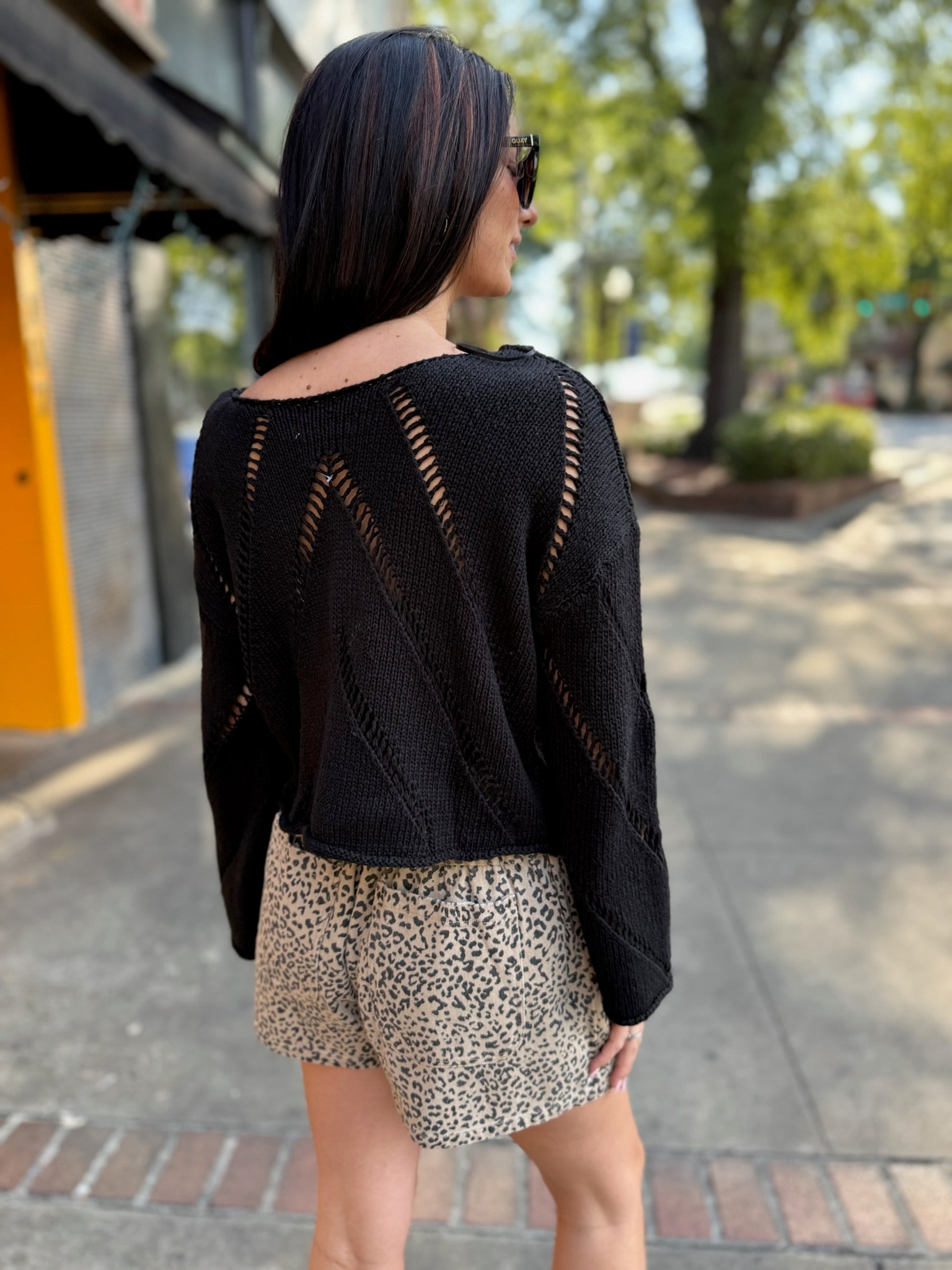 The Distressed Midnight Chevron Sweater is a chic blend of cozy and edgy. Crafted in a soft black knit, it features bold chevron-patterned openwork and lightly frayed detailing for that perfectly worn-in look. The relaxed, slightly cropped fit pairs effortlessly with high-waisted jeans, skirts, or layered over slip dresses. Wide sleeves and a loose neckline add an easygoing vibe, making it the perfect statement knit for day-to-night styling.