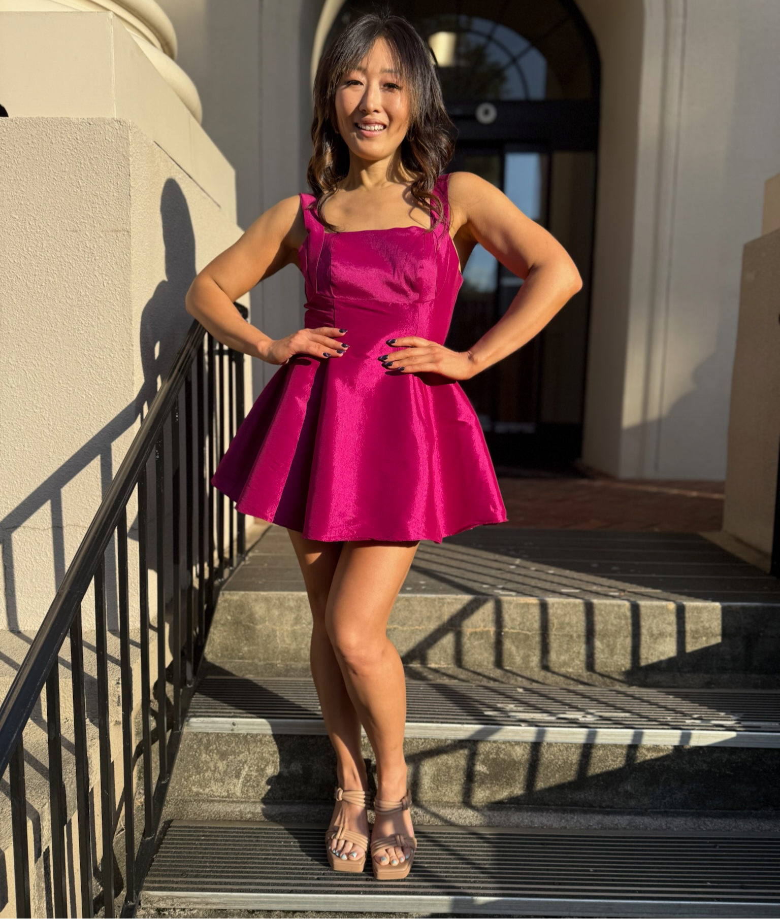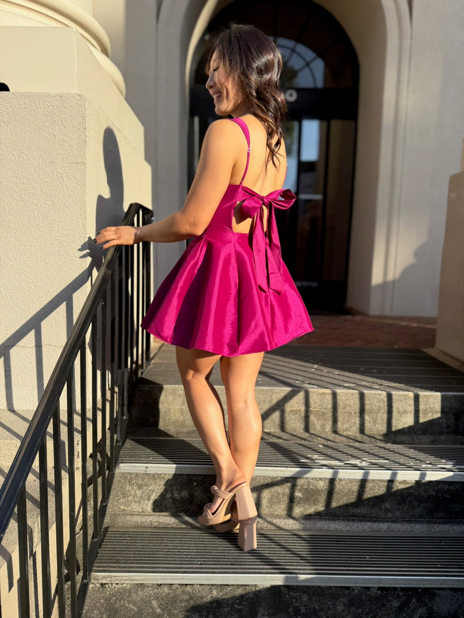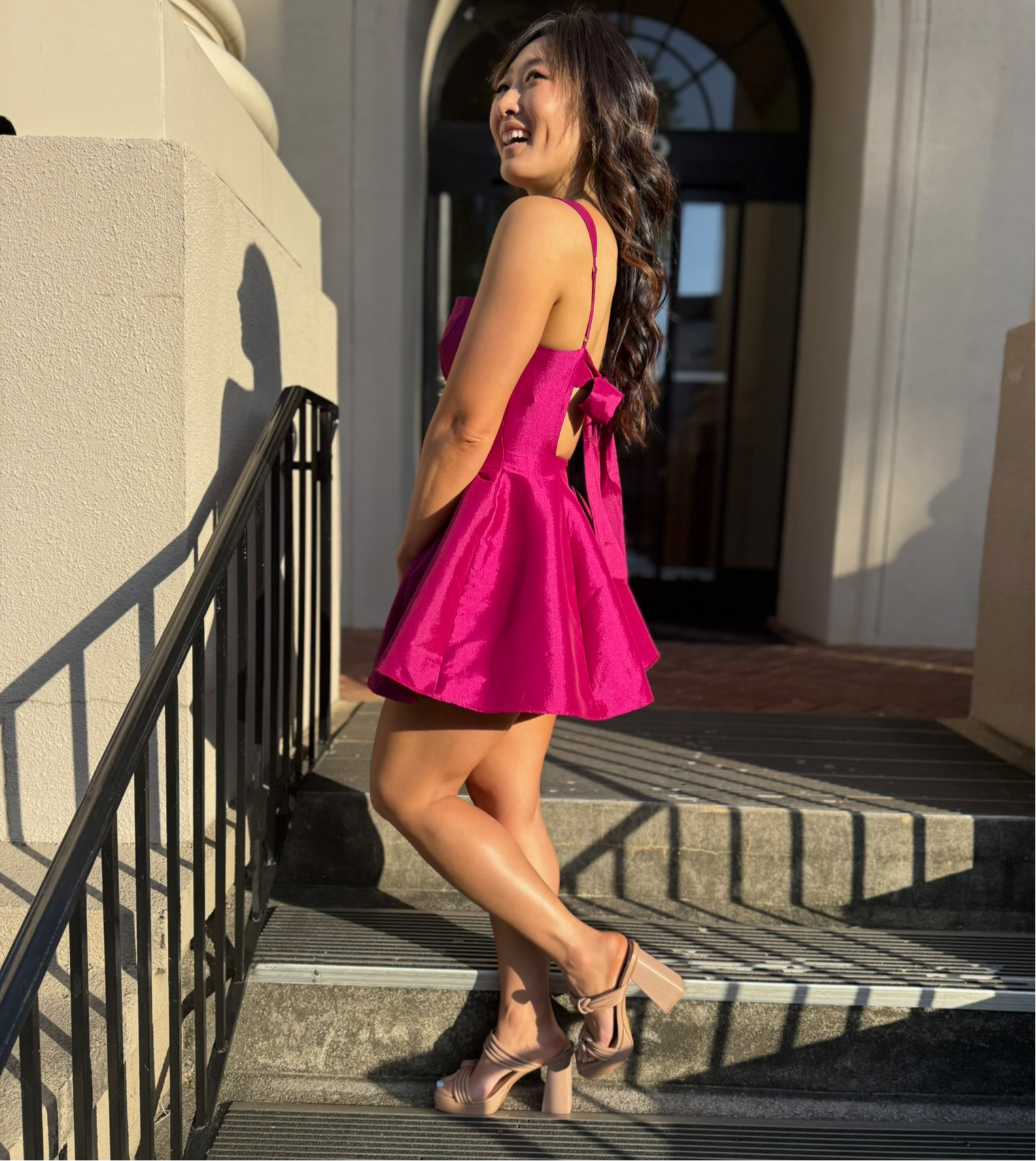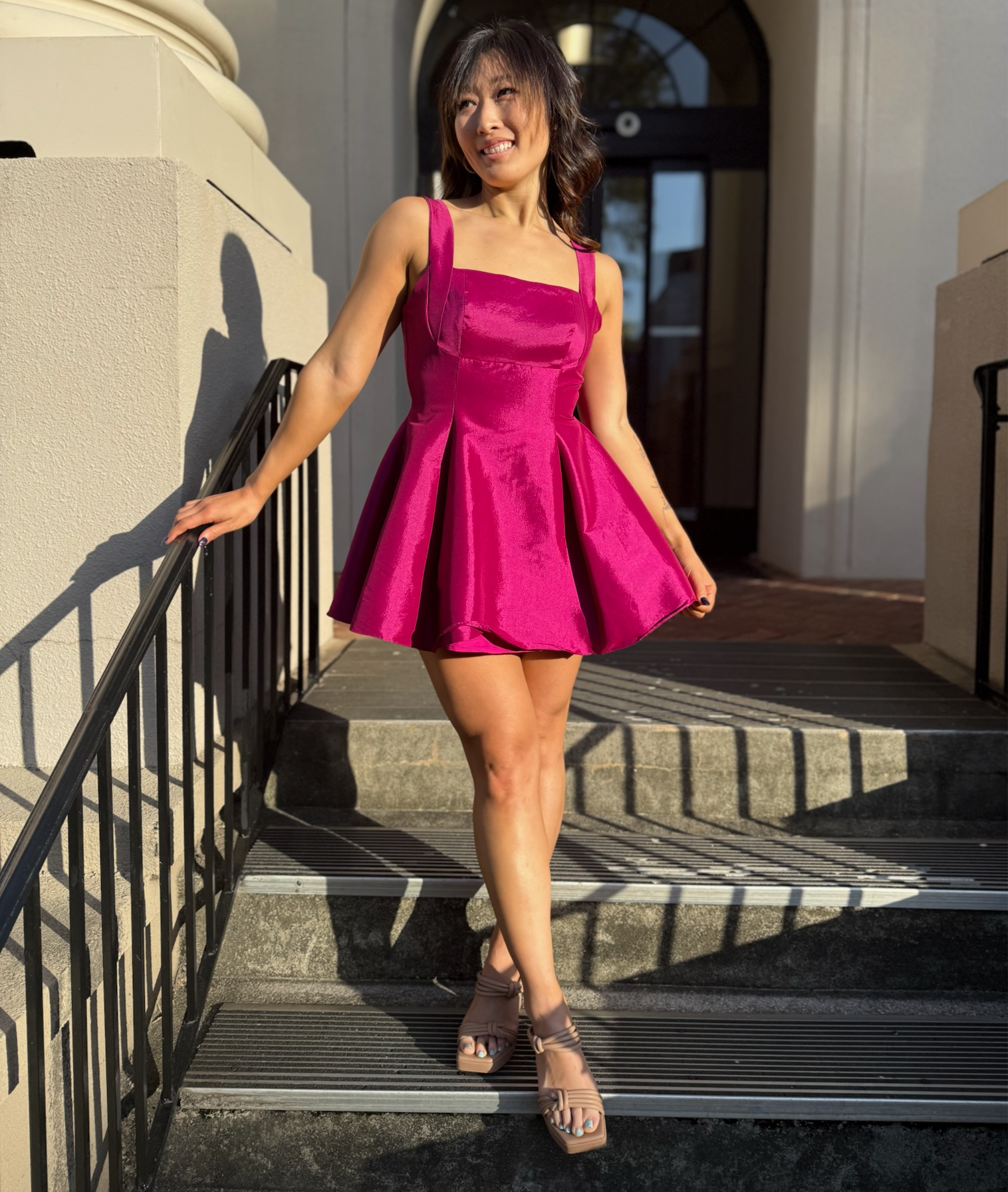 This flirty skater mini dress features a playful back cutout that adds a modern twist to a classic silhouette. With a fitted bodice and a flowy, twirl-worthy skirt, it's perfect for any occasion. The lightweight fabric ensures comfort and ease, while the subtle detailing at the back makes a statement, turning heads from every angle. Ideal for day-to-night looks.