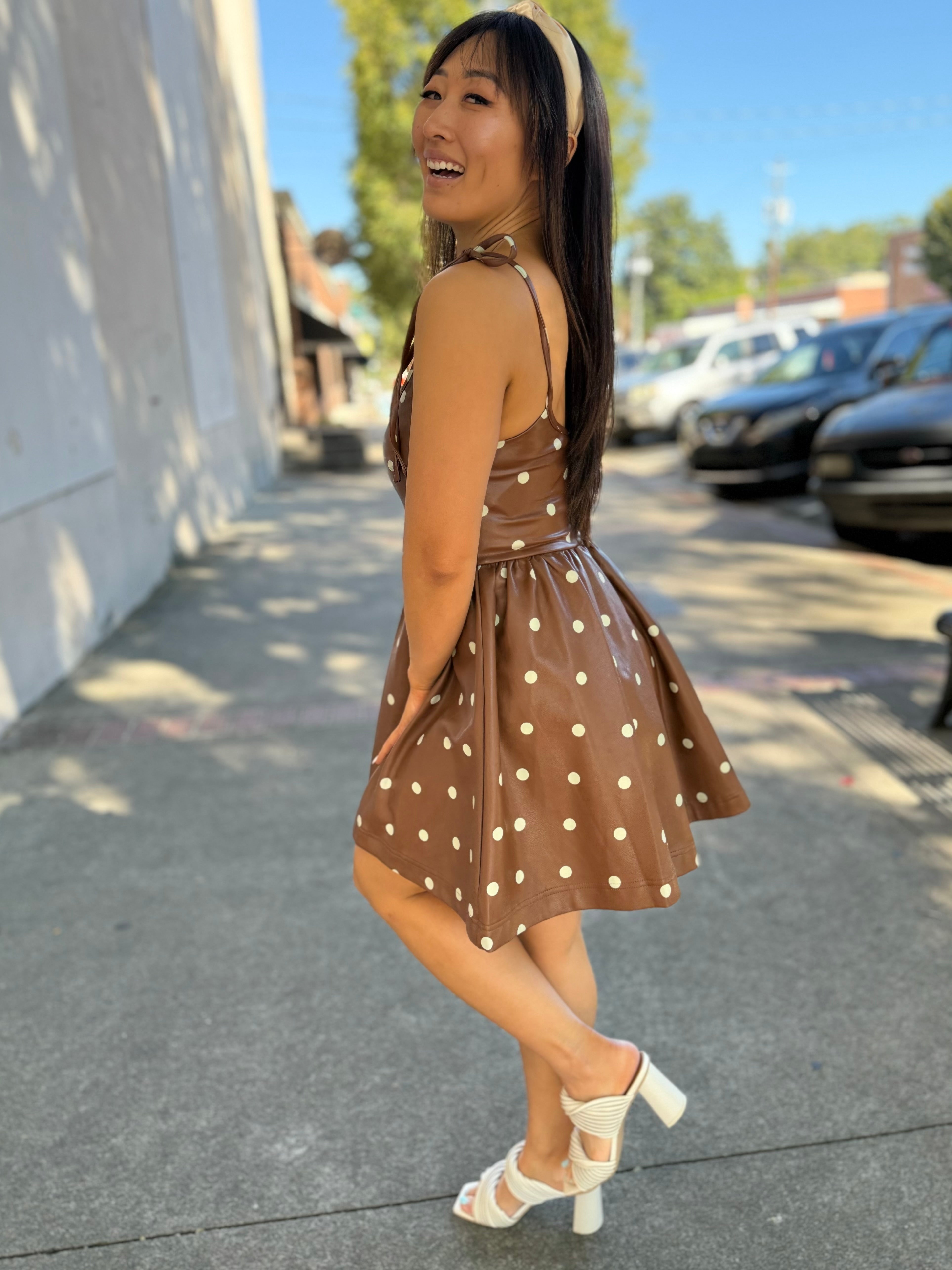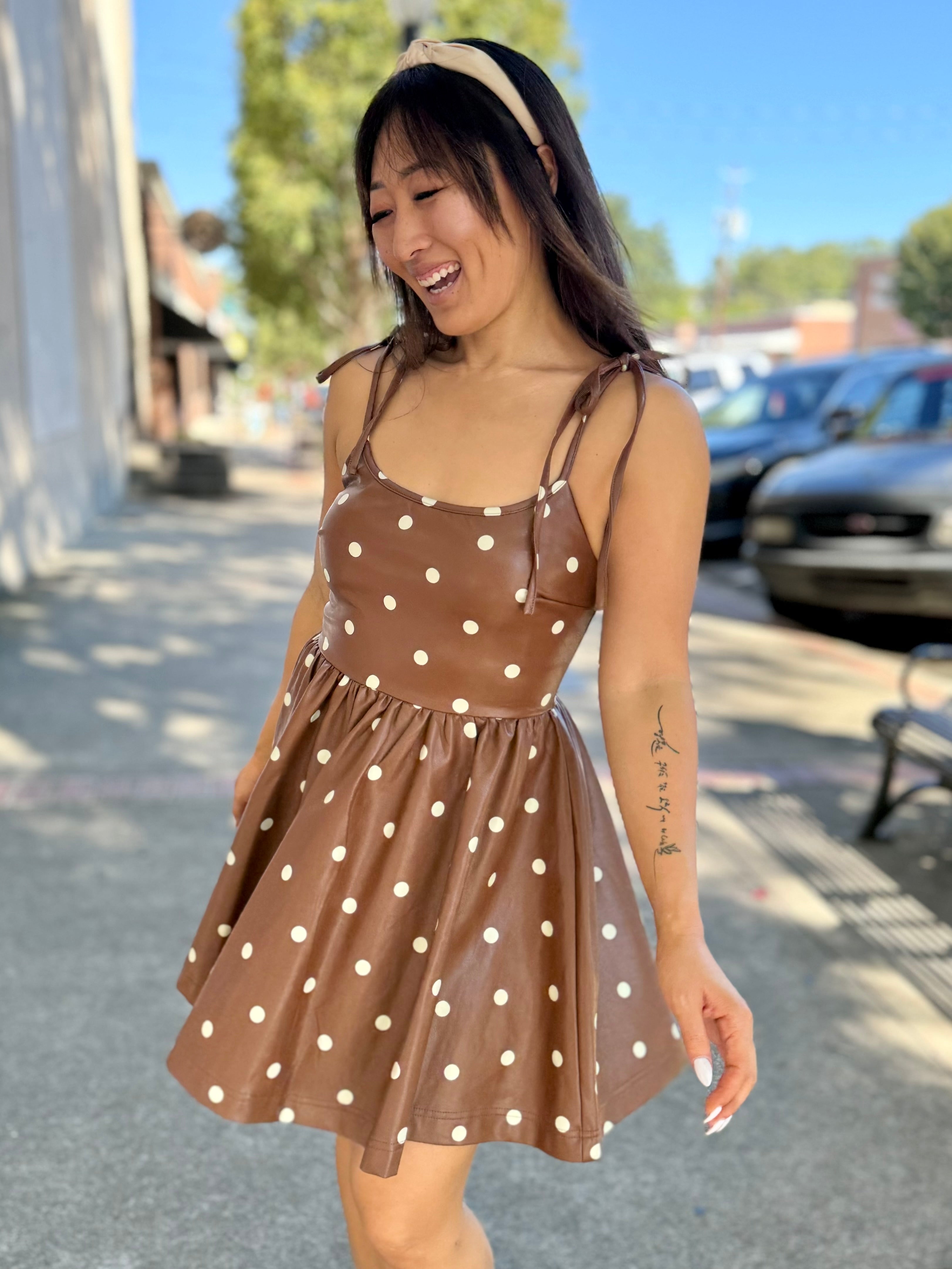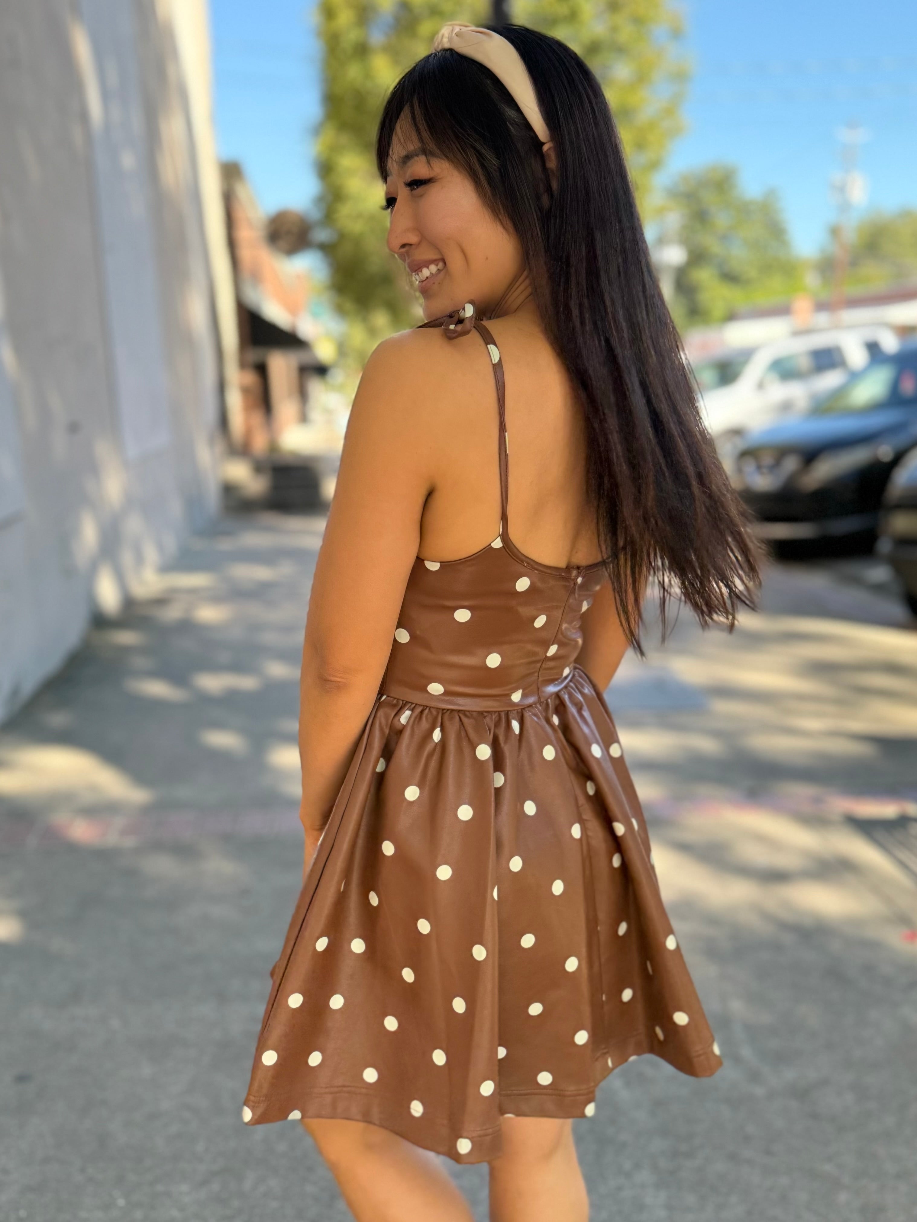 Make a statement in this Faux Leather Polka Dot Flared Mini Dress, featuring playful straps that tie into charming bows. With a sleek zipper back closure, this dress combines edgy faux leather with a fun polka dot print, creating the perfect mix of flirty and fierce. Ideal for nights out or special events, this mini dress is sure to turn heads!