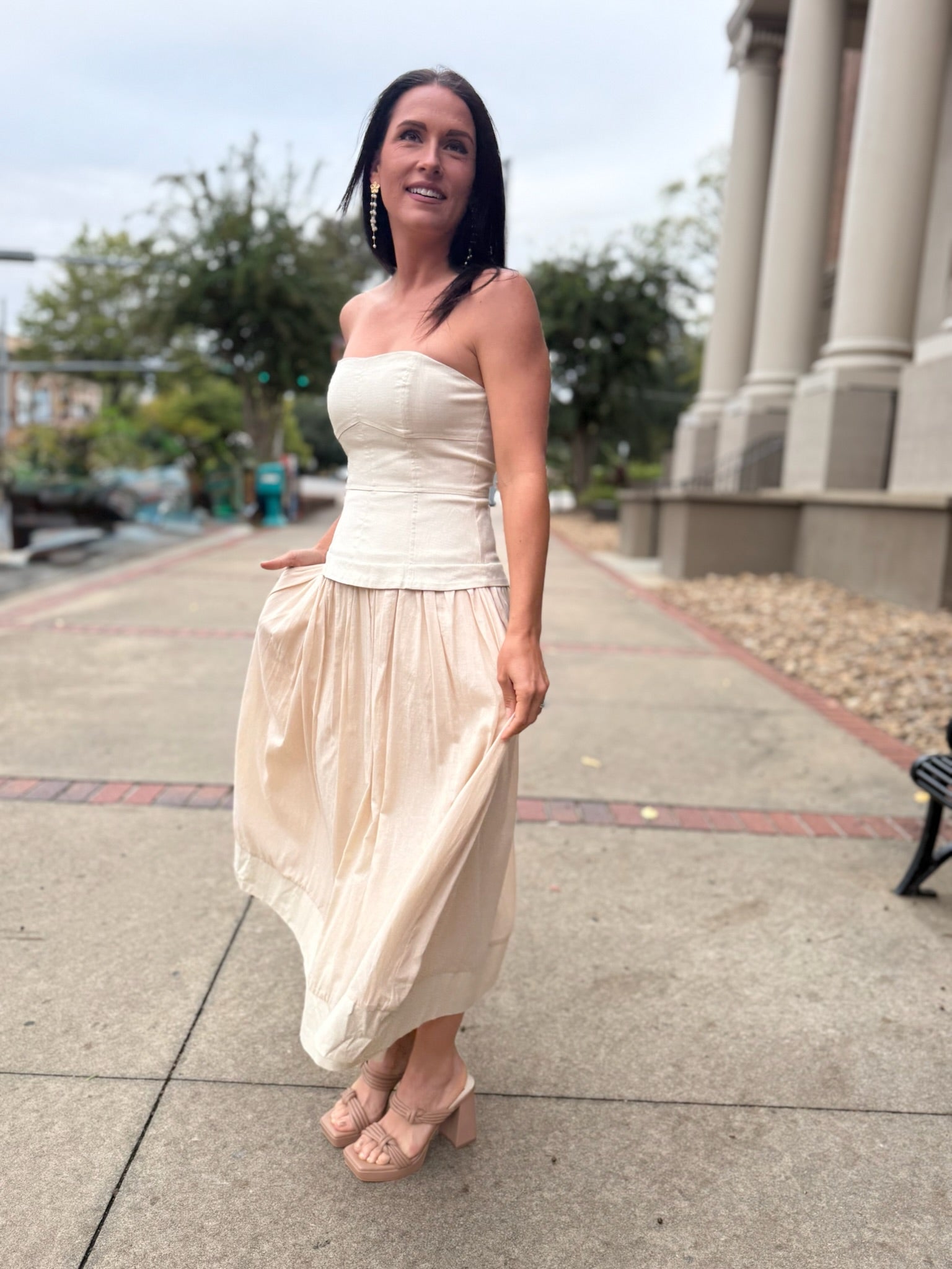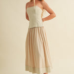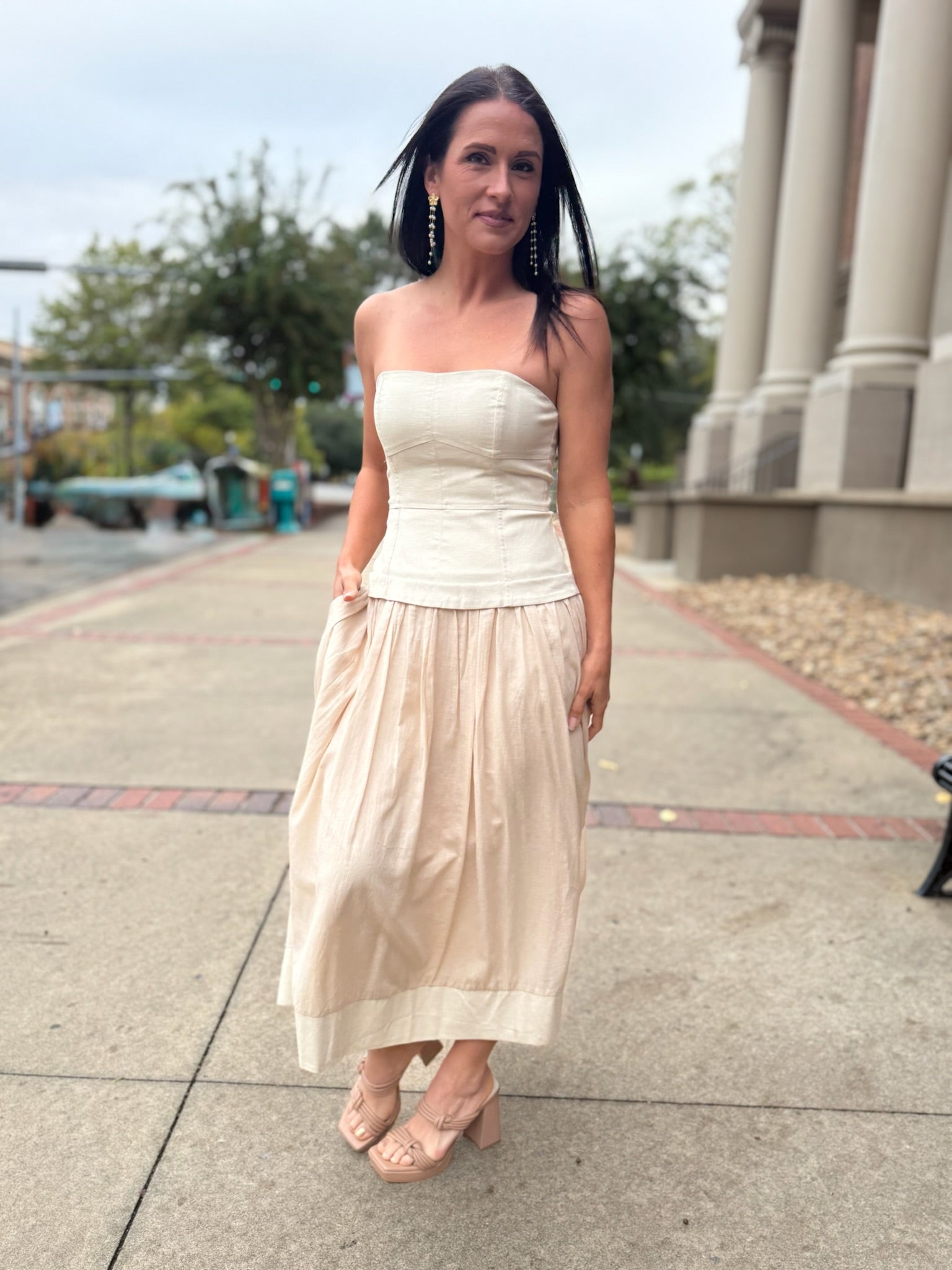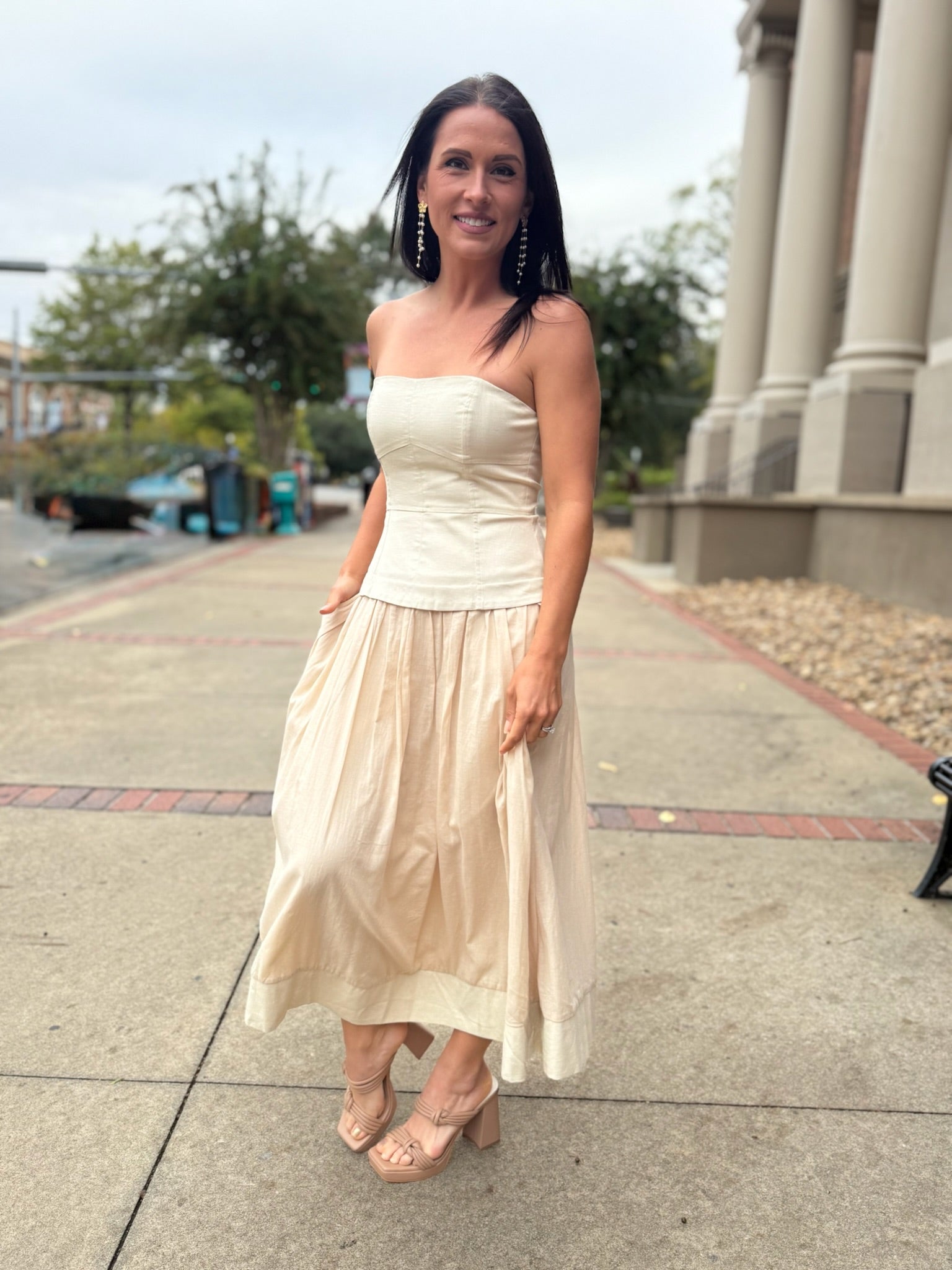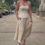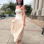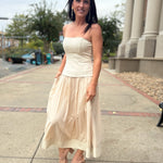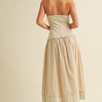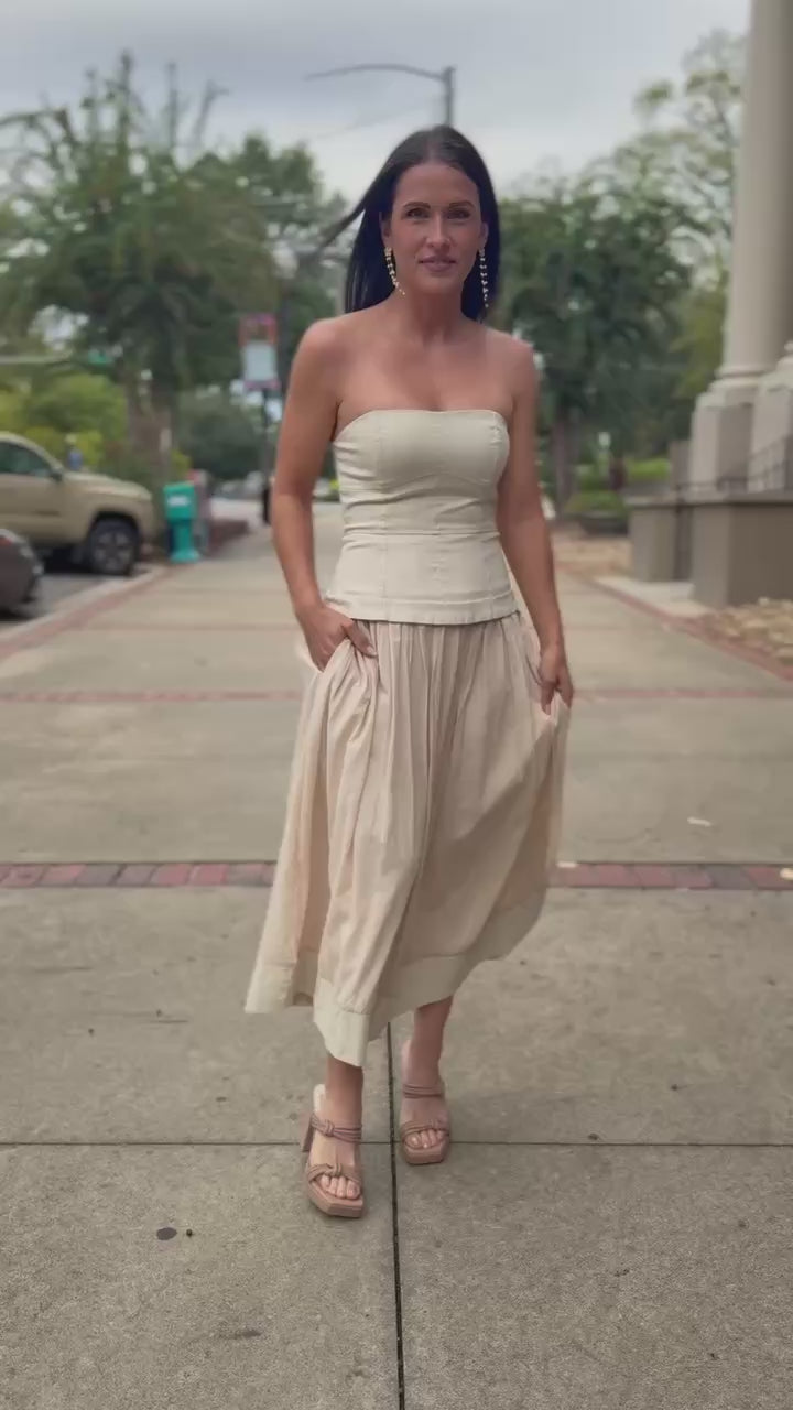 Effortlessly elegant, this strapless dress features a structured corset-style bodice that flatters and defines the silhouette. The soft ecru hue and full-lined skirt bring a touch of romance, while the strapless neckline adds modern sophistication. Perfect for garden parties, weddings, or any occasion that calls for timeless femininity, this piece combines grace and comfort in one.