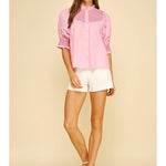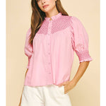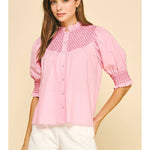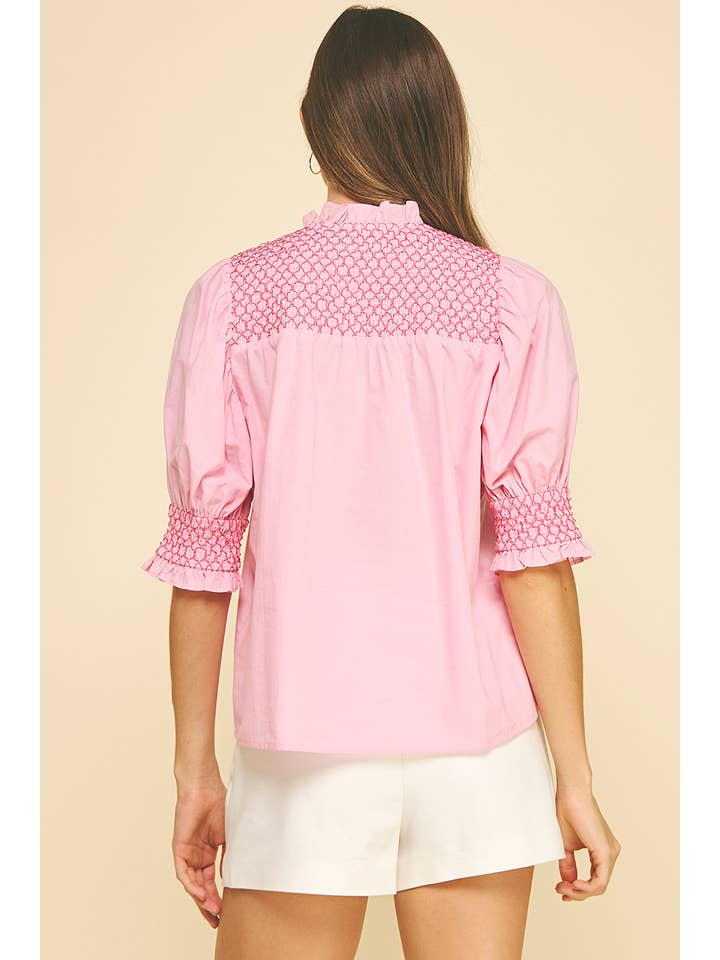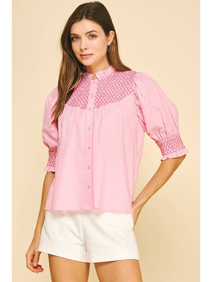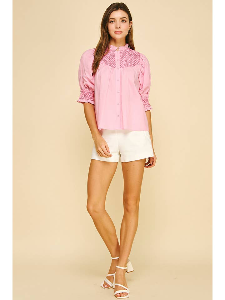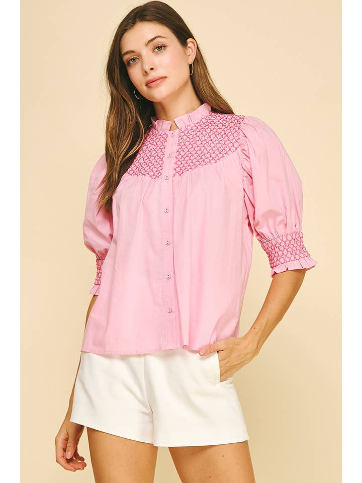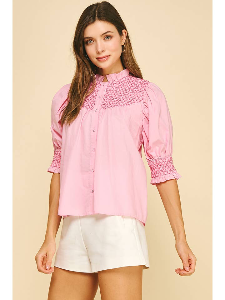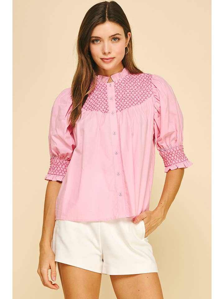 Elevate your everyday look with this beautifully detailed embroidered button-down blouse. Designed with delicate stitch detailing across the bodice, it features soft ruffle accents at the neckline and cuffs for a feminine finish. The voluminous balloon sleeves add effortless charm, while the classic button-down front keeps the look polished and versatile. Easy to dress up or down, this blouse pairs perfectly with denim, tailored pants, or skirts for a refined yet relaxed style.