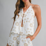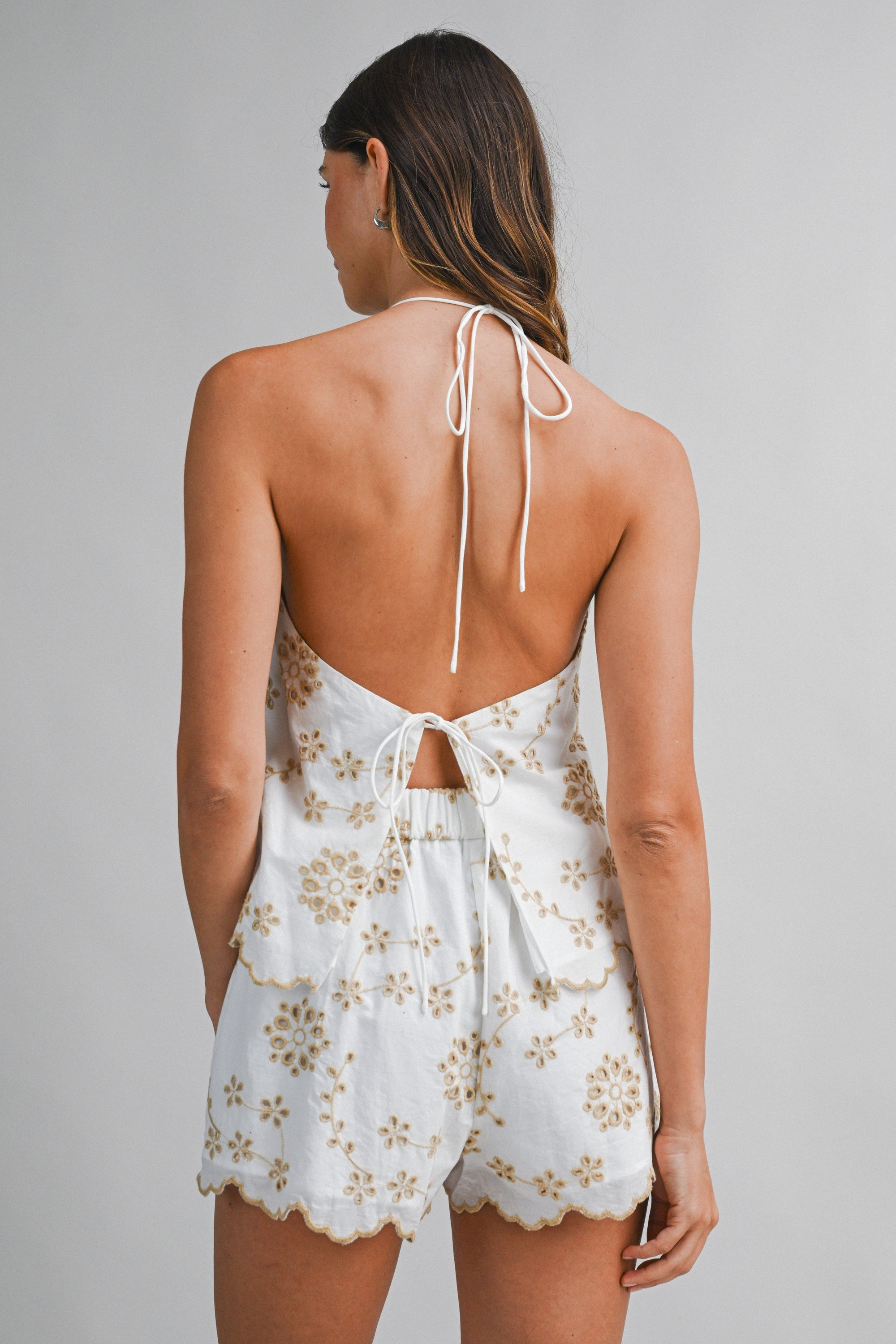 Delicate, feminine, and effortlessly chic, the Embroidered Eyelet Halter Neck Top is your perfect warm-weather statement. Designed with intricate eyelet embroidery throughout, this top features a flattering halter neckline with adjustable self-tie closures at the front and back for a customizable fit. The open-back detail adds a touch of allure, while the scalloped hemline enhances its romantic finish. The coordinating Off White Embroidered Eyelet Shorts offer a polished silhouette with a side invisible zipper for a seamless look. Perfect for vacations, brunch dates, or summer events, this set blends comfort and elegance beautifully.