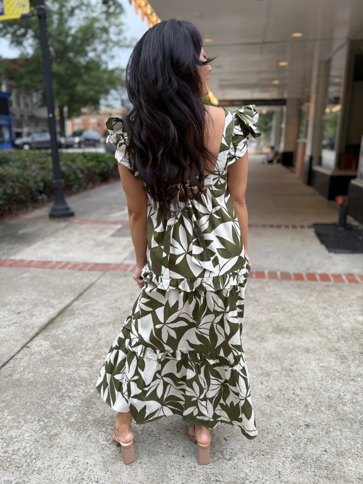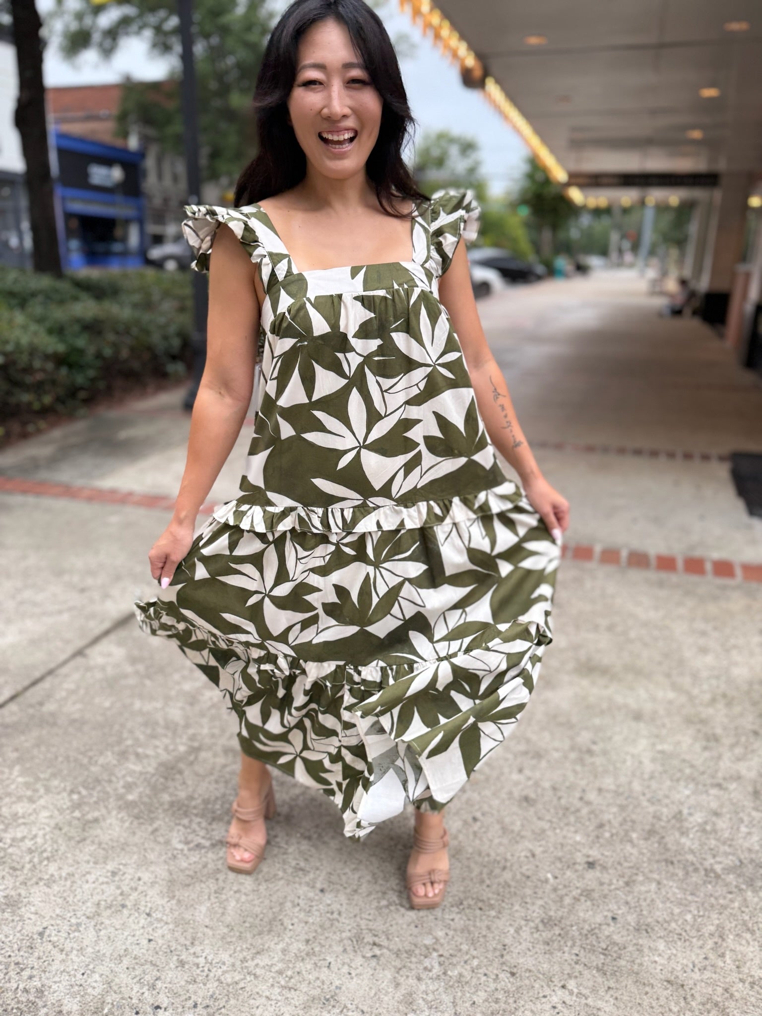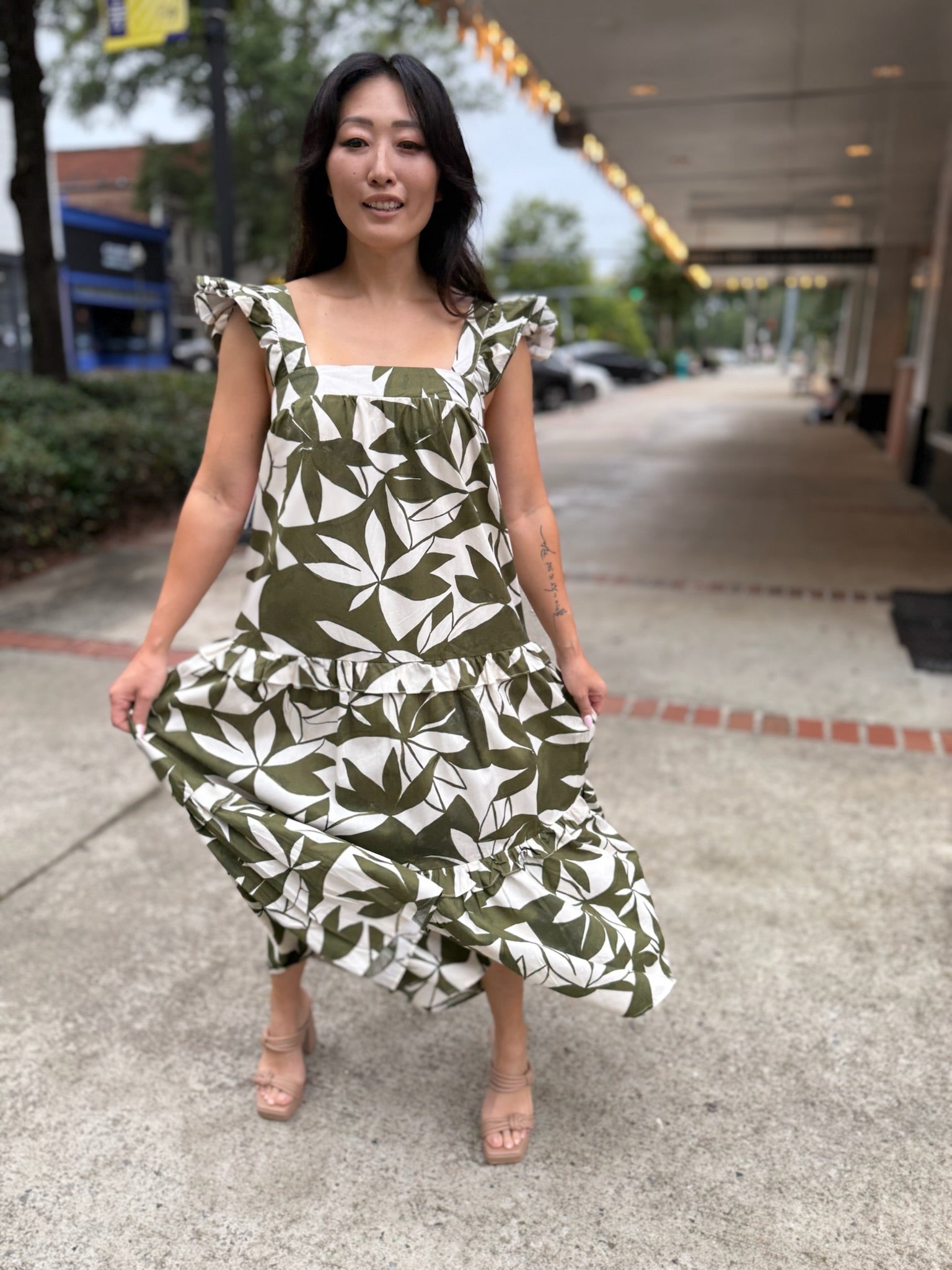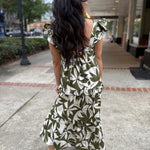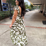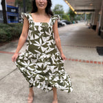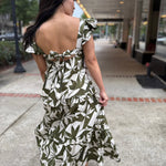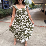 This dress is a leafy dream come to life, featuring an eye-catching green and cream print that brings serious tropical vibes. The square neckline and fluttery ruffle straps add a playful twist, while the tiered skirt delivers that floaty, feminine silhouette we all love.