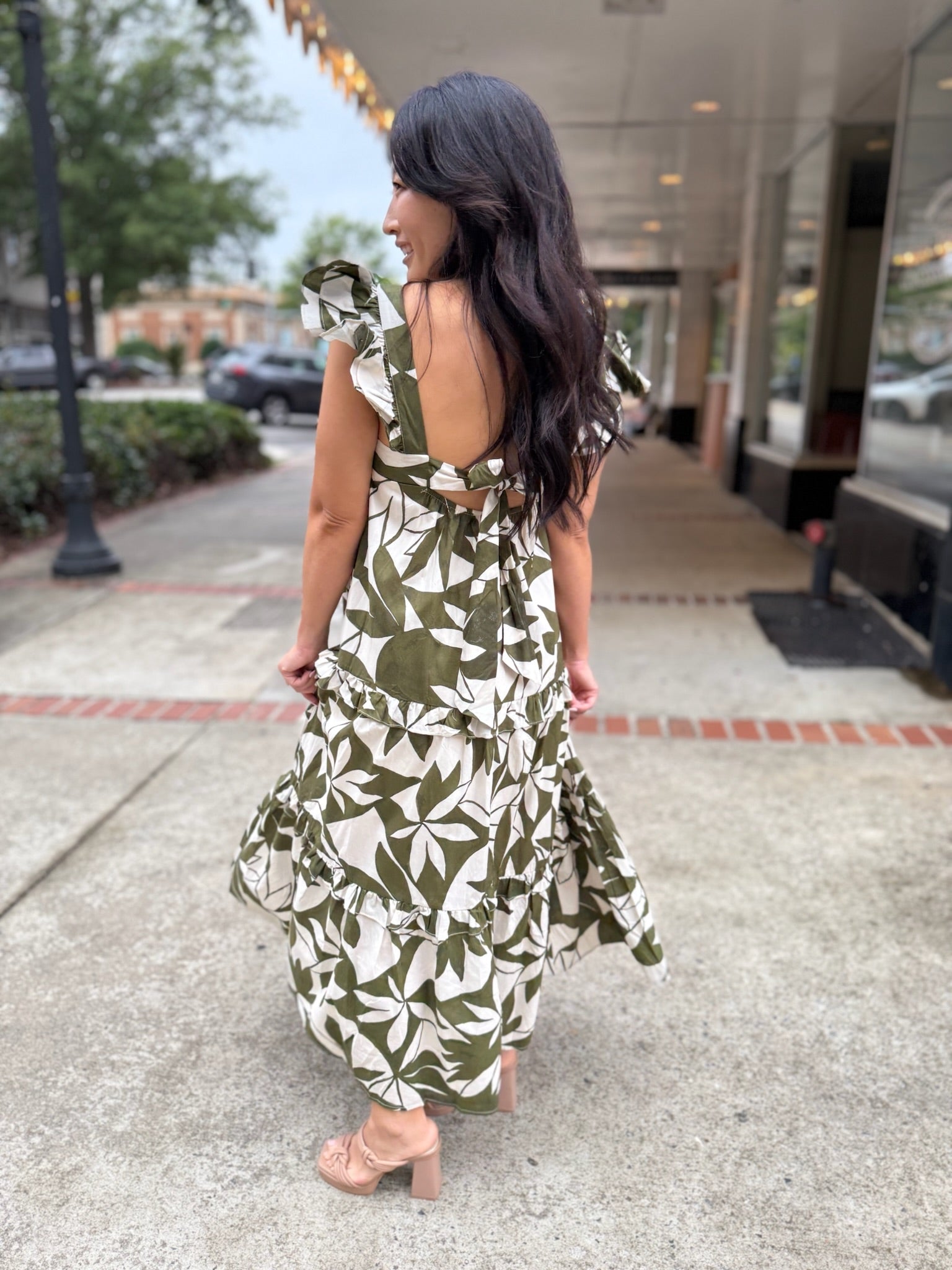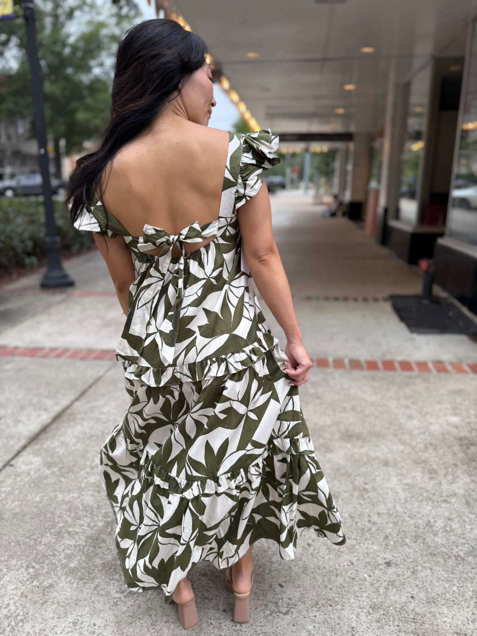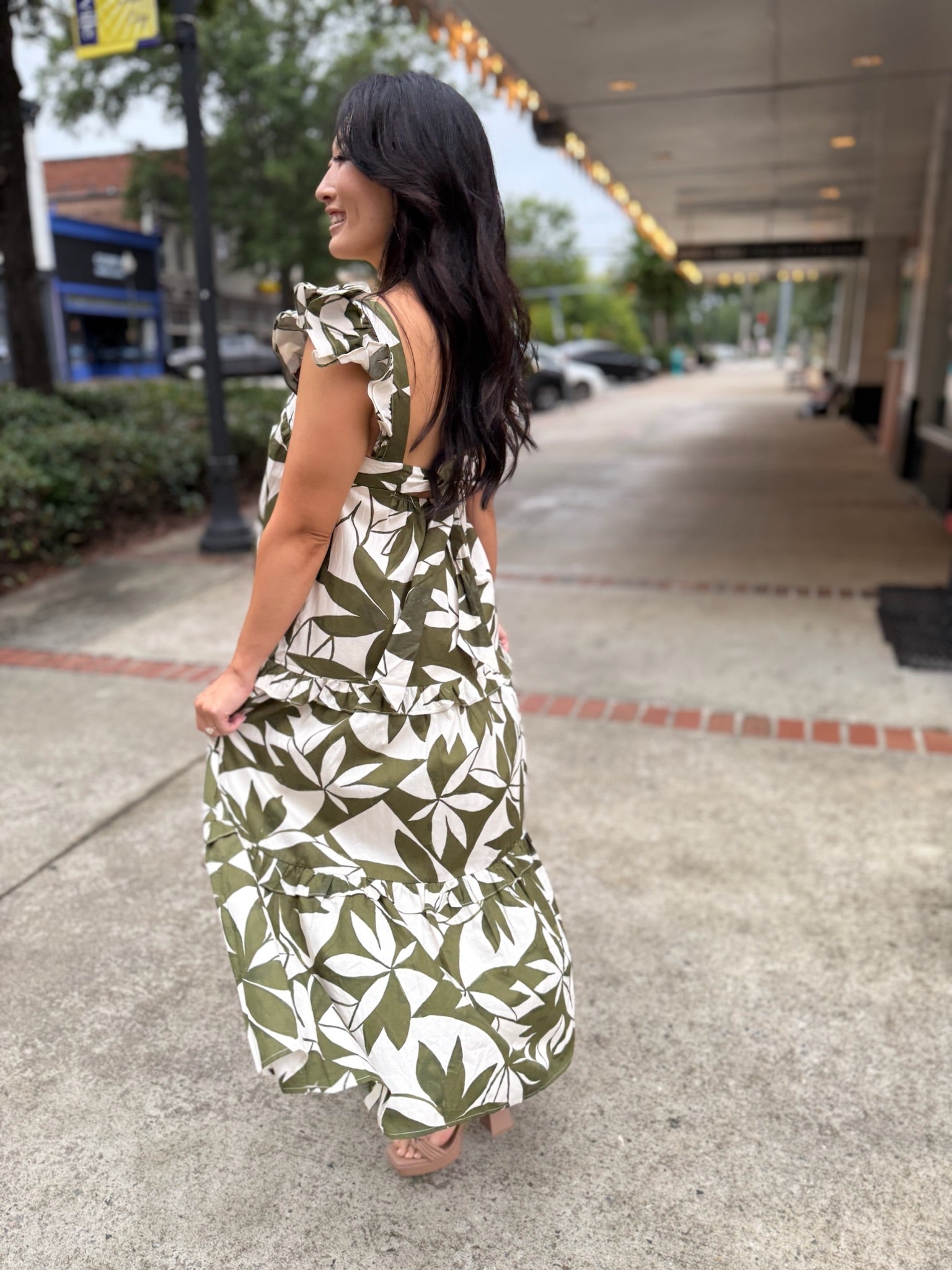 This dress is a leafy dream come to life, featuring an eye-catching green and cream print that brings serious tropical vibes. The square neckline and fluttery ruffle straps add a playful twist, while the tiered skirt delivers that floaty, feminine silhouette we all love.