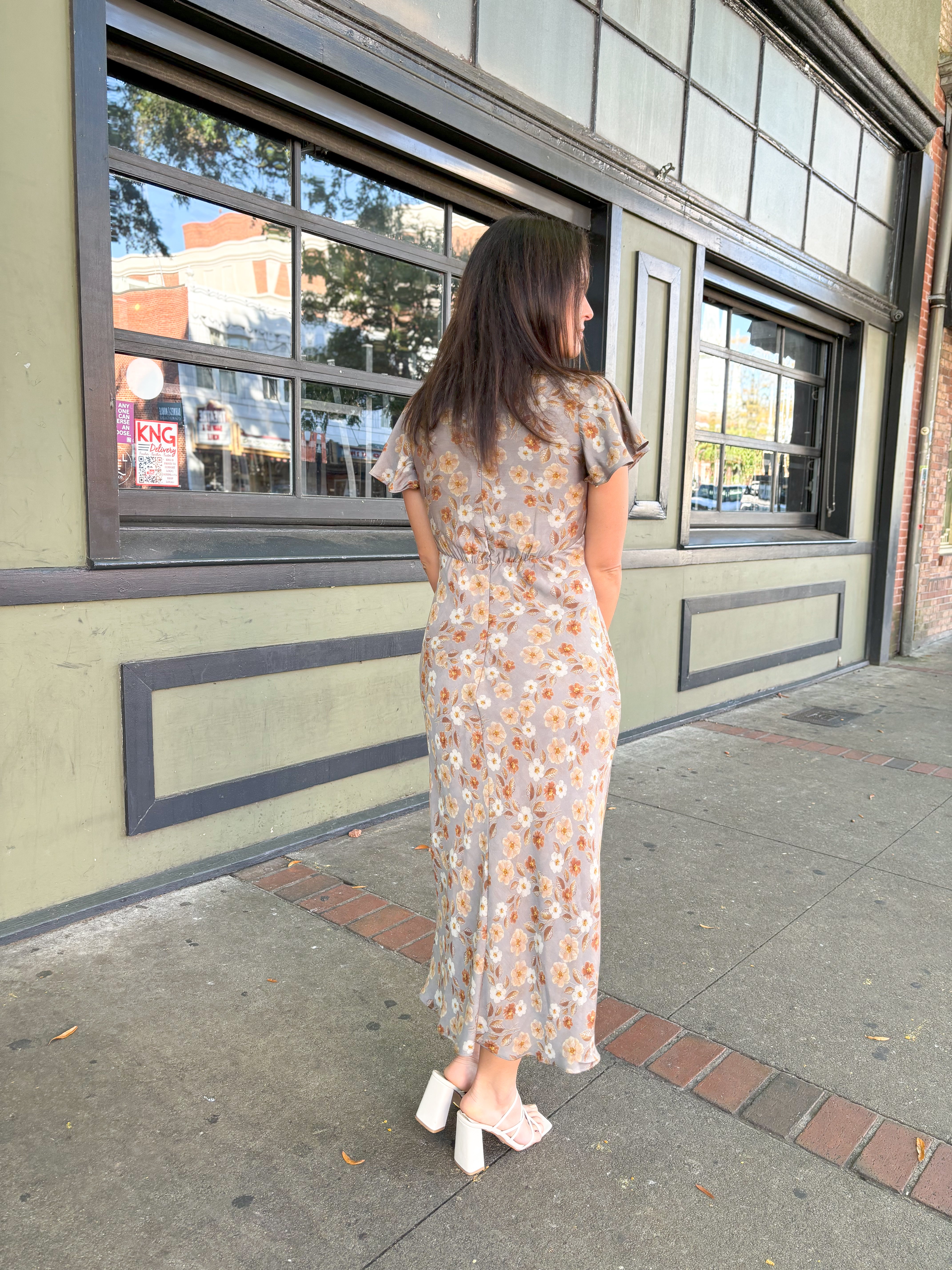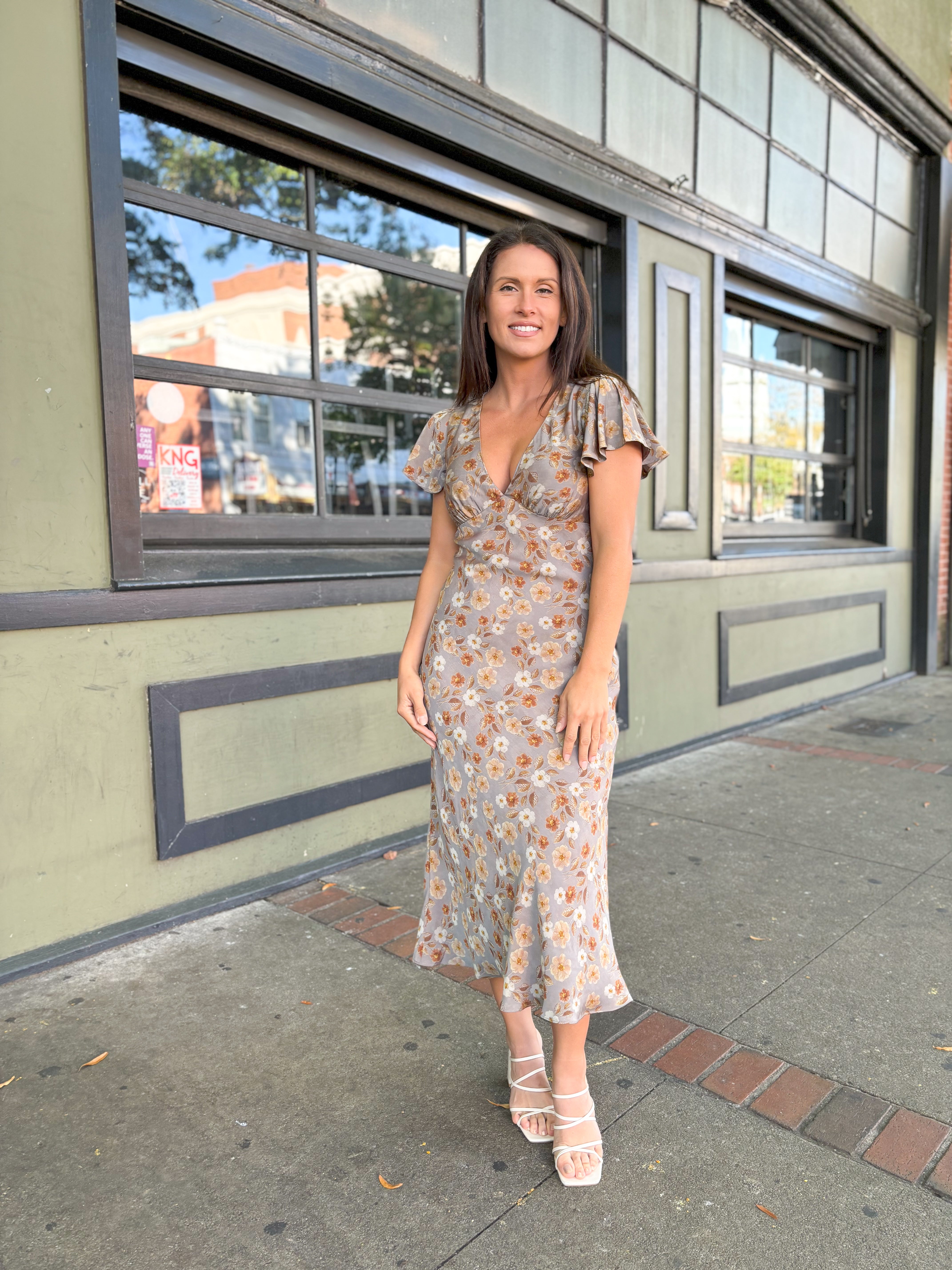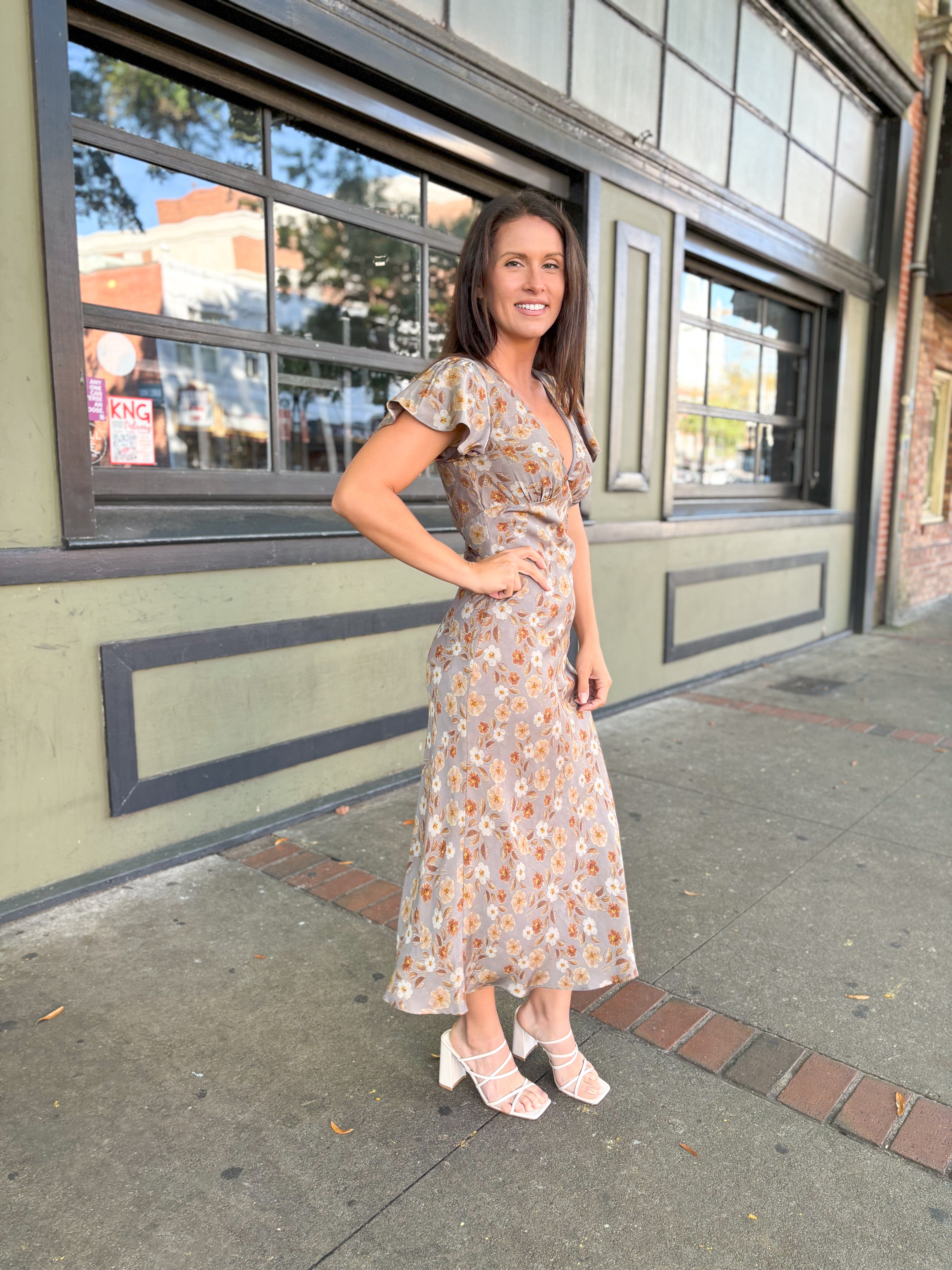 Turn heads in our stunning Brown Floral Fitted Midi Dress! Featuring a deep V neckline, flattering short angel sleeves, and a gathered bust for a feminine touch. The empire waist and fitted silhouette create an effortlessly chic look, while the back invisible zipper ensures a seamless fit. Perfect for any occasion!