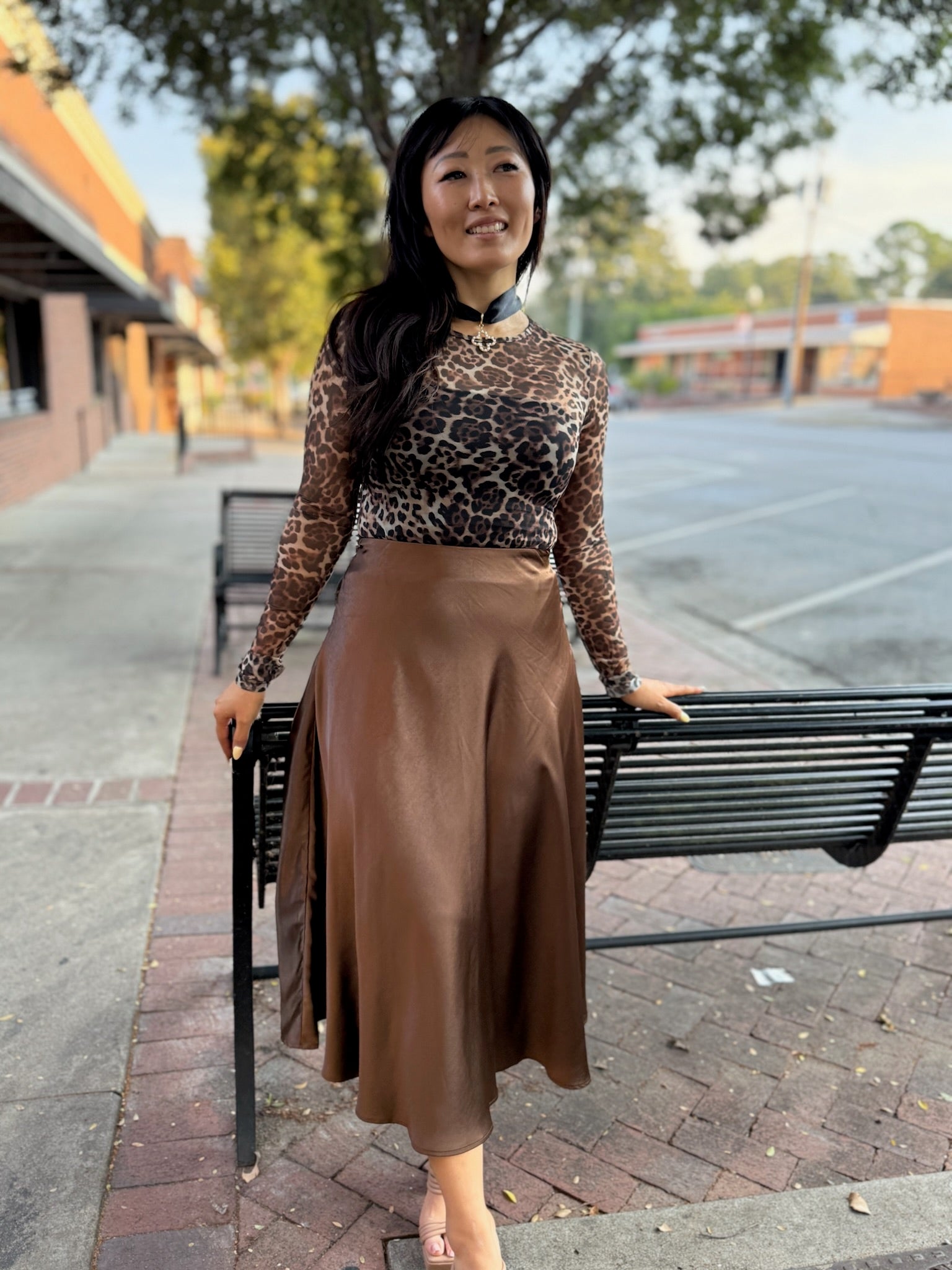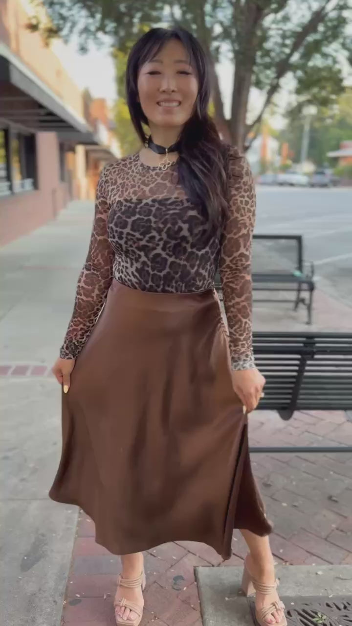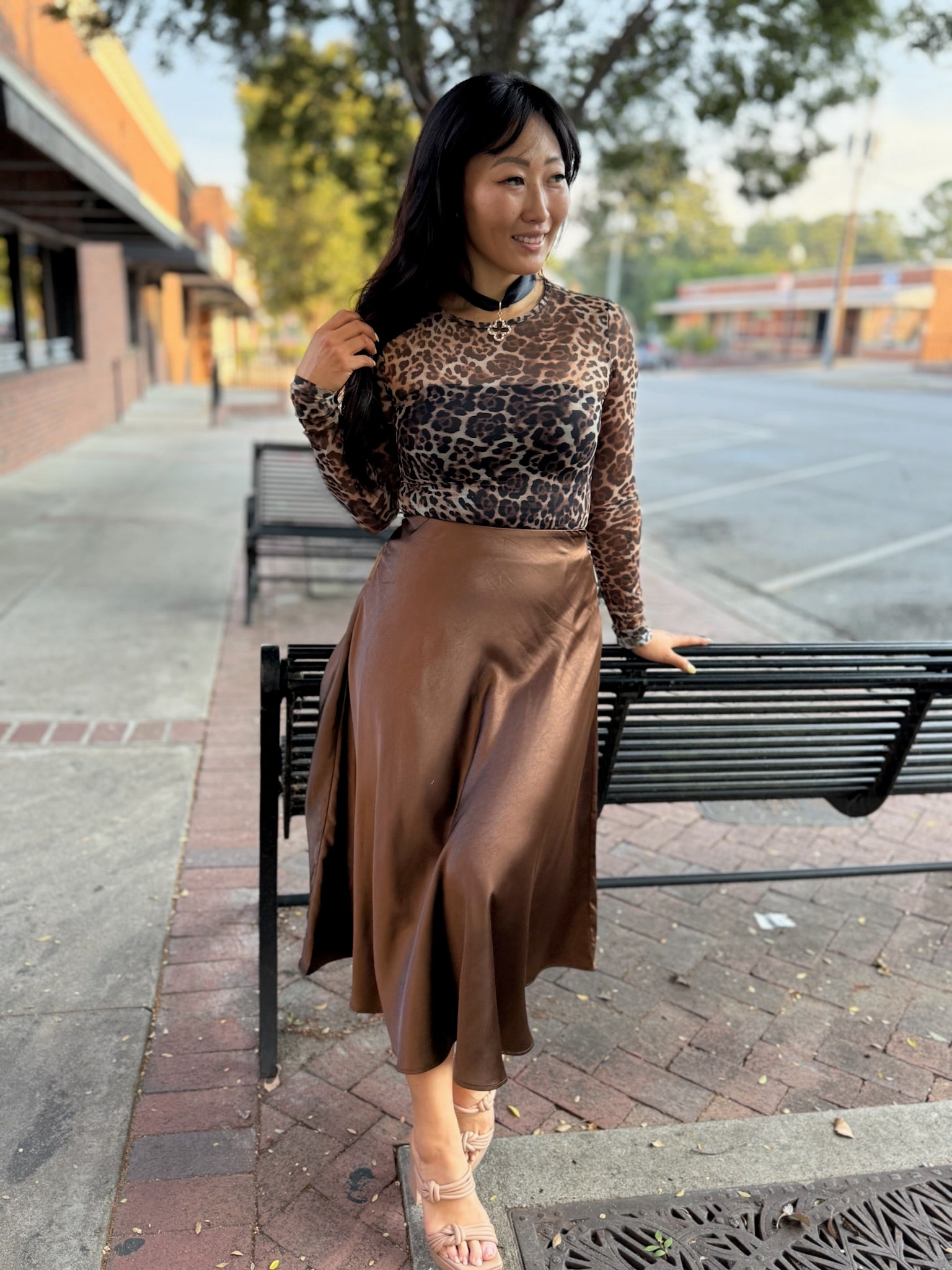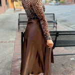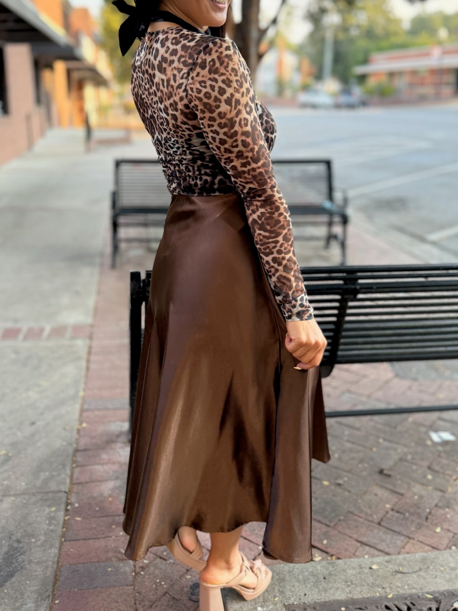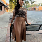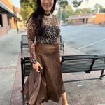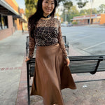 Classic and feminine, the Espresso Flare Skirt is a timeless piece designed to flow effortlessly with every step. Crafted in a rich espresso hue, this midi-length skirt features a soft, fluid drape that flatters the silhouette while adding movement and elegance. Perfect for pairing with cozy knits, sleek blouses, or statement outerwear, it transitions seamlessly from daytime sophistication to evening chic.