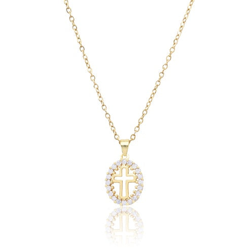 Embrace elegance and meaning with the Eternal Grace Waterproof Cross Necklace. This stunning piece features a gold stainless-steel chain (16"-18") with a radiant oval pendant—framed in shimmering rhinestones and centered with a bold cross design. Built to be waterproof, it’s made for everyday wear so you can shine with style and faith wherever life takes you. A beautiful blend of durability and devotion, perfect for layering or wearing as your statement piece.