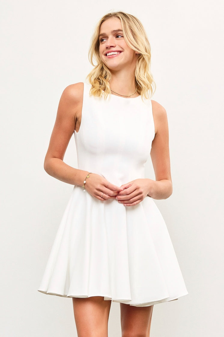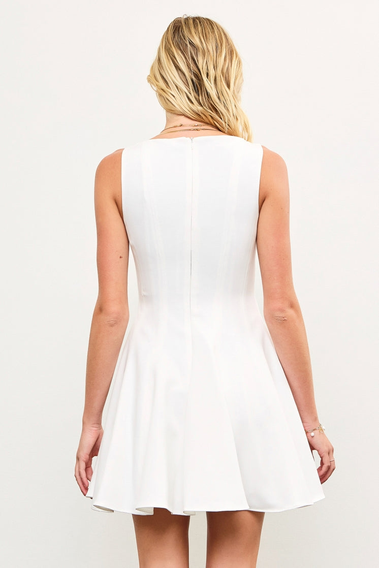 This off-white sleeveless swing dress exudes timeless elegance with a clean, minimalistic design. The fitted bodice gracefully transitions into a flowy, flared skirt, creating a flattering A-line silhouette. Seam details add subtle structure, enhancing the dress's sophisticated yet playful movement. The soft, lightweight fabric makes it perfect for a variety of occasions, from casual daytime outings to more refined evening affairs.