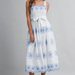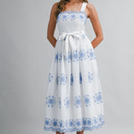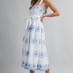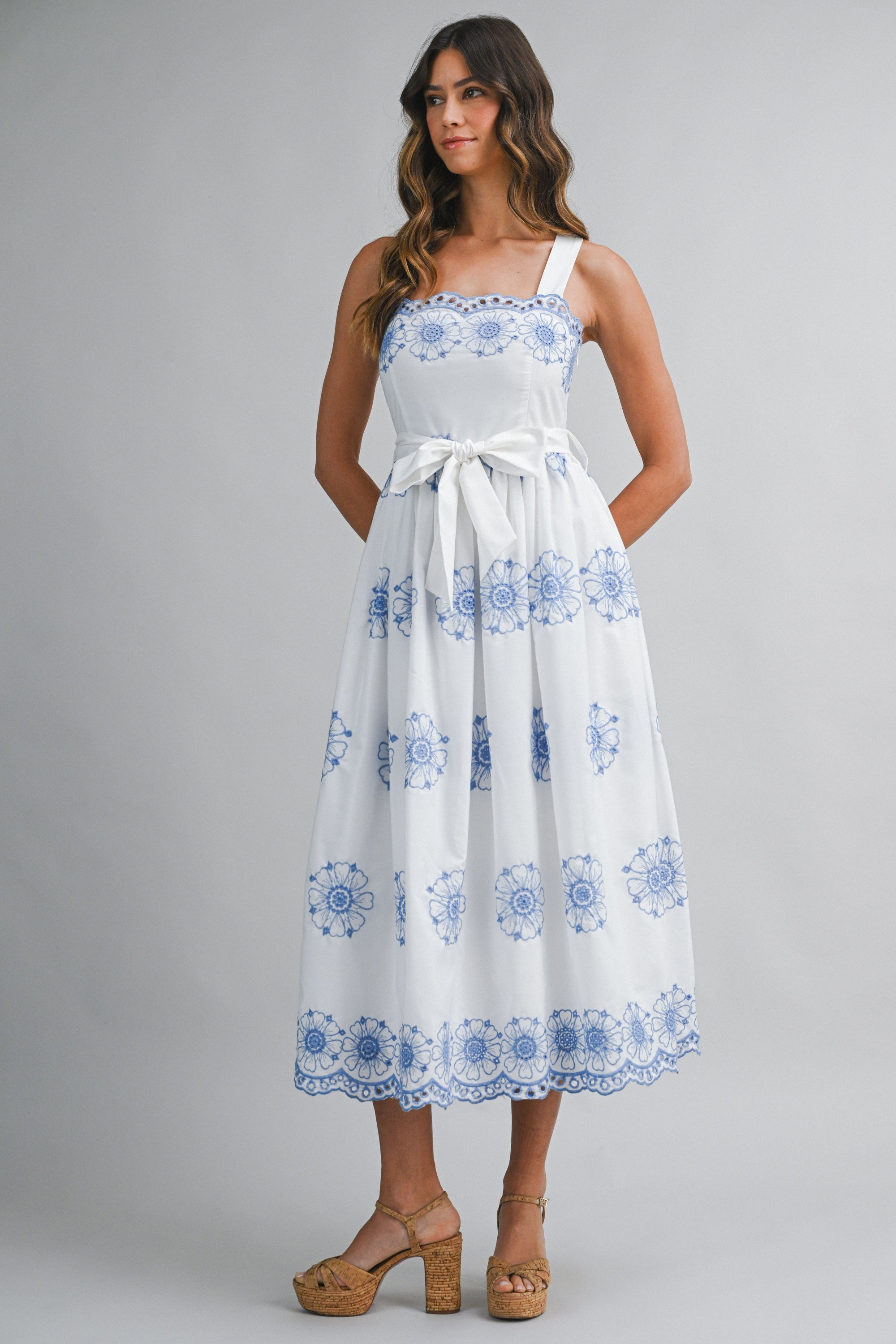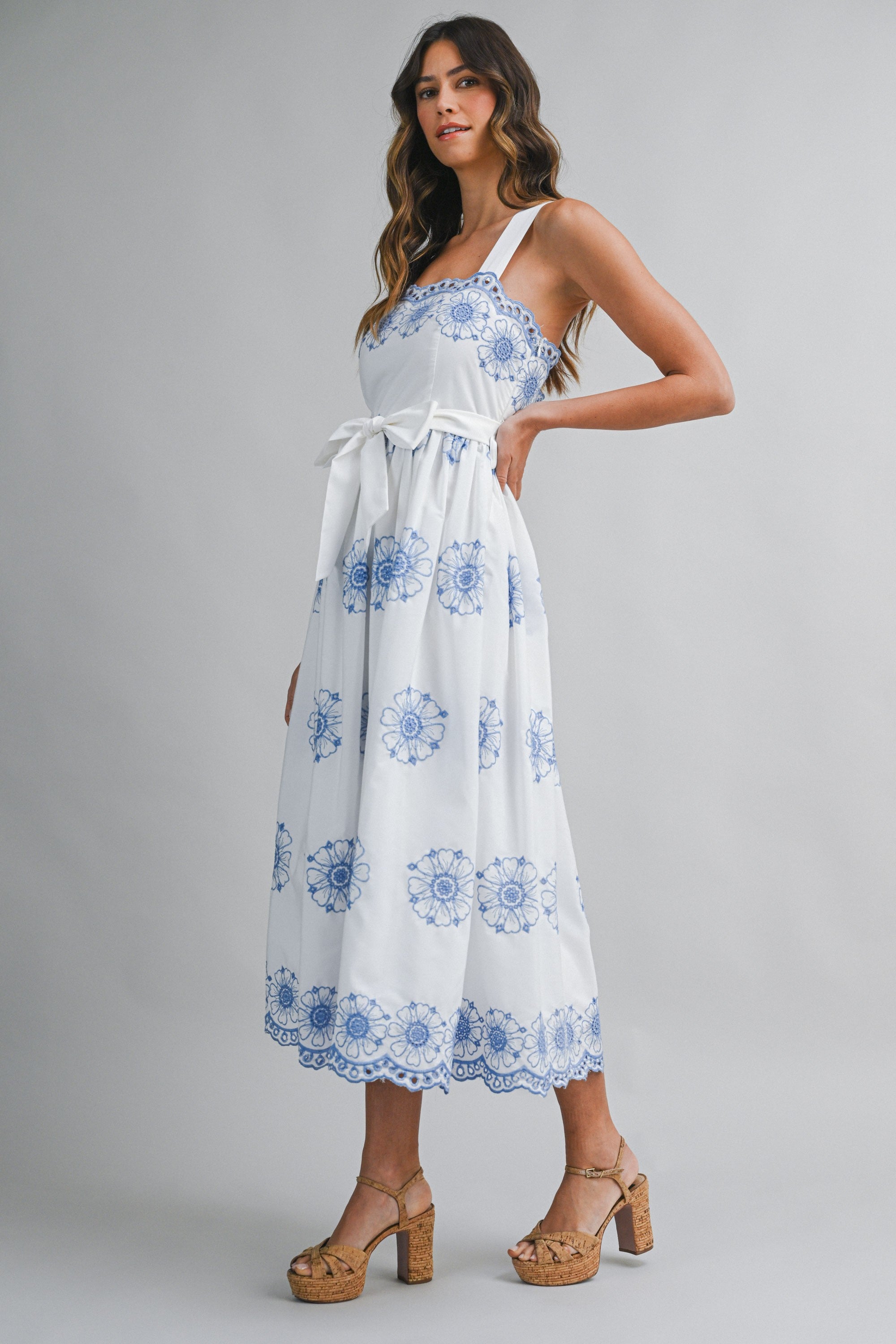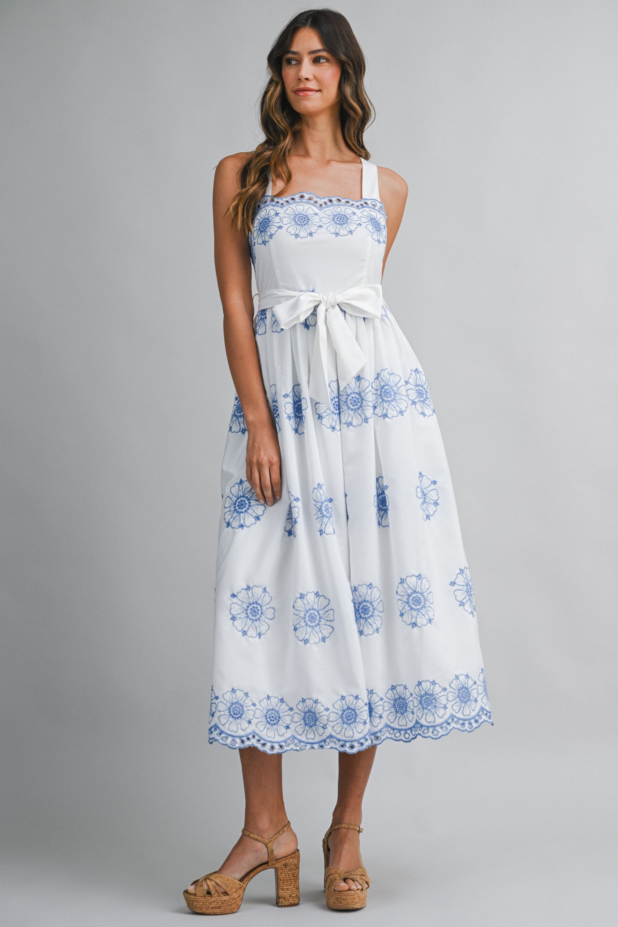 Graceful, feminine, and effortlessly polished, the Eyelet Embroidered Cross Back Strap Midi Dress is a timeless statement piece. Featuring delicate blue floral eyelet embroidery throughout, this woven midi silhouette blends classic charm with modern structure. The square neckline and wide shoulder straps create a flattering frame, while the cross-back detail adds a refined, eye-catching touch. A fitted bodice with a front self-tie waist enhances your shape, flowing into a softly flared midi skirt finished with an embroidered scalloped hem for a romantic finish. Perfect for brunches, garden parties, and special daytime occasions.