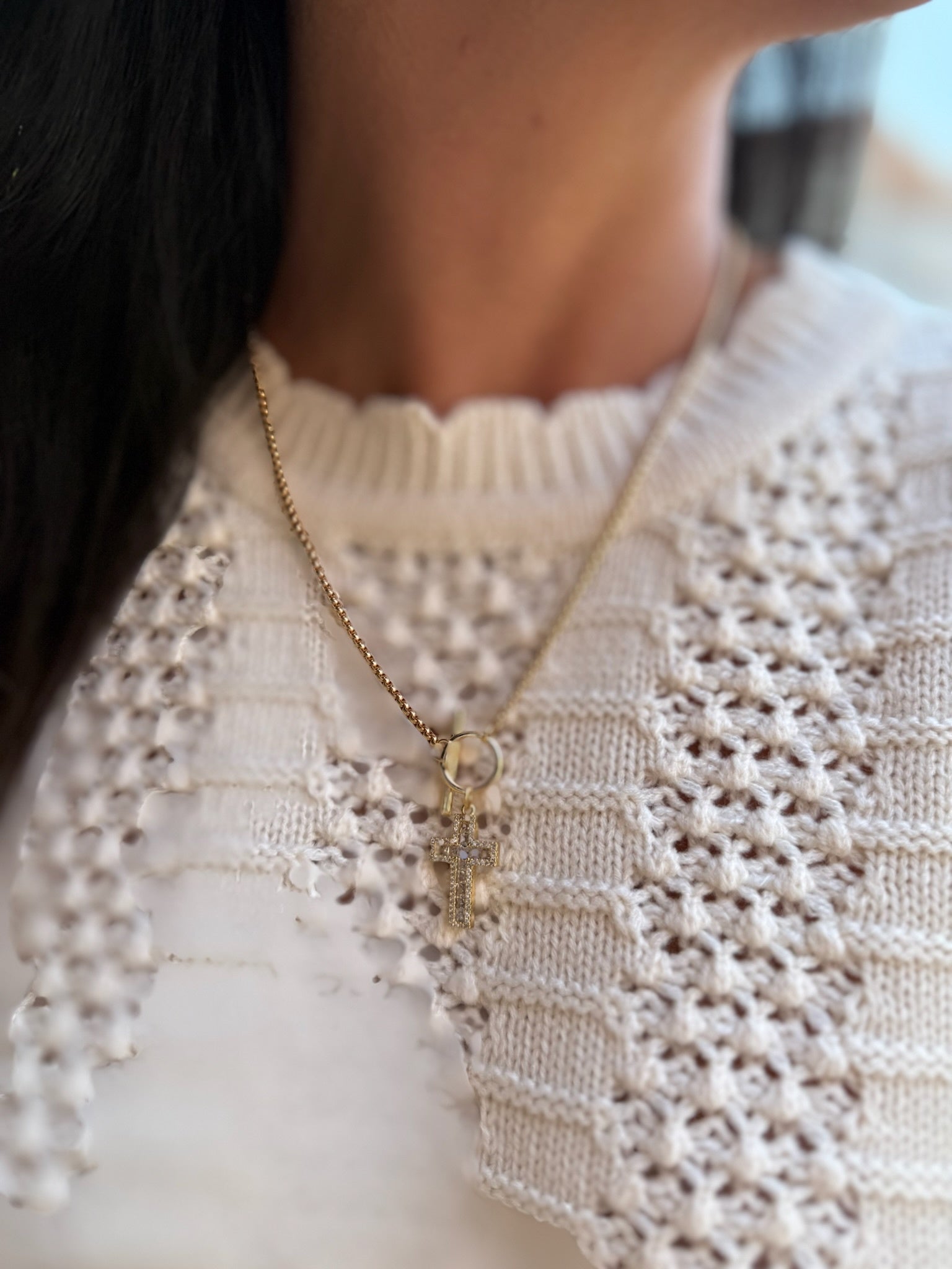Make a bold yet graceful statement with the Faith & Sparkle Rope Chain Necklace. Featuring a textured gold rope chain, a dazzling rhinestone cross charm, and a stylish toggle closure, this 16"-18" piece blends faith with fashion. Wear it solo or layered—either way, it’s a radiant reminder of strength and style.