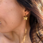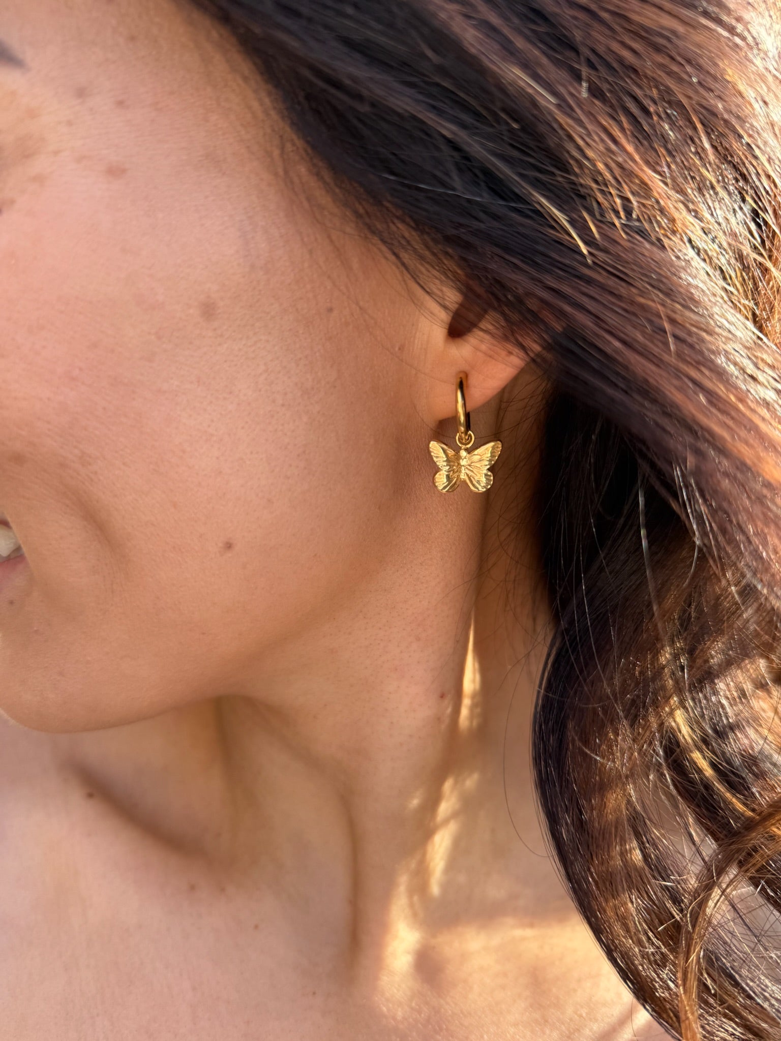 These earrings feature elegant gold huggie hoops with a delicate butterfly pendant dangling from each. The butterfly design is finely detailed, showcasing intricate wings that add texture and depth to the overall look. The combination of the simple huggie hoop with the graceful butterfly creates a charming, nature-inspired style perfect for adding a touch of whimsy to any outfit.