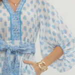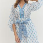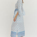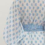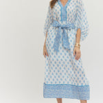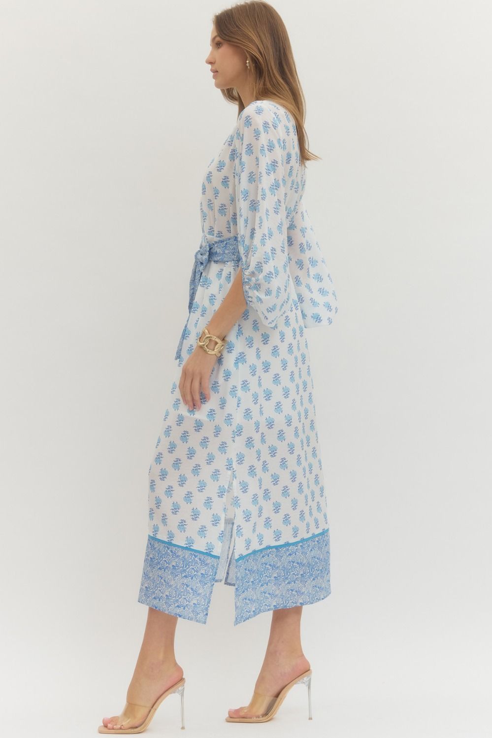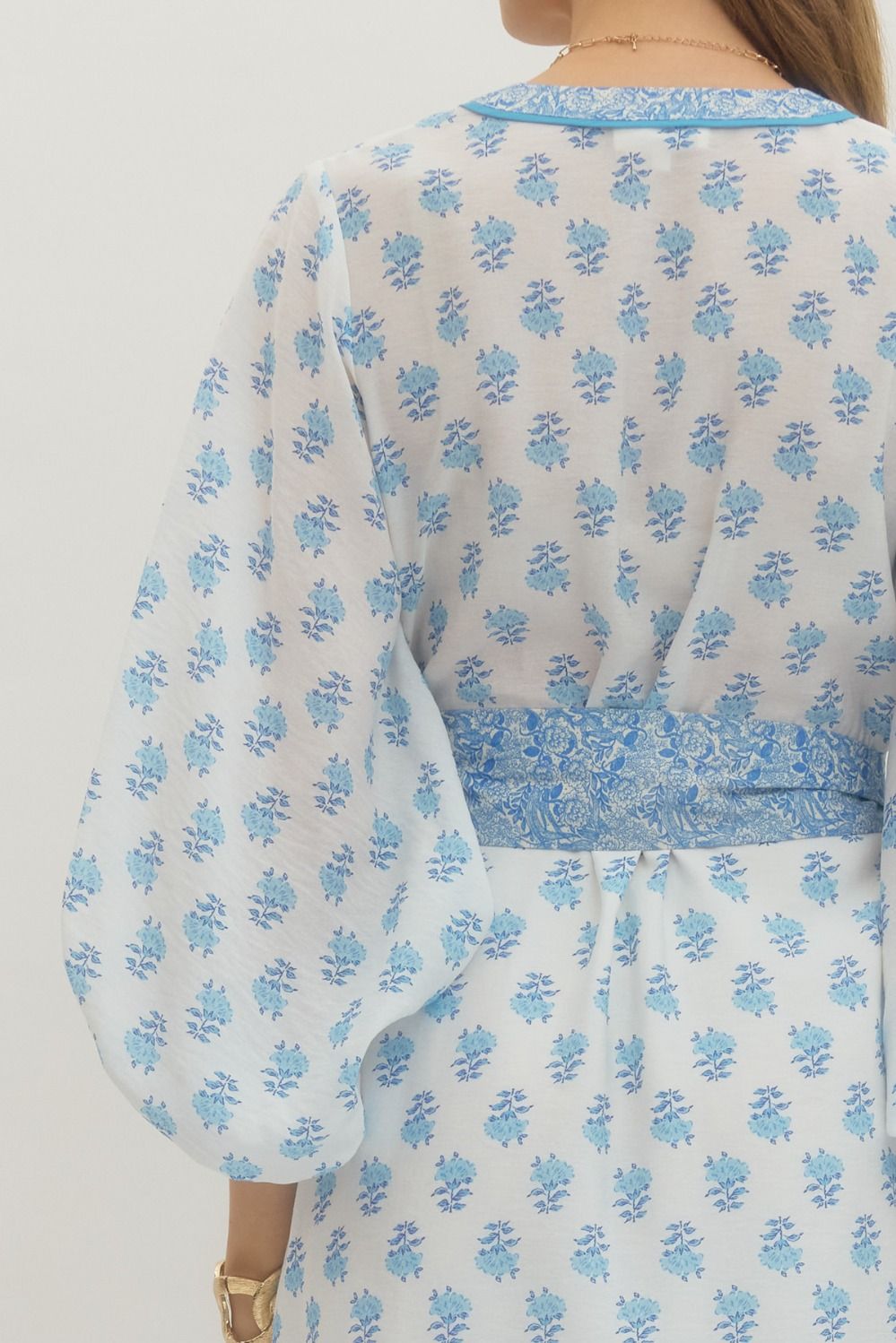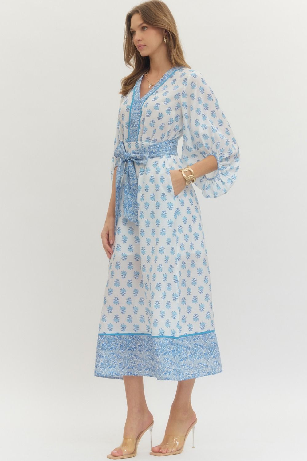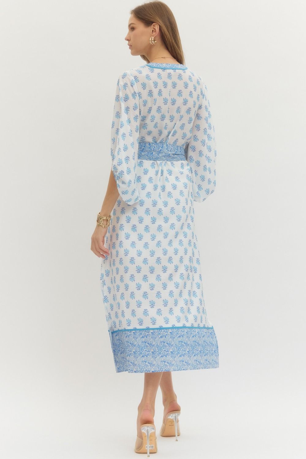 Floral Print 3/4 Sleeve Midi Dress - Ivory Blue
