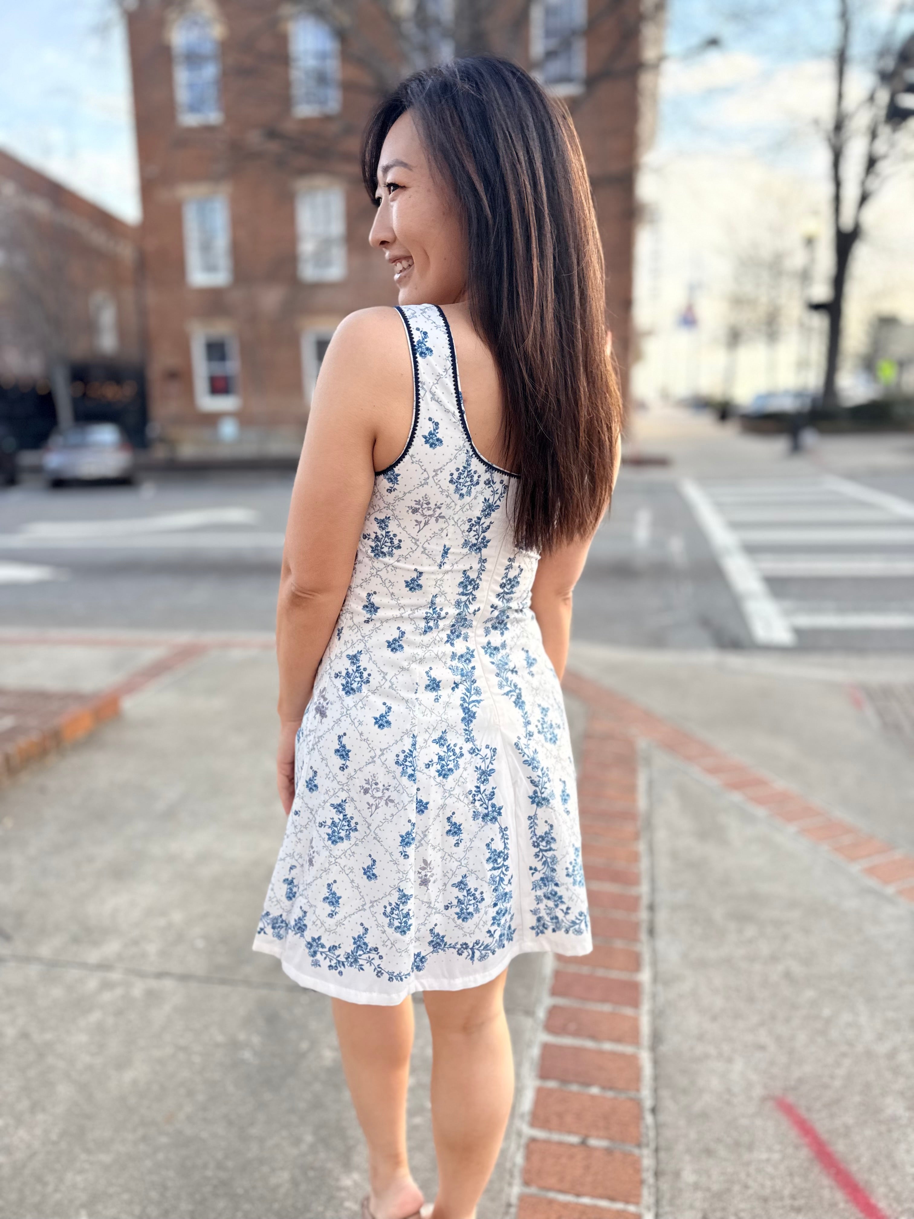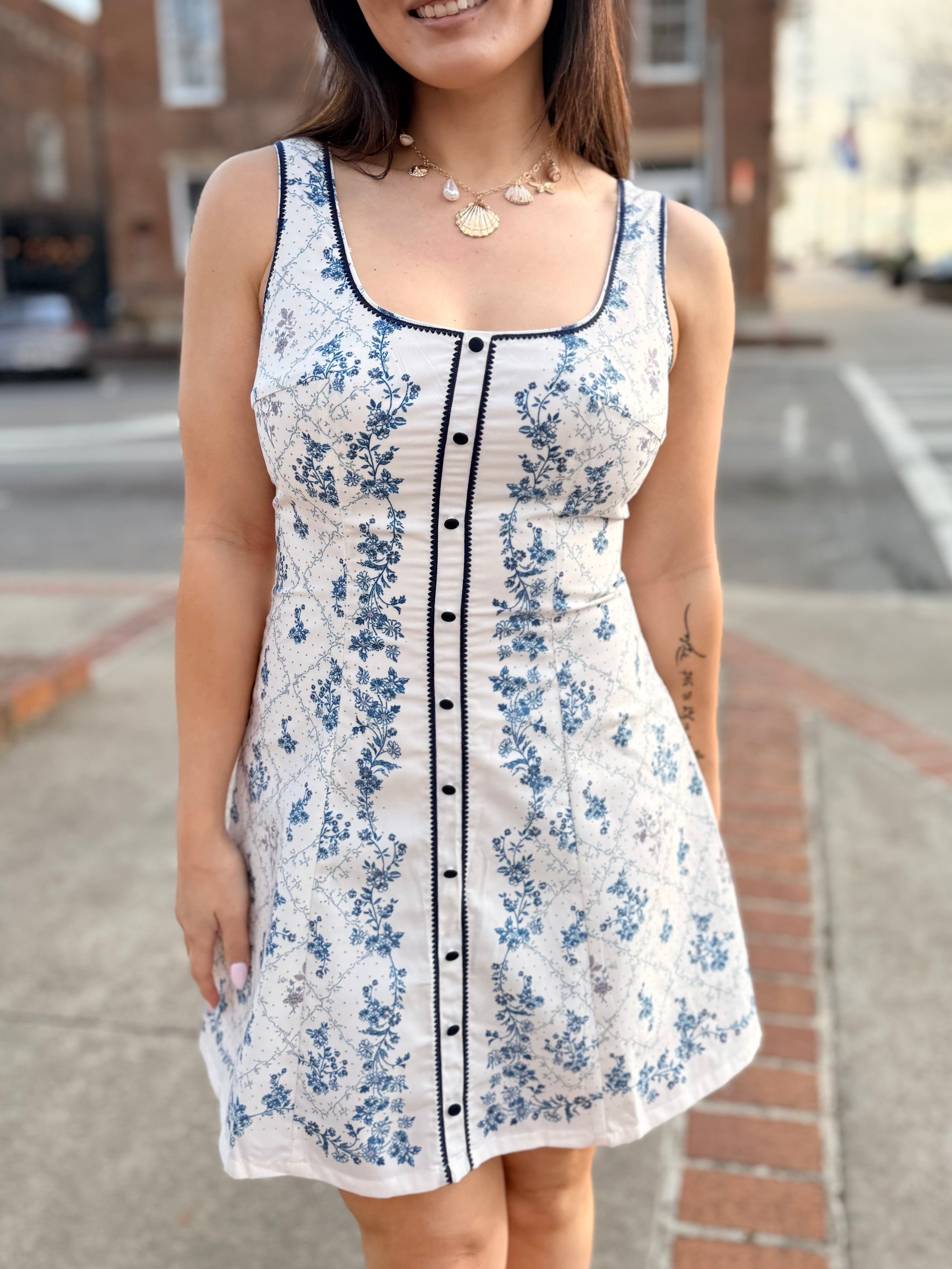 Sweet, classic, and effortlessly flattering—this mini dress is a must-have for sunny days and special moments alike. Featuring a delicate floral print, this style is designed with a structured scoop neckline and a full button-front detail that adds a timeless, feminine touch. The fitted bodice flows into a gently flared skirt for an easy, flattering silhouette that moves beautifully with you. Fully lined for comfort and coverage, it’s polished without feeling fussy.