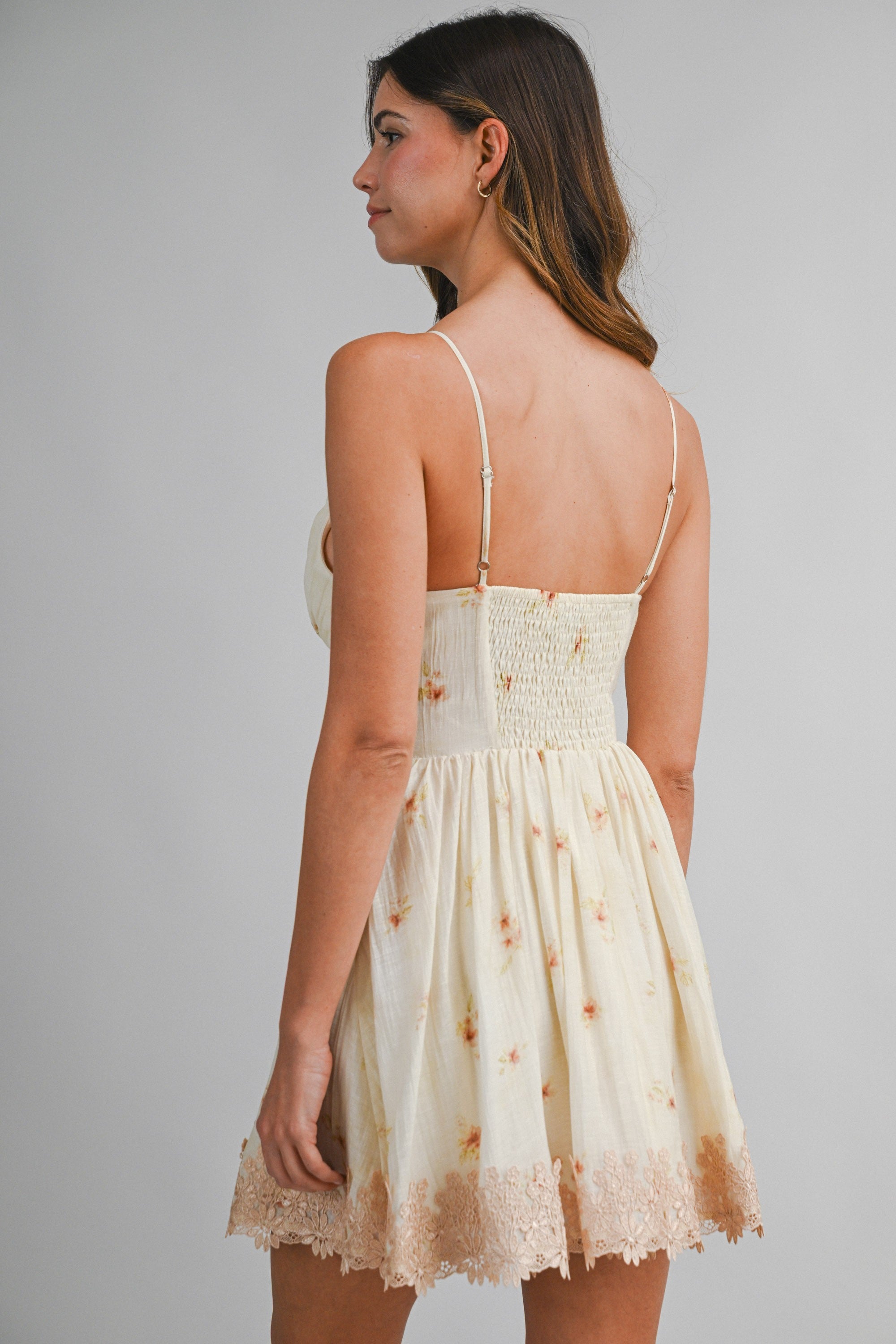 Flirty, feminine, and effortlessly eye-catching, the Floral Print Deep V Neck Adjustable Strap Dress is made for sunshine-filled days and special moments. Designed with a flattering deep V-neckline and delicate adjustable straps, this mini silhouette enhances your shape while offering a customizable fit. The smocked back bodice provides comfortable stretch, while the softly gathered waist flows into a flared skirt for graceful movement. Finished with a scalloped floral lace hem, this dress delivers the perfect balance of romance and confidence.