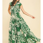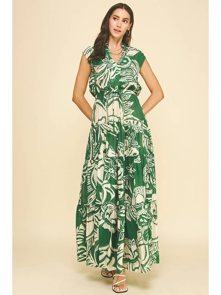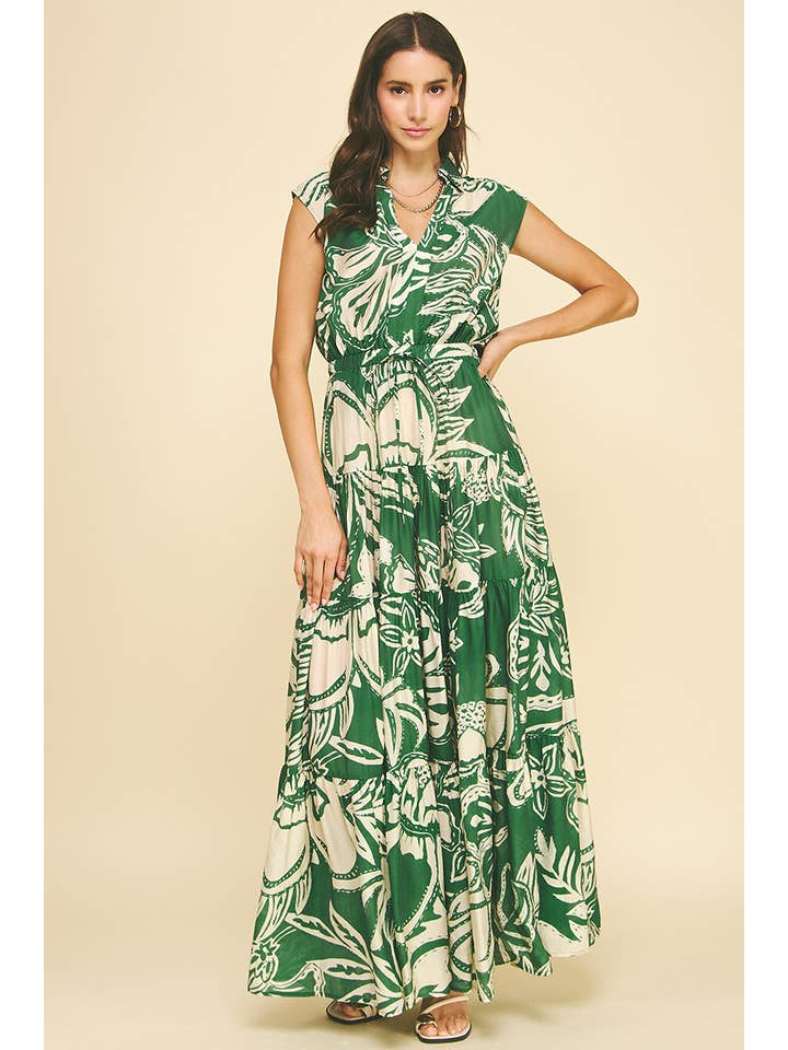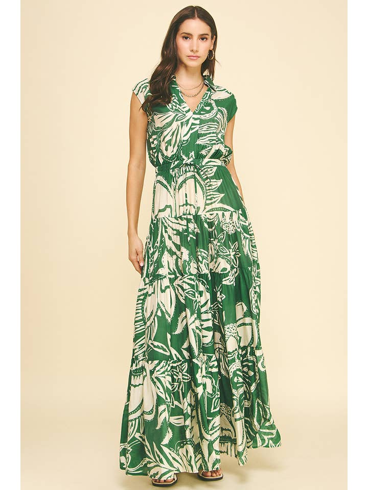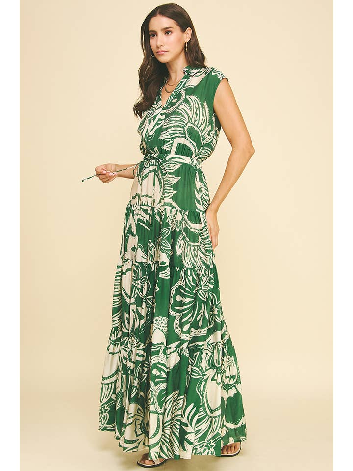 Feminine and effortlessly elegant, this floral tiered maxi dress is designed for easy, all-day wear. Featuring a classic collar with a flattering V-neckline, it offers a polished yet relaxed look. The adjustable self-tie waist defines the silhouette, while the tiered skirt adds graceful movement. Finished with soft cap sleeves and crafted from a lightweight rayon-nylon blend, this dress is perfect for warm-weather outings, casual events, or everyday sophistication. Hand wash for best care.