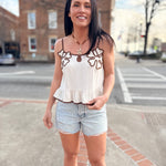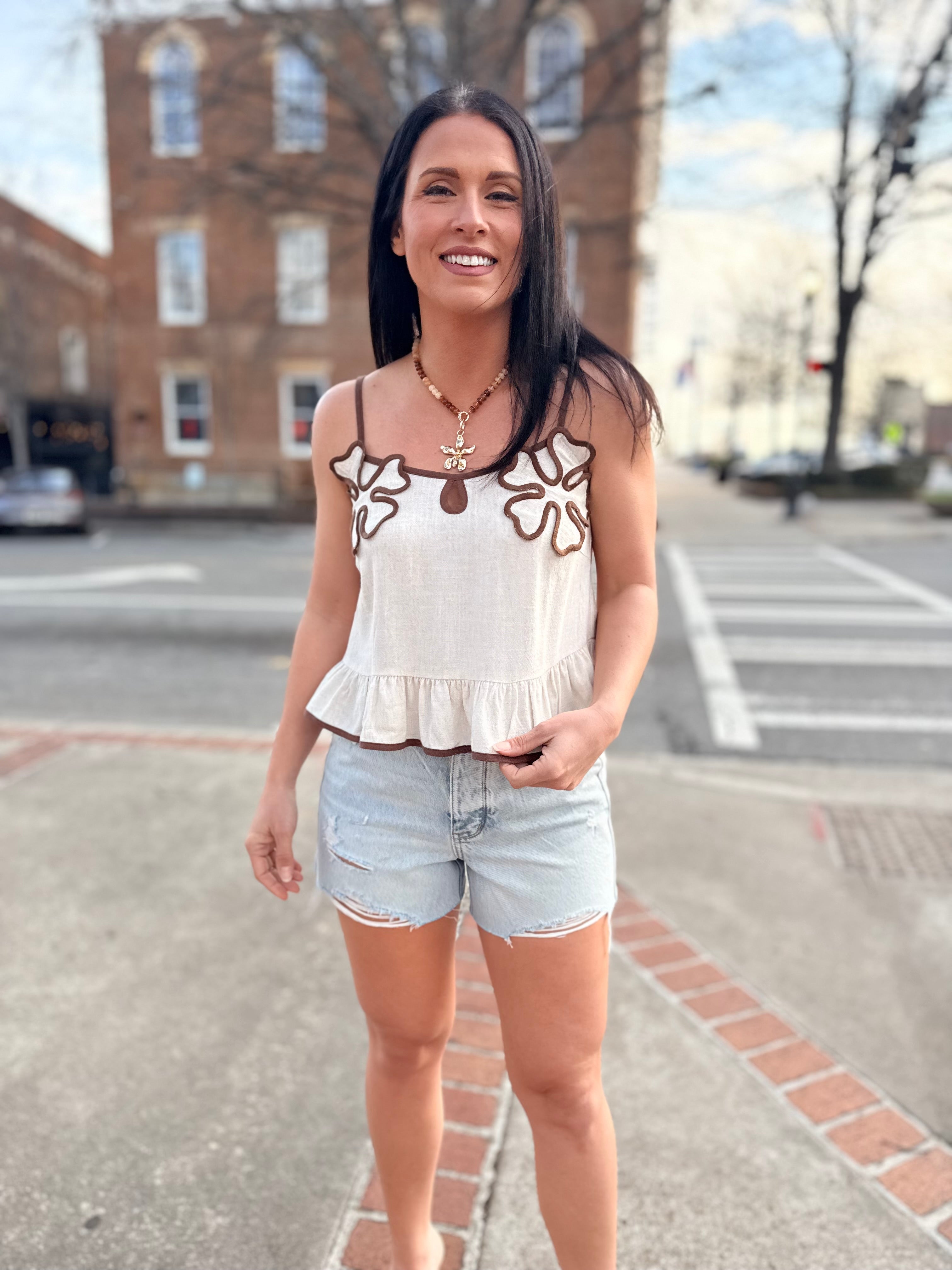 This cami is all about the details. Featuring delicate floral appliqué along the neckline with contrast trim and a soft ruffle hem, this top gives you an elevated, feminine look without trying too hard. The lightweight, breezy fit makes it perfect for warm days, while the neutral tones pair effortlessly with denim, white pants, or skirts. Easy to dress up or down—this is a go-to piece customers will reach for all season long.
