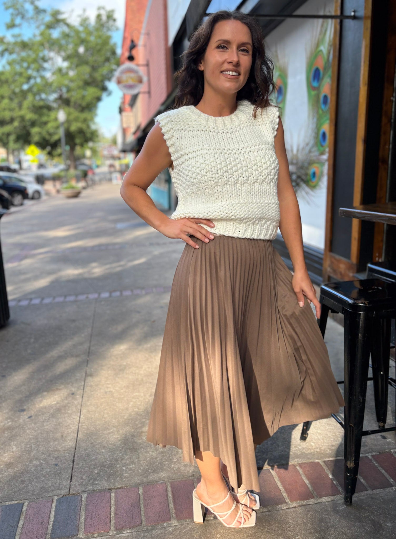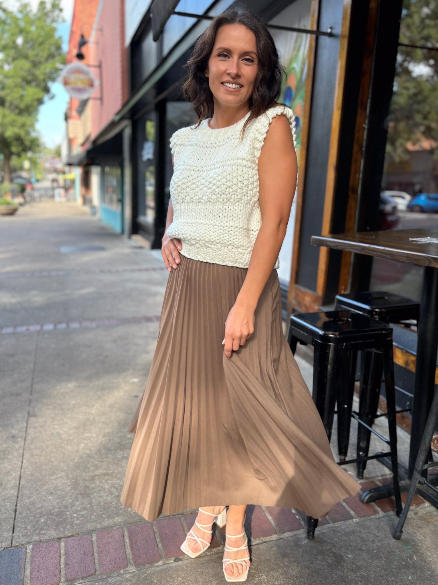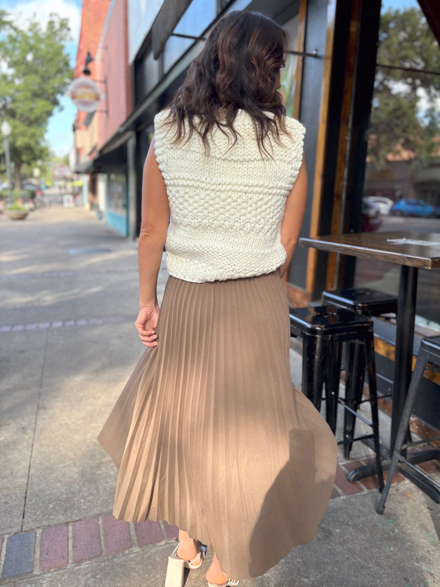 This brown pleated midi skirt offers a timeless and sophisticated silhouette with a touch of modern elegance. The delicate pleats create a graceful, flowing movement as you walk, while the rich brown hue adds warmth and versatility to your wardrobe. Designed with a flattering midi length, it pairs effortlessly with a variety of tops, making it a versatile choice for both casual and dressy occasions.