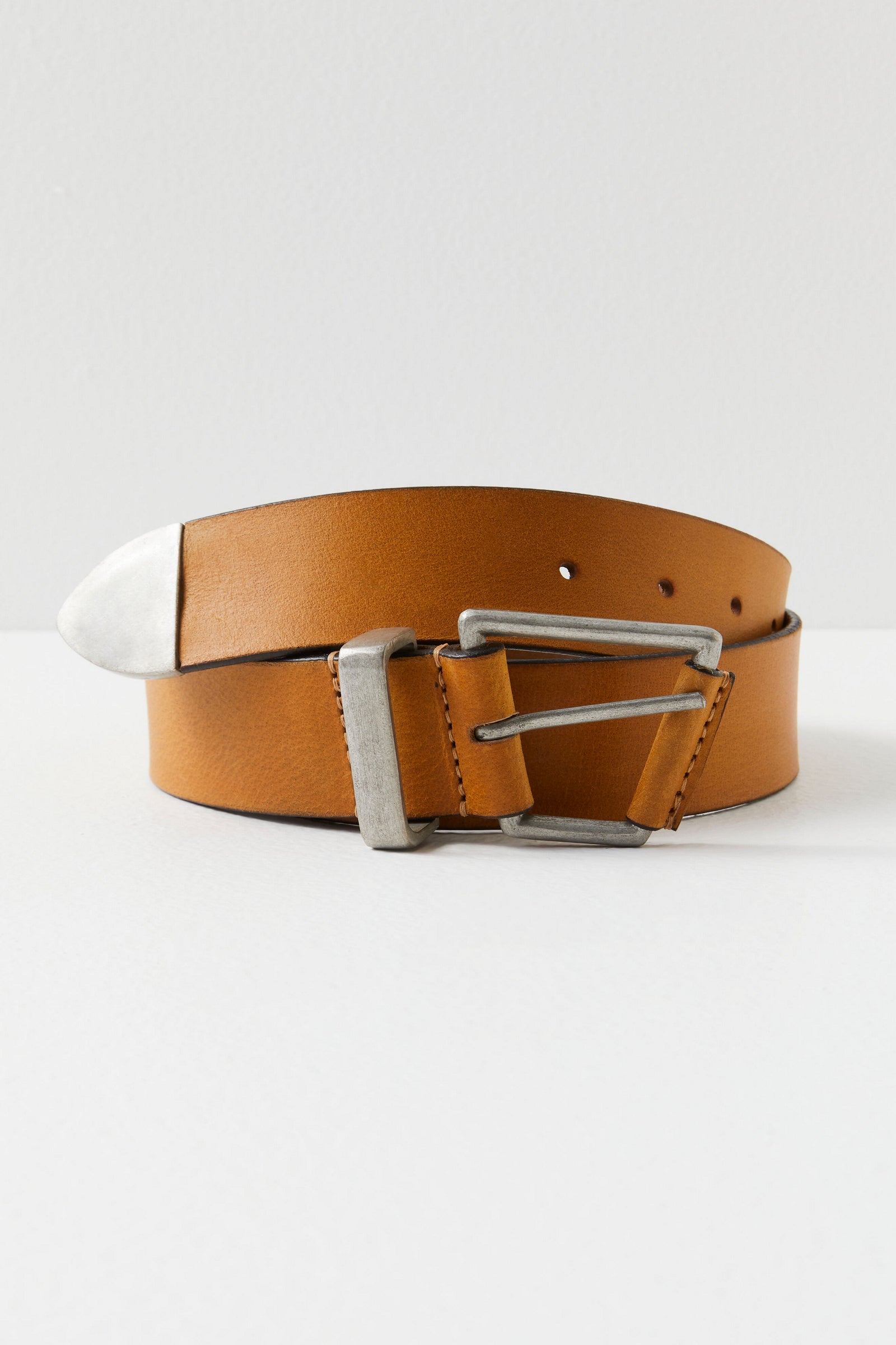 So essential, goes-with-everything leather belt featured in a timeless silhouette and design with eye-catching metal hardware and an effortlessly cool slanted buckle.