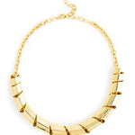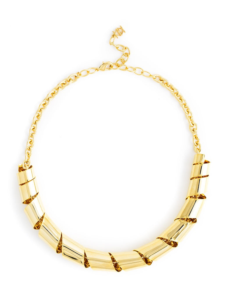 This necklace is a striking and contemporary design that exudes elegance and sophistication. It features polished gold-tone tubular segments arranged in a twisted, spiral-like pattern along the chain. The reflective surfaces and dynamic structure create a bold yet refined aesthetic, making it an ideal statement piece for formal or upscale occasions.