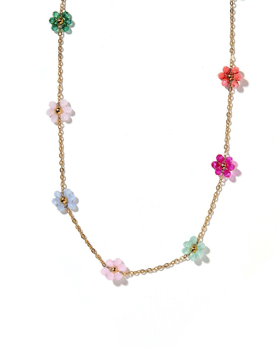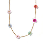 This necklace showcases a delicate gold chain with a series of colorful flower-shaped pendants, each crafted from soft pastel hues like pink, green, blue, and coral. The flowers are gently arranged along the chain, bringing a playful, joyful feel to the piece. This necklace has a whimsical, springtime vibe, making it the perfect accessory to brighten up any outfit.