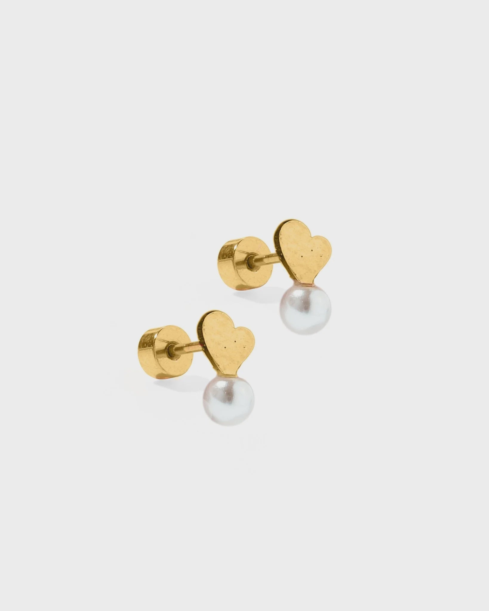Add a touch of elegance with a playful twist with the Heidi Pearl Heart Stud Earrings. Featuring a classic pearl with a gold heart on top, these 9mm studs are a perfect balance of sophistication and whimsy. Crafted from 100% surgical-grade stainless steel, these earrings are lightweight, durable, and hypoallergenic, making them ideal for sensitive ears. The innovative screwback design ensures a secure and snug fit, making them comfortable for everyday wear—perfect for both adults and kids.