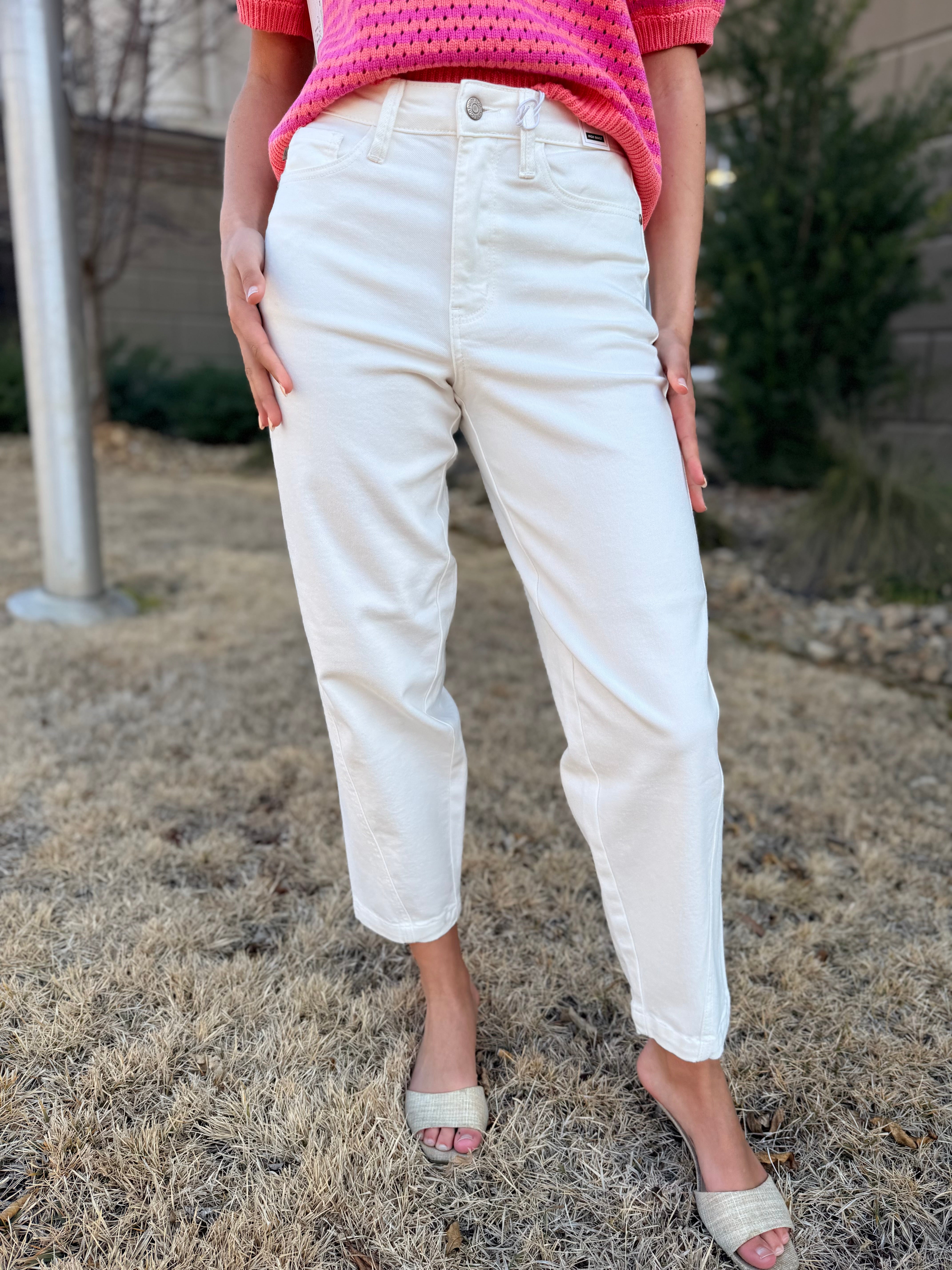 Fresh, flattering, and effortlessly on-trend, these High-Rise Rigid Magic Barrel Jeans are the perfect update to your denim lineup. Designed with a structured front for that true denim look and a stretchy back panel for comfort, they deliver the best of both worlds—snatched at the waist, easy through the hips, and comfortable all day. The barrel-leg silhouette creates a modern, fashion-forward shape, while the crisp white wash keeps the look clean and elevated. Pair them with everything from fitted tanks to breezy blouses for an instantly polished outfit.