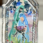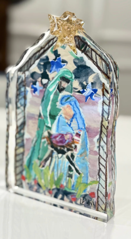 Lauren's representation of the humble birth of Jesus artistically captures Mary, Joseph, and baby Jesus in a silhouette-style acrylic print, blending simplicity with sacred meaning.