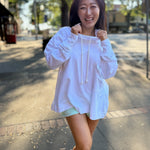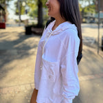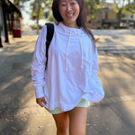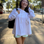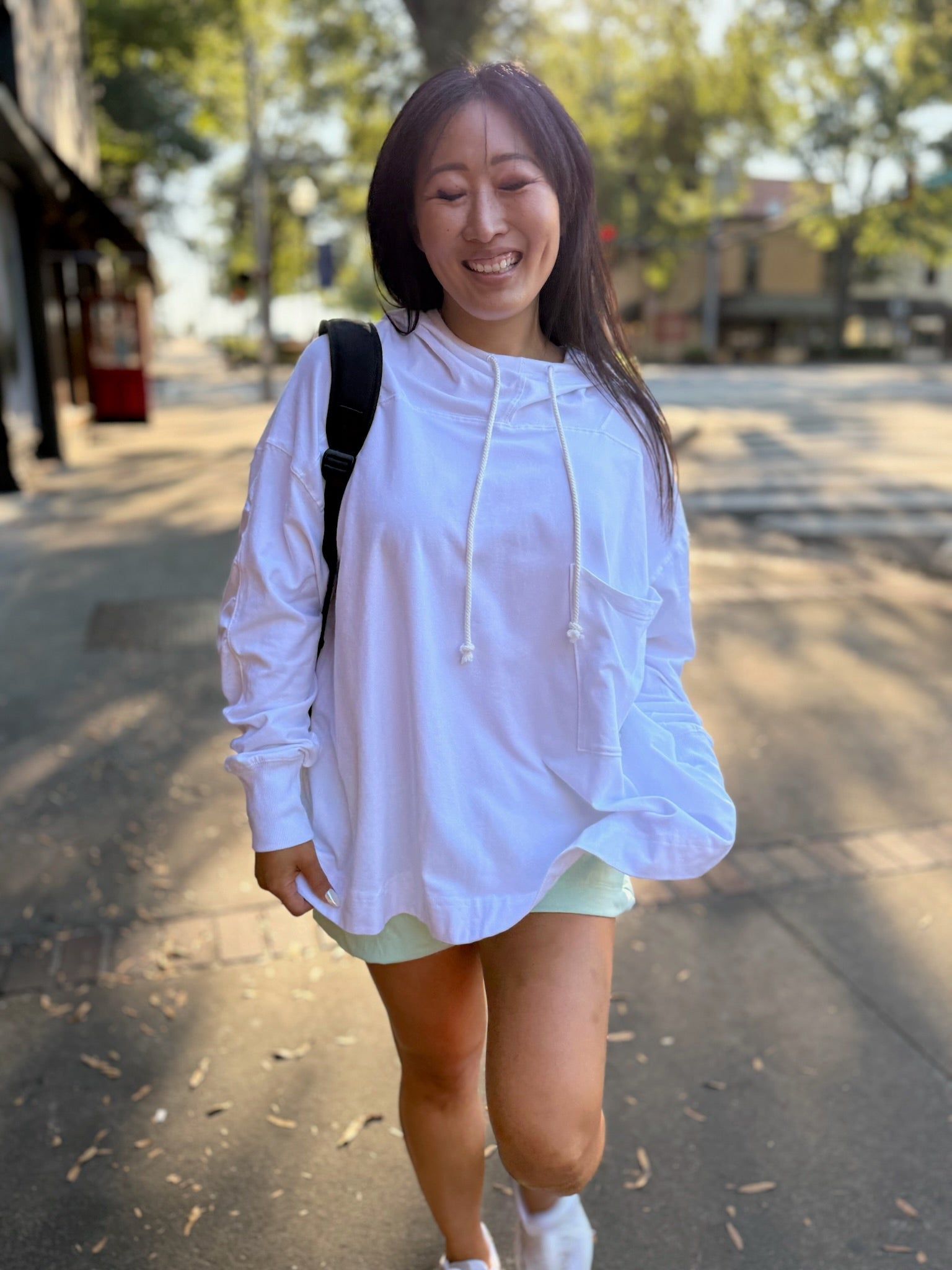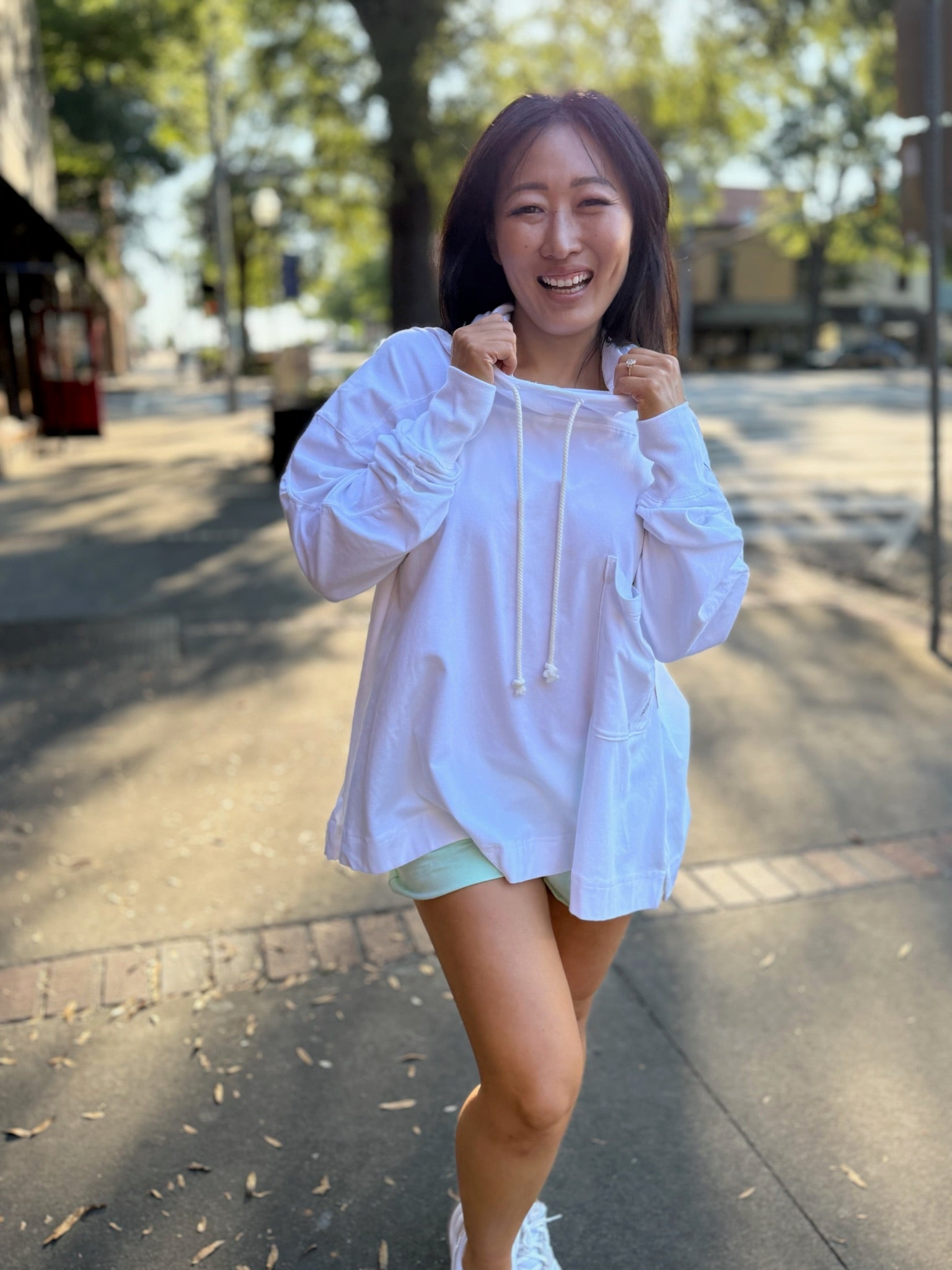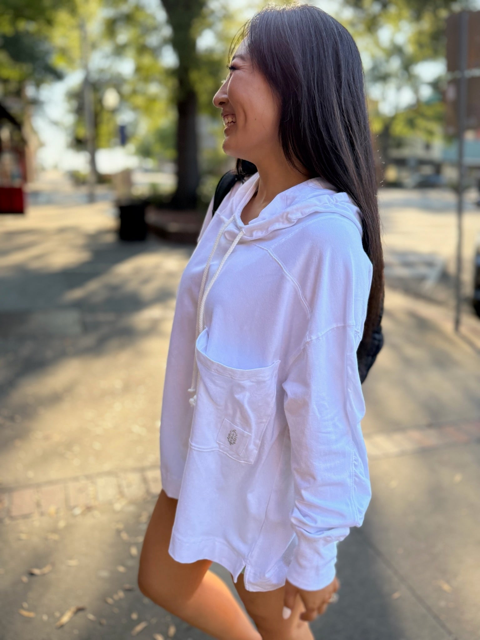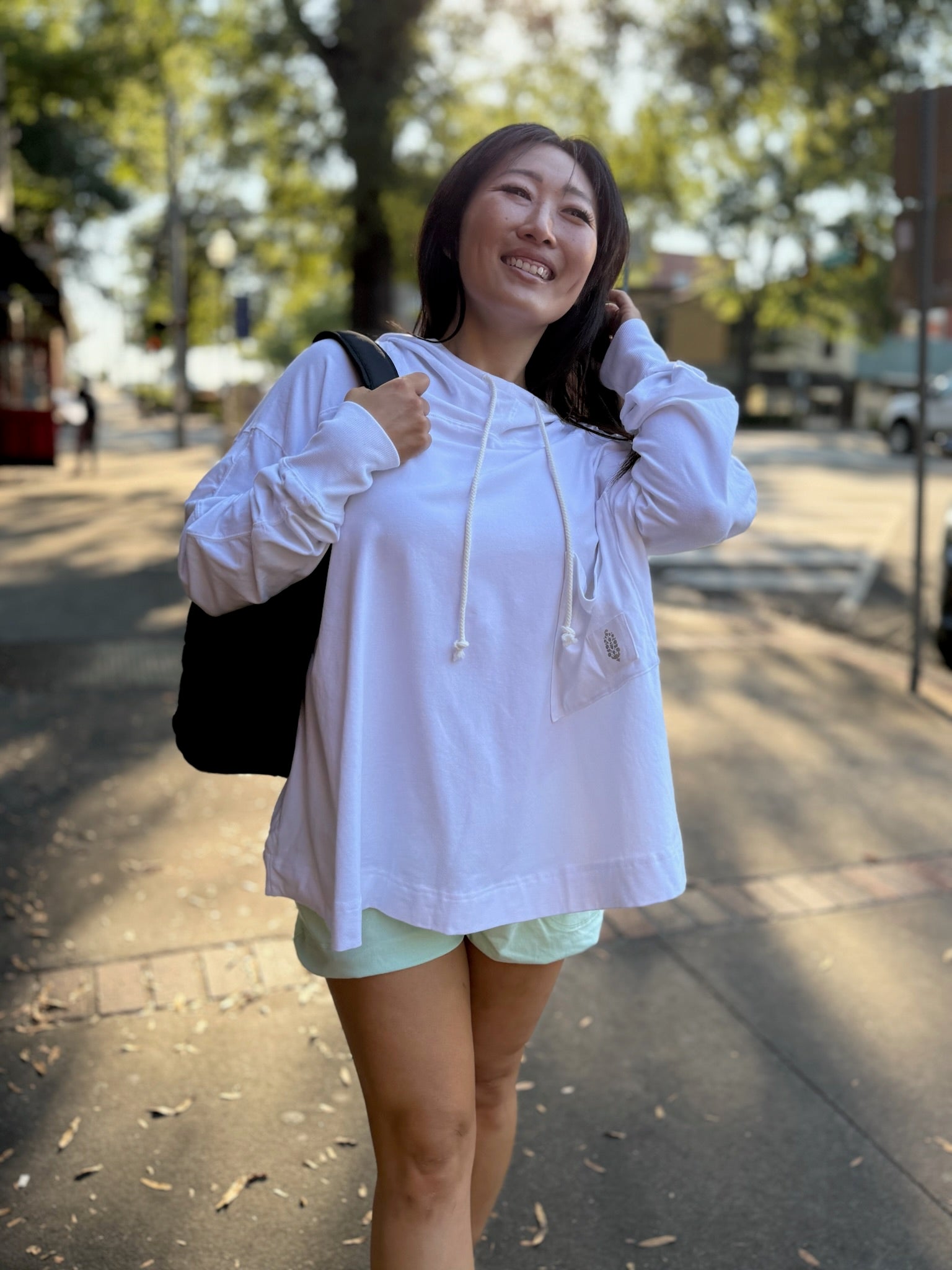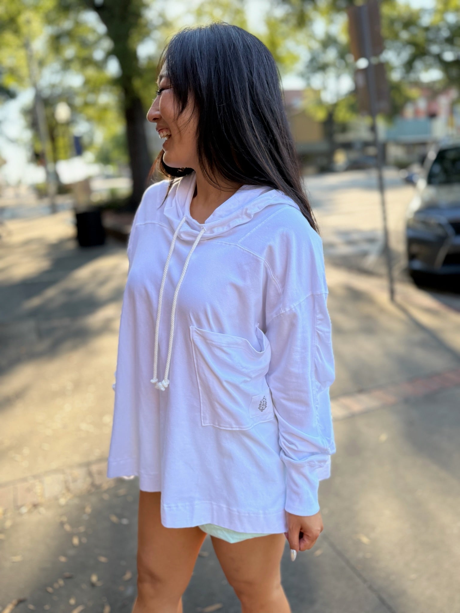 Features: Soft fabrication, light and airy with a relaxed fit; tapered sleeves with ribbed hem detail; large chest pocket; adjustable drawstring hood