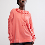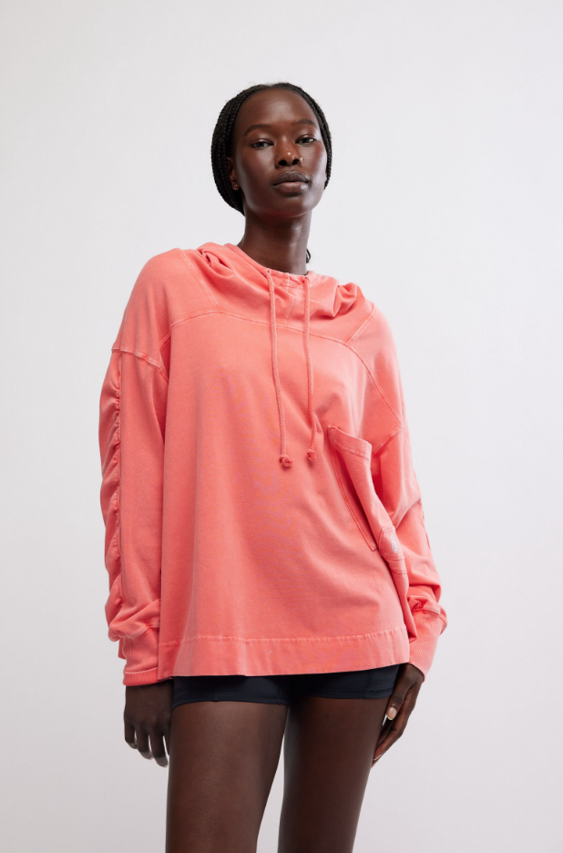 Features: Soft fabrication, light and airy with a relaxed fit; tapered sleeves with ribbed hem detail; large chest pocket; adjustable drawstring hood
