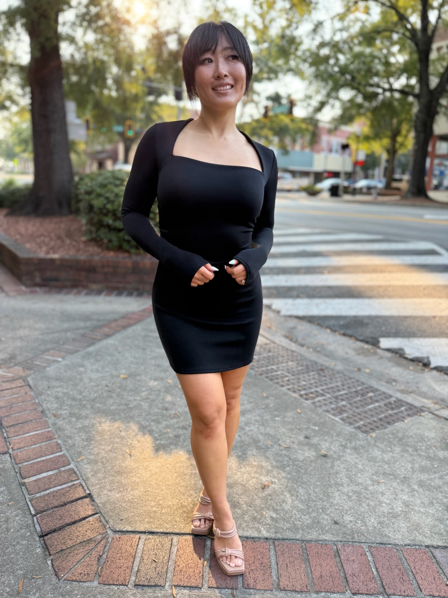 Sleek and timeless, this black mini dress features a chic square neckline and figure-flattering silhouette. The long sleeves balance the short hemline, while subtle side ruching adds a touch of detail. Perfect for a night out, date night, or any occasion that calls for effortless sophistication.