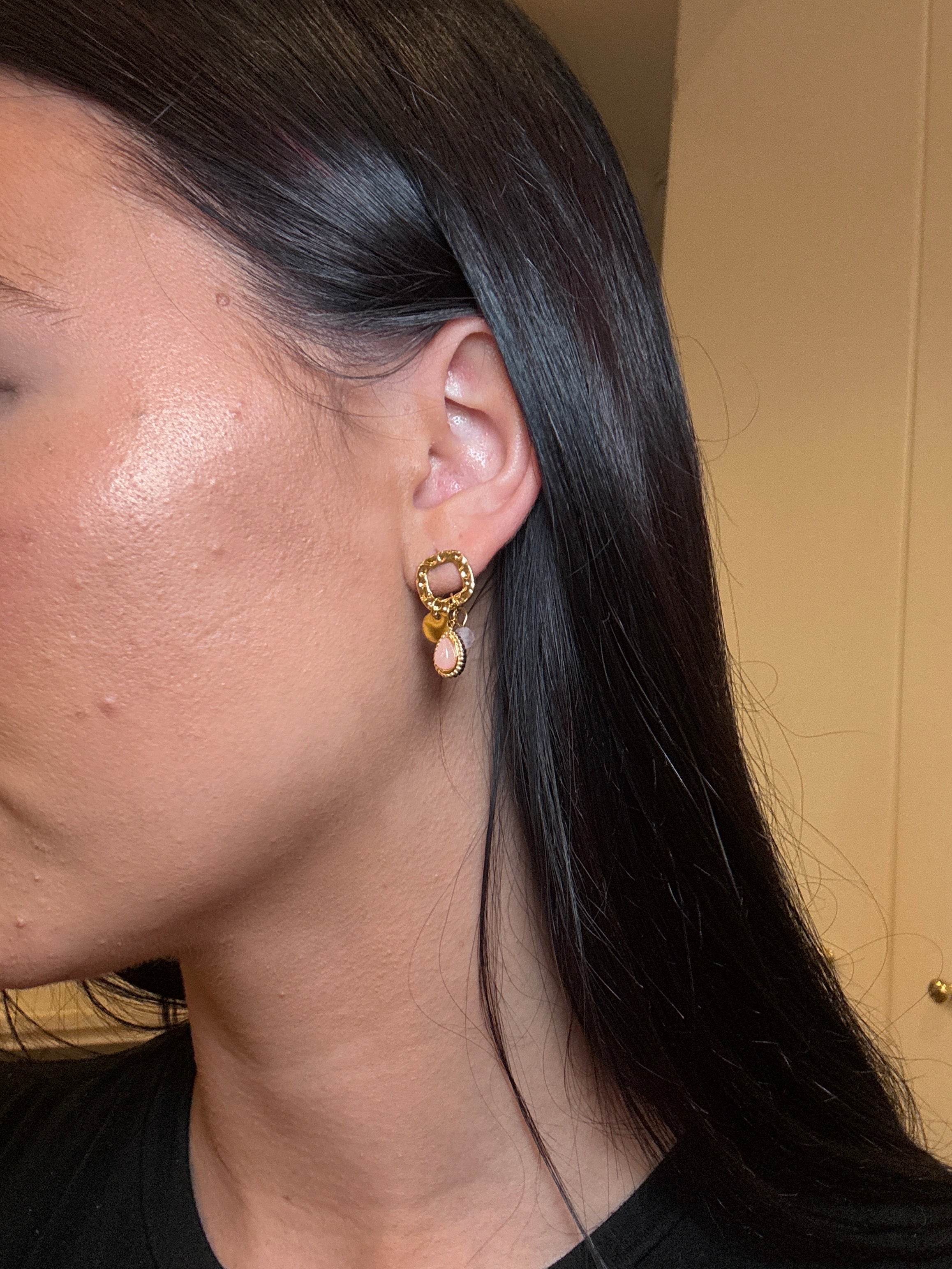 Bring a touch of old-world charm to your look with the Indiana 18K Gold Non-Tarnish Vintage Stone Drop Earrings. Designed with soft pink stones and hammered gold accents, these earrings add a romantic, timeless finish to any outfit.