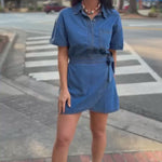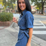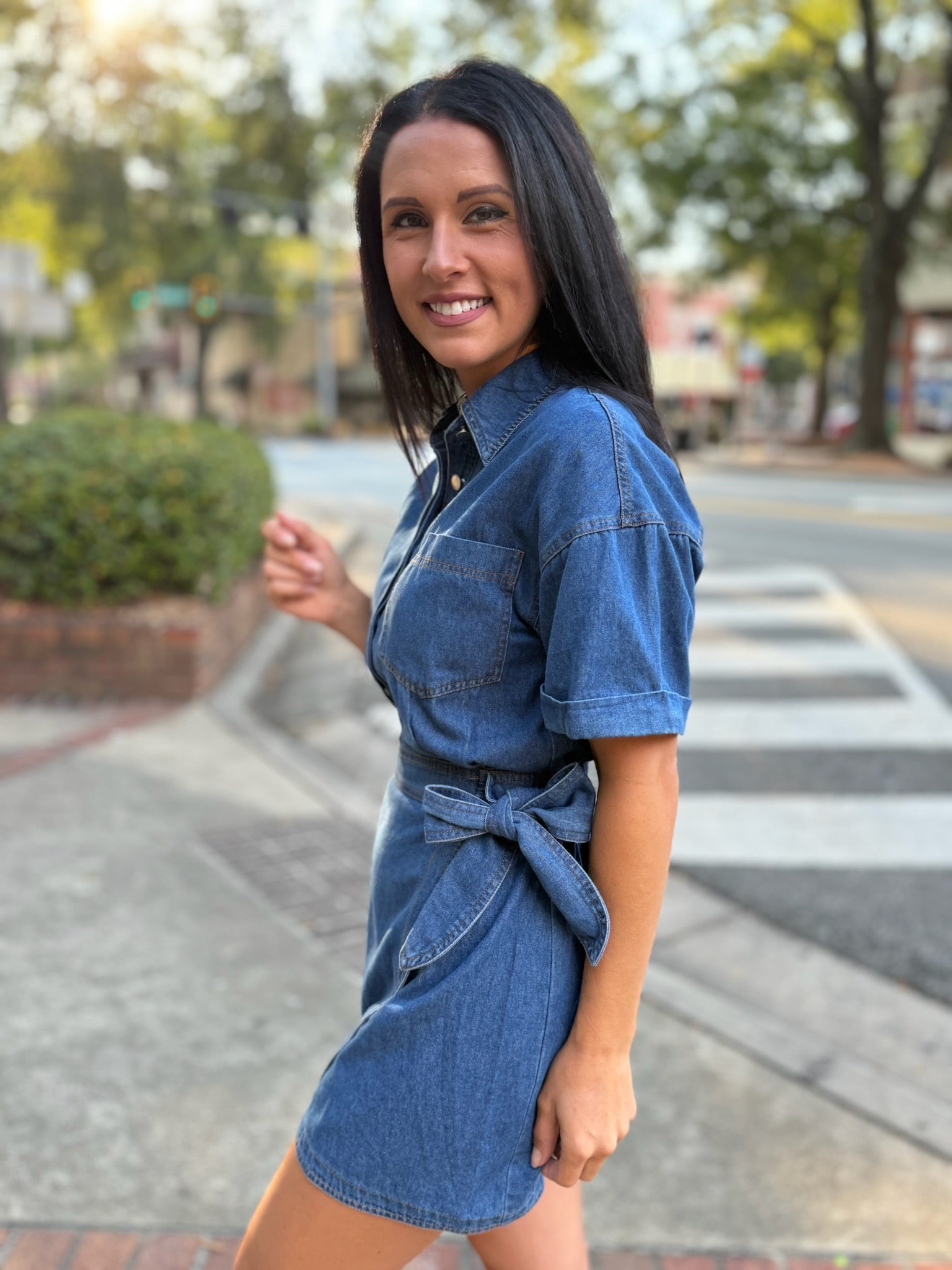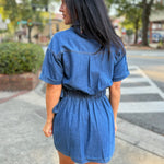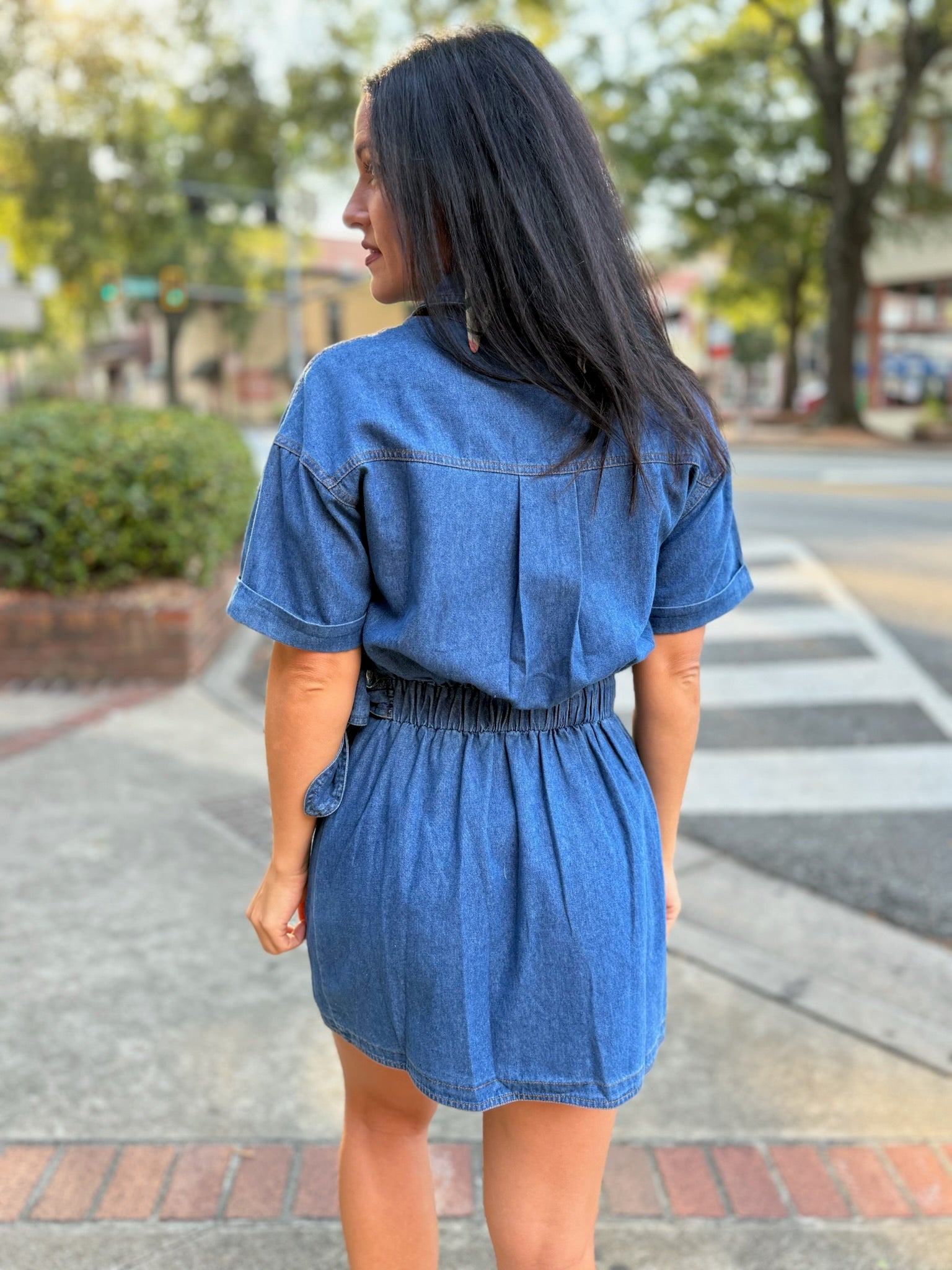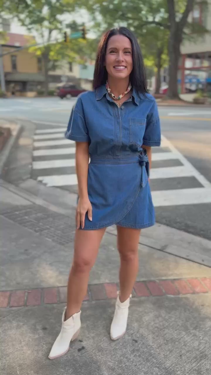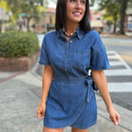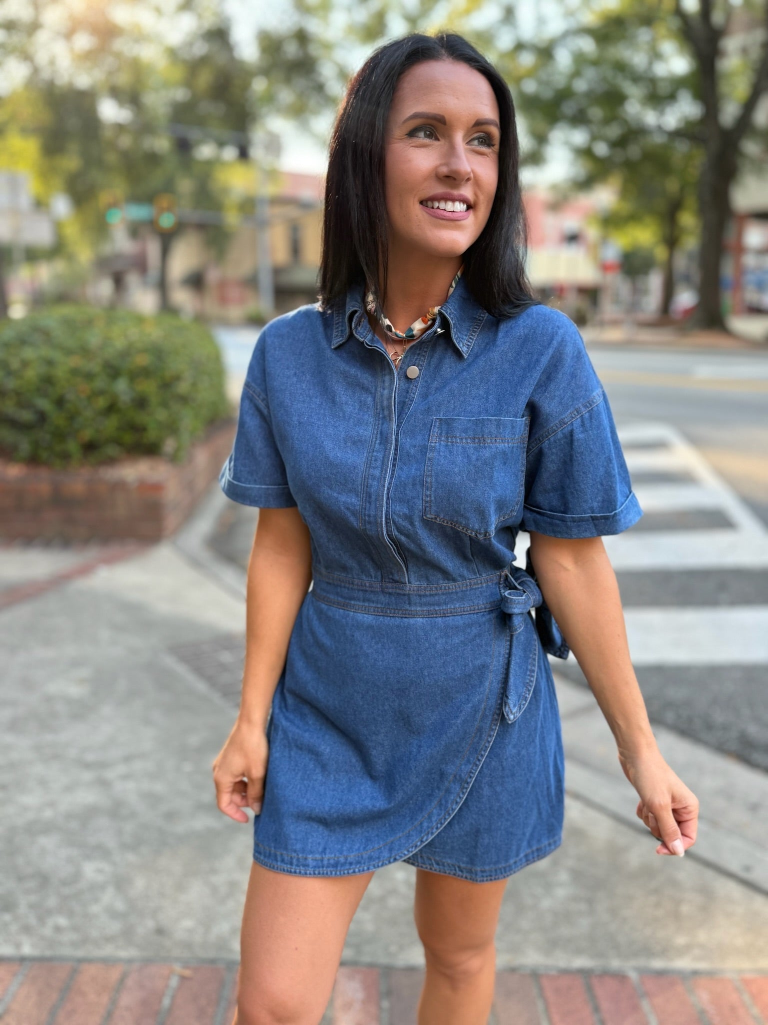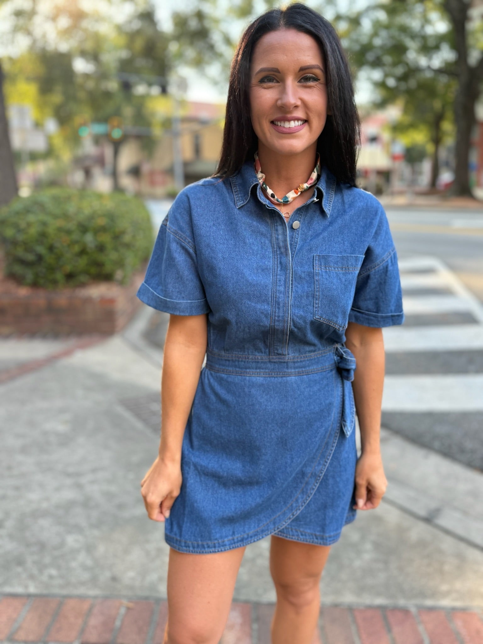 The Indigo Denim Short Sleeve Collar Wrap-Style Mini Dress is casual yet effortlessly chic. This denim mini features short sleeves, a collared neckline, and a wrap-style silhouette with a side self-tie detail. Finished with a front pocket and a back elastic waistband for comfort, it’s the perfect go-to piece for laid-back days or dressed-up denim moments.