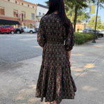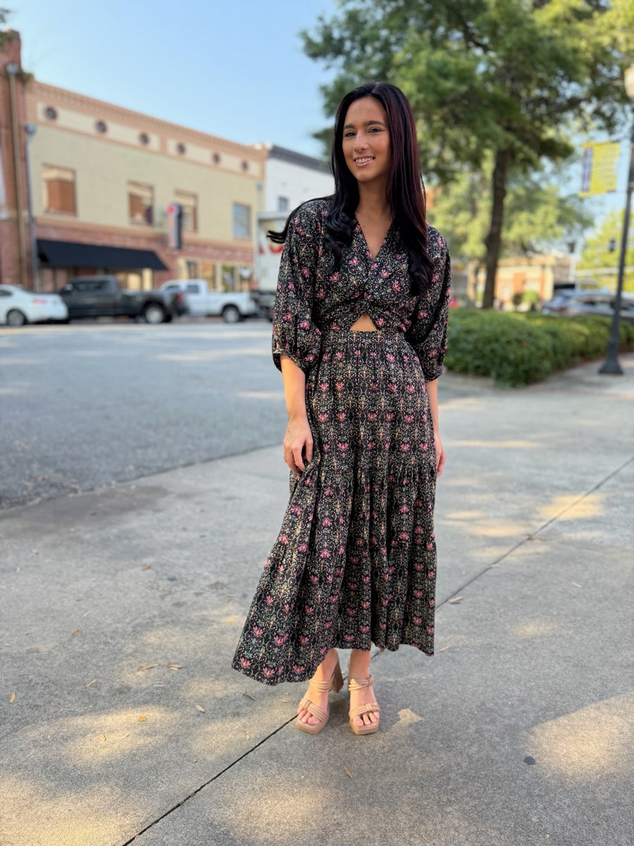 This floral wonder brings all the charm with its romantic puff sleeves, flattering v-neckline, and subtle cutout detail that adds just the right touch of intrigue. The dark, moody floral print pops with rich jewel tones, making it perfect for both daytime strolls and evening outings.