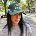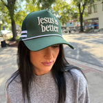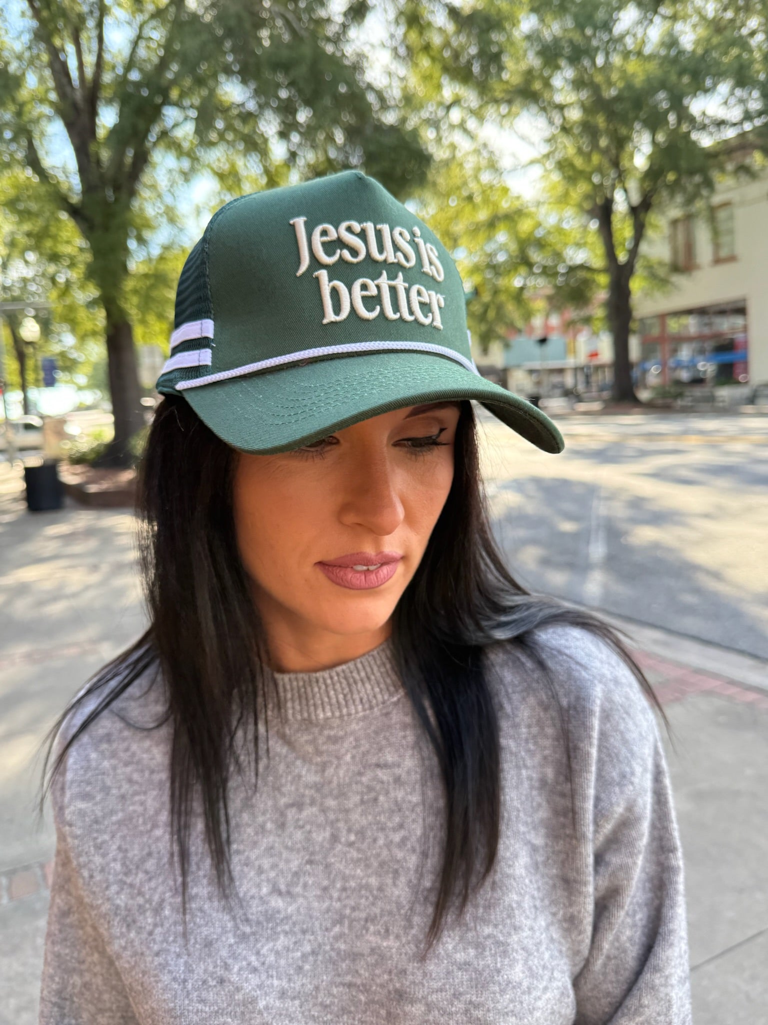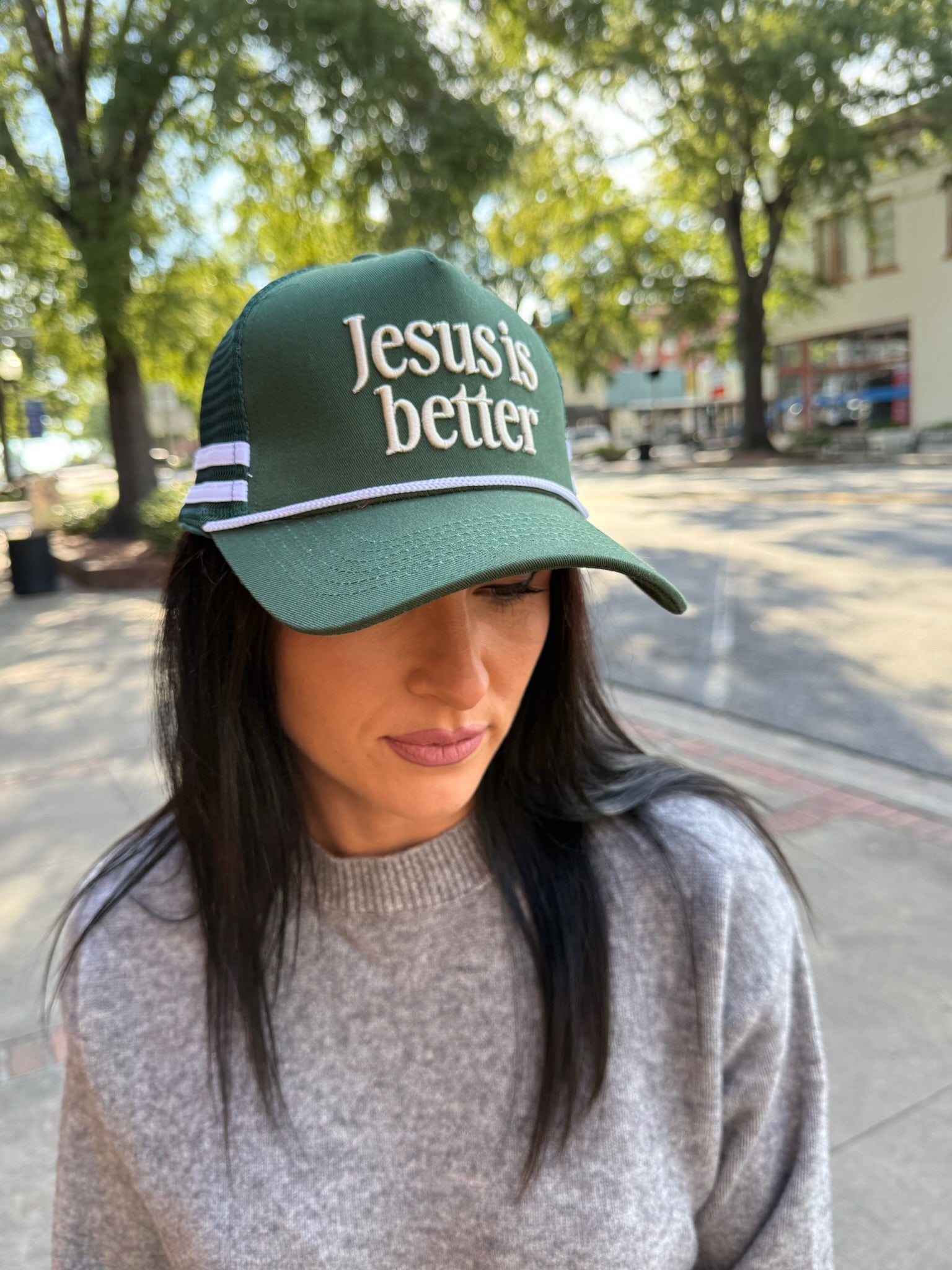Make a bold and beautiful statement with the “Jesus Is Better” hat — a timeless reminder of what truly matters. With its deep forest green tone, sporty stripes, and crisp embroidered lettering, this hat is perfect for everyday wear with eternal impact. Whether you're out for a walk or gathering with friends, this piece keeps your heart and message in the right place. Let your faith lead — because Jesus is always better.