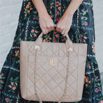 This tall magazine style tote is designed with a stunning vegan leather quilted fabric. It's a great, everyday bag that accommodates most laptops with plenty of space for daily essentials. It features a deep magnetic front pocket ideal for a large phone, along with versatile carrying options through short top handles and elongated braided handles. This tote includes a secure magnetic closure, along with two interior open pockets and one zippered pocket for efficient organization. There are feet on the bottom for added protection as well. The Quilted LD describes the shape of the quilting (Large Diamond Quilted) on this soft material. 14" tall without top handle 15" wide 4.5" base 4.5" top handle drop 15.5" long handle drop 11" deep front pocket