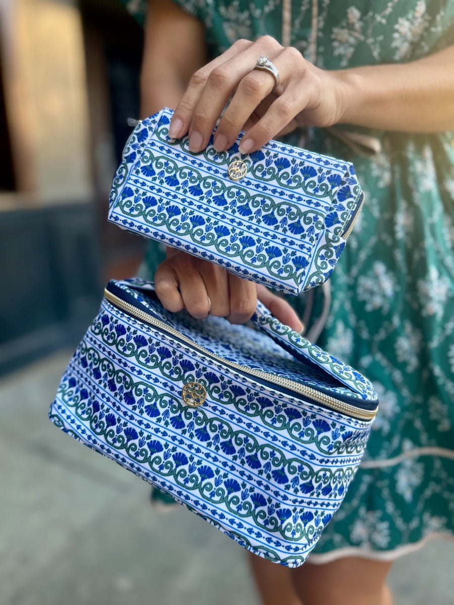Brighten up your beauty routine with the Kiss and Make Up case in the elegant Floral Foulard Navy print. This stylish and spacious cosmetic bag features a vibrant pattern with classic blue and green detailing, paired with a gold-tone zipper and emblem. Ideal for organizing your makeup or toiletries at home or on the go, it's the perfect blend of function and flair.