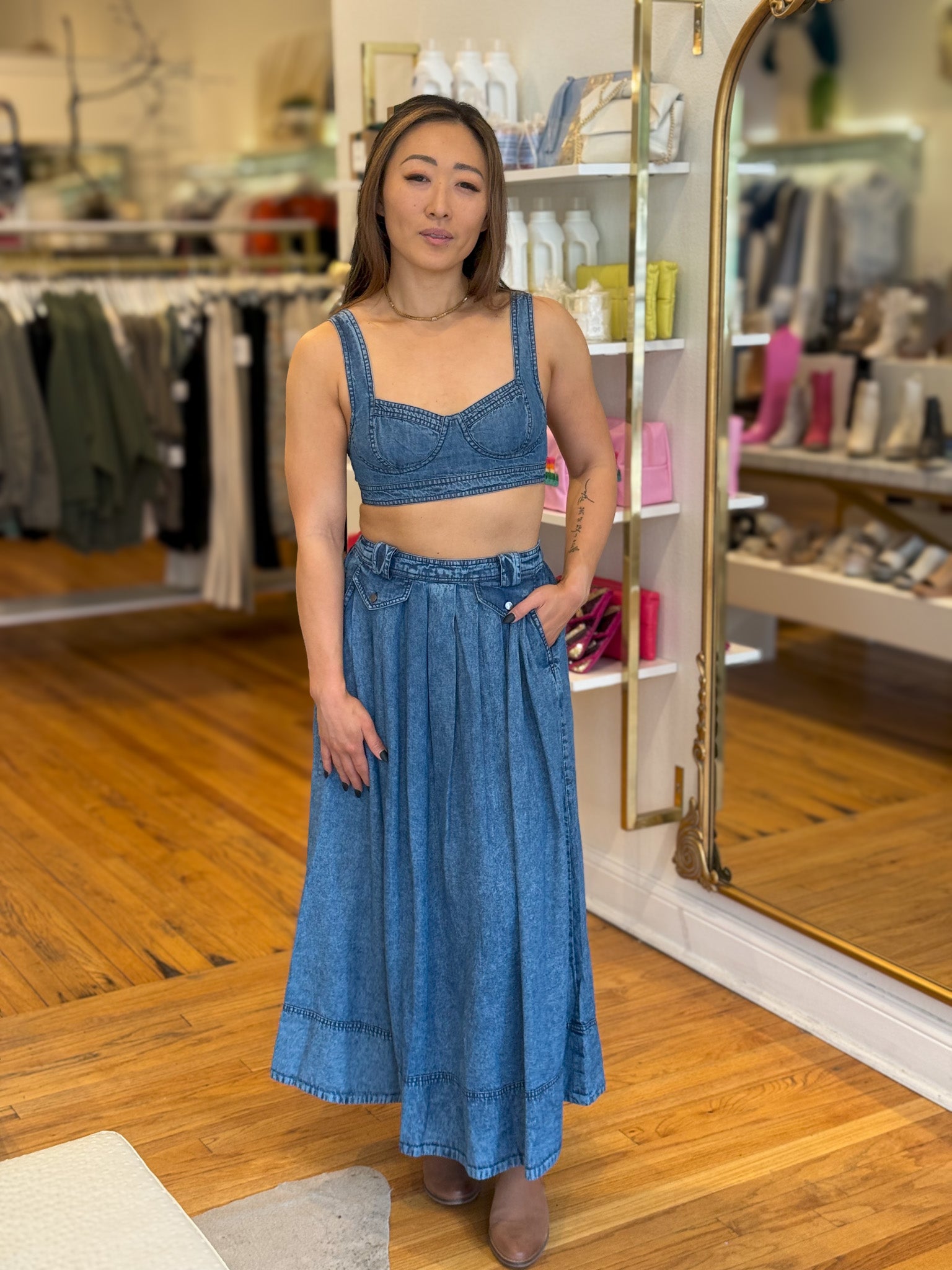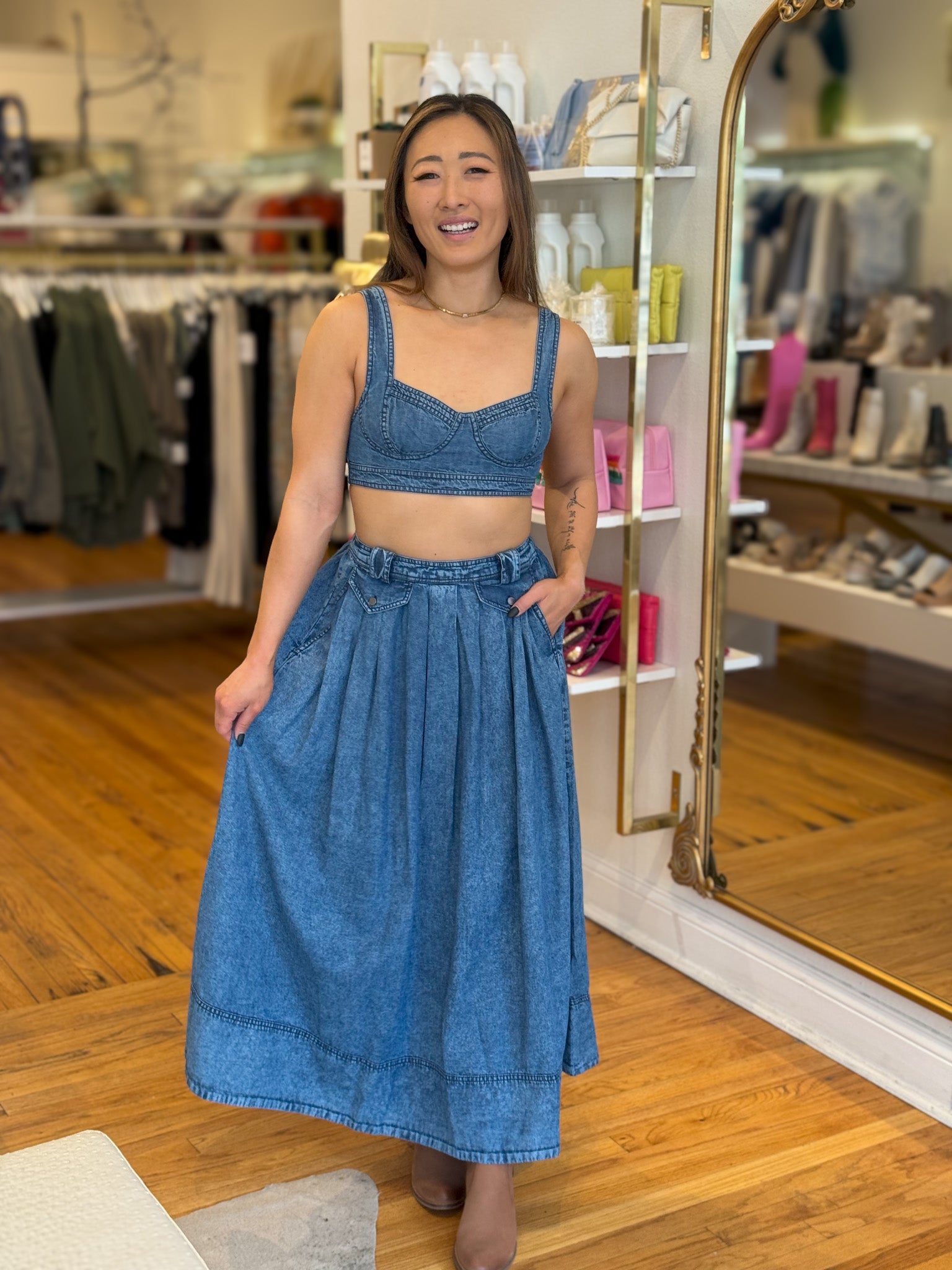 Denim two piece set with bustier top and a-line maxi skirt with pockets
