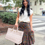 This oversized tote is the best go-to handbag! It has two short top handles as well as two elongated braided handles to carry on your shoulder. The Caroline Hill logo is centered at the top of this bag on one side. It has a magnetic closure leading to the roomy interior of the bag. It has one zippered pocket and two open pockets inside. There are also feet on the bottom of the bag for added protection. It's the perfect size for travel, carrying a laptop, or for everyday fashion.