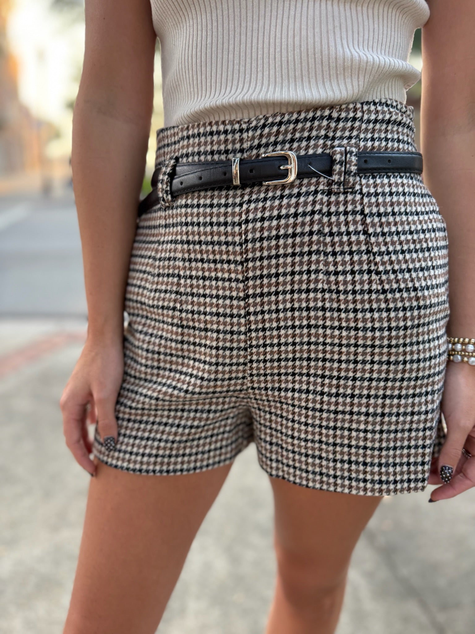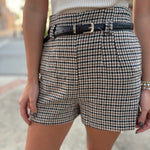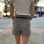 Tailored yet trendy, these high-waisted houndstooth shorts feature a classic checkered pattern with a modern fit. Designed with side pockets and a sleek black belt, they’re perfect for adding a polished touch to your look. Pair them with tights and loafers for a chic fall vibe or wear them with a simple top for a casual day out.