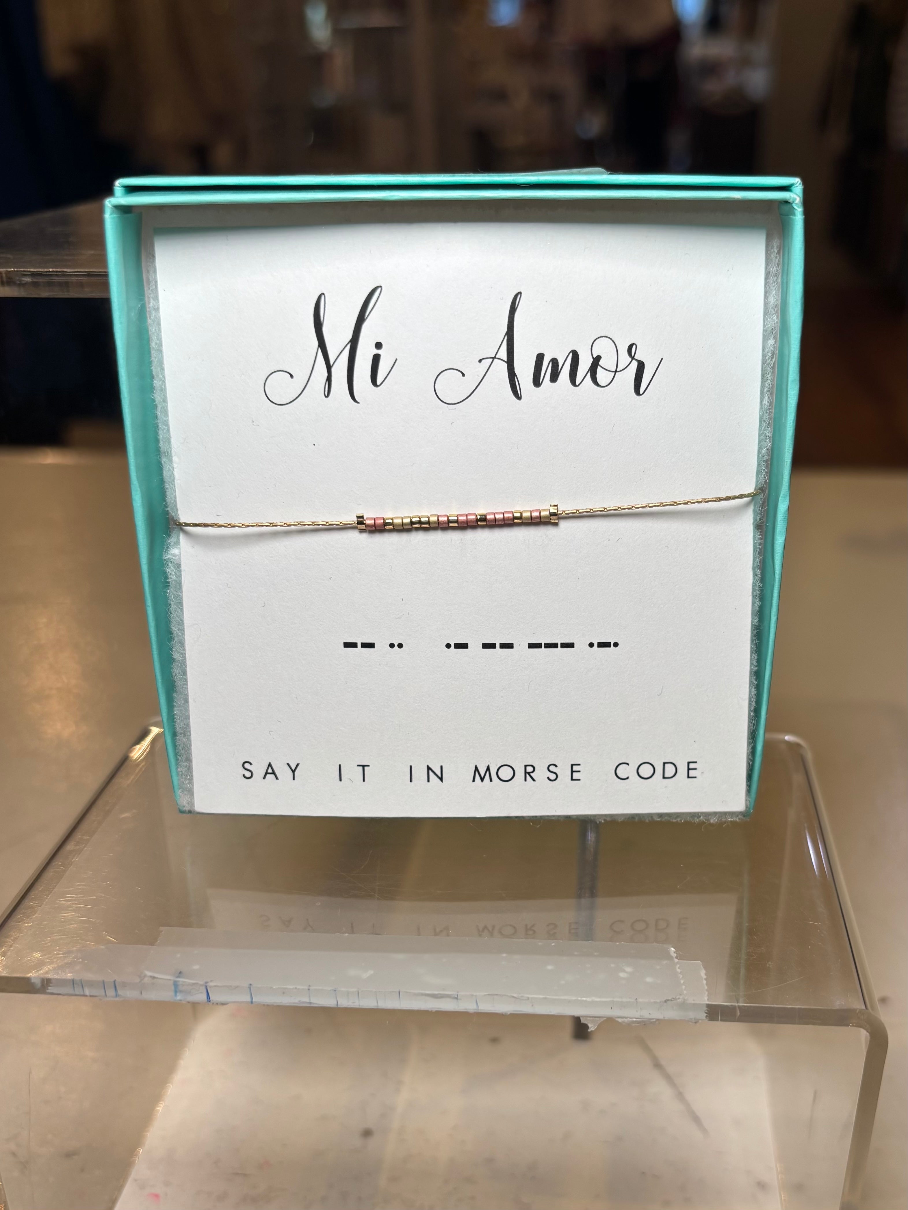 The **Mi Amor Bracelet** is a beautiful and subtle way to express love through Morse code. This handcrafted bracelet features delicate beads or dashes and dots representing the phrase "Mi Amor" in Morse code, strung on a durable yet elegant band. It's a perfect piece for someone who appreciates unique, meaningful jewelry with a hidden message. Whether given as a gift or worn as a personal reminder, this bracelet offers a stylish and sentimental way to say "my love" in a secret, timeless language.