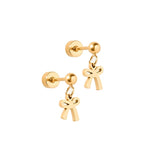 These earrings feature adorable gold screwback studs shaped like a charming bow accent. The playful design adds a fun and sweet touch to the classic stud style, making them perfect for anyone looking to add a whimsical detail to their jewelry collection.