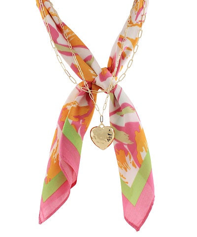 Bright and playful, the Multi Pink/Gold Heart Pendant & Scarf Necklace features a vibrant printed scarf paired with layered gold-tone chains and a polished heart pendant. This statement piece blends bold color with romantic charm for an effortlessly standout look.
