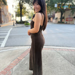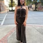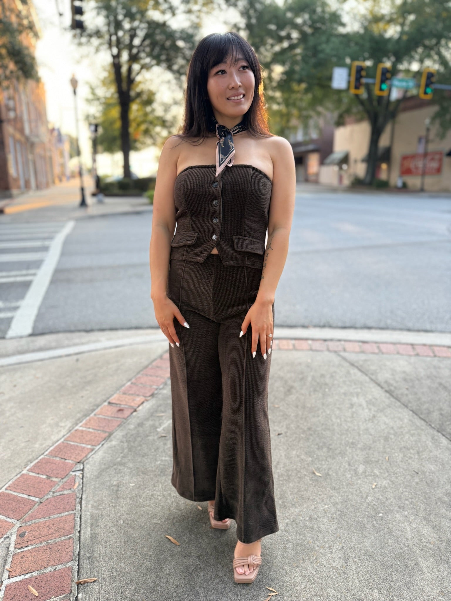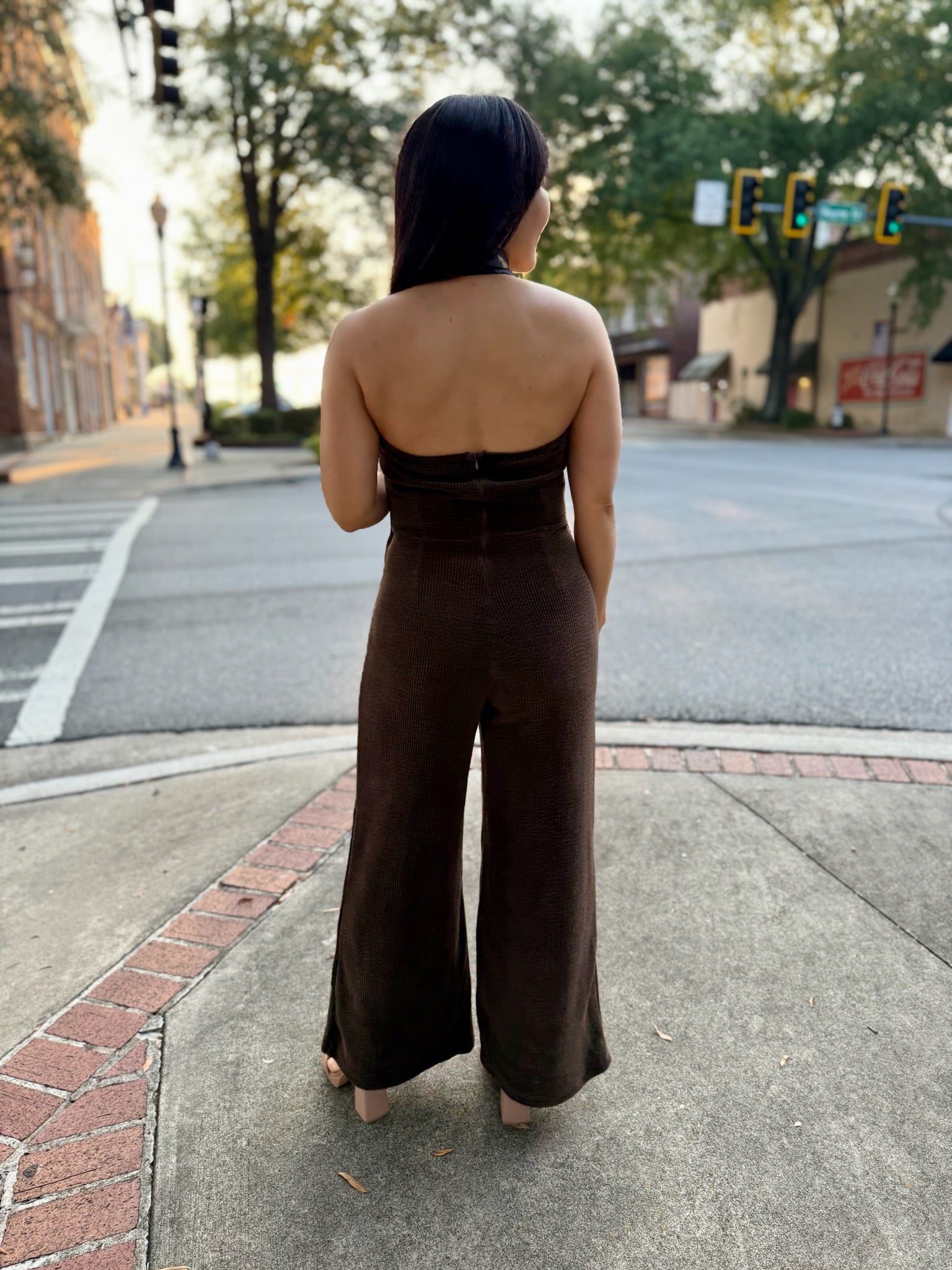 Effortlessly sleek, this strapless jumpsuit features a rich chocolate brown hue and a wide-leg silhouette for a flattering, elongated look. Designed with a fitted bodice and flowy bottoms, it blends comfort with sophistication—perfect for dressing up with heels or keeping it casual with flats.