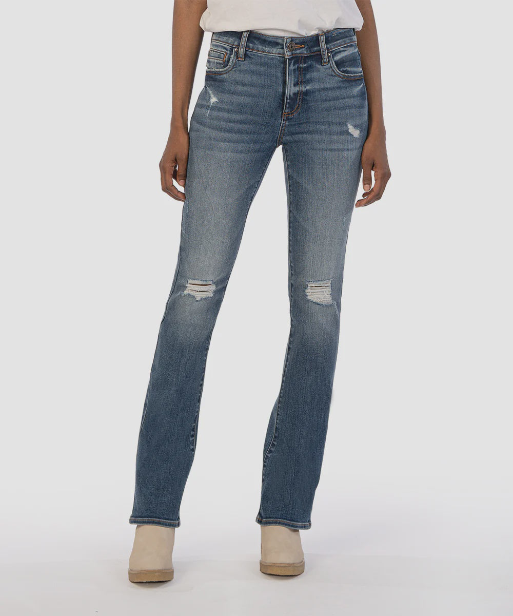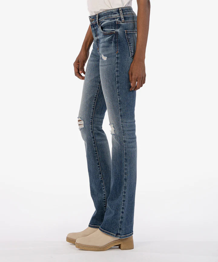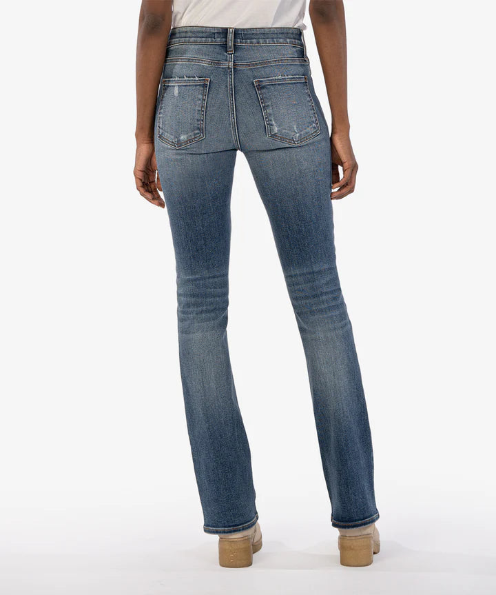 A faded wash ensures a relaxed feel in stretchy, full-length bootcut jeans featuring Fab Ab front pockets that gently smooth your silhouette.
