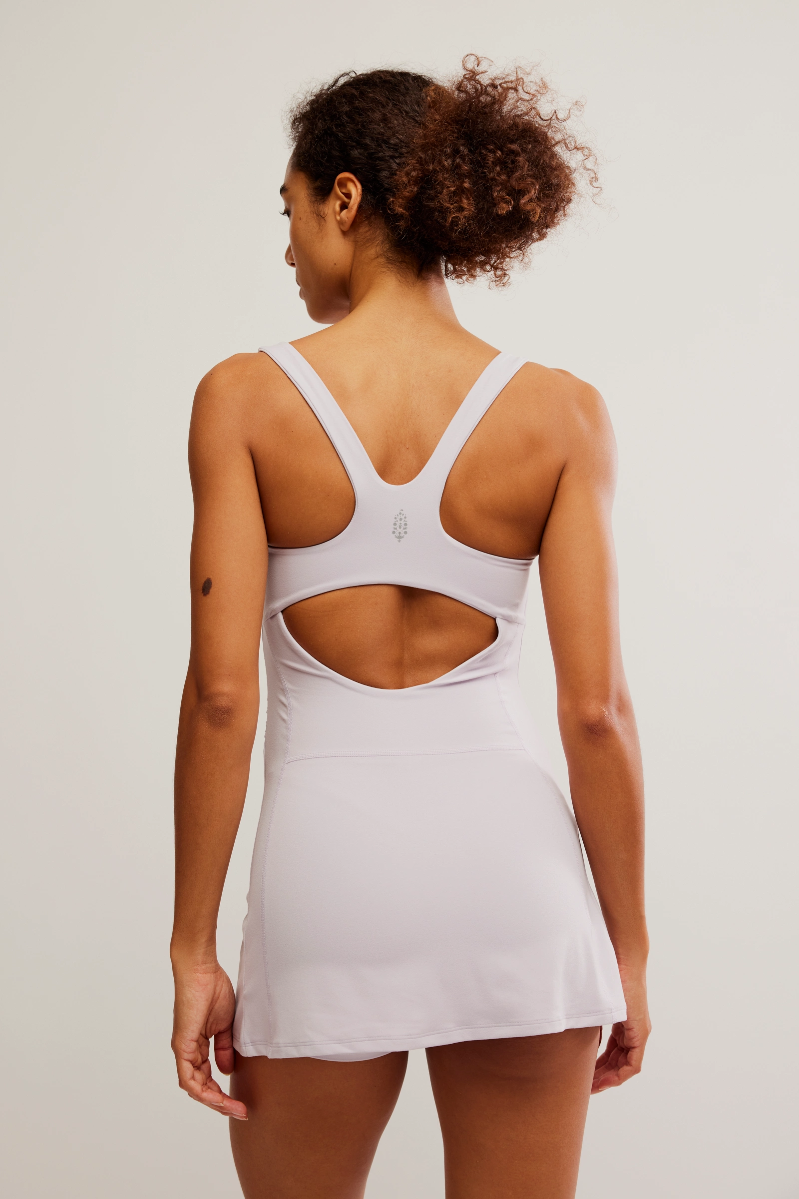 Fit: Fitted; racer-back; low back cutout; built-in shorts are micro-length; dress is shorty-length