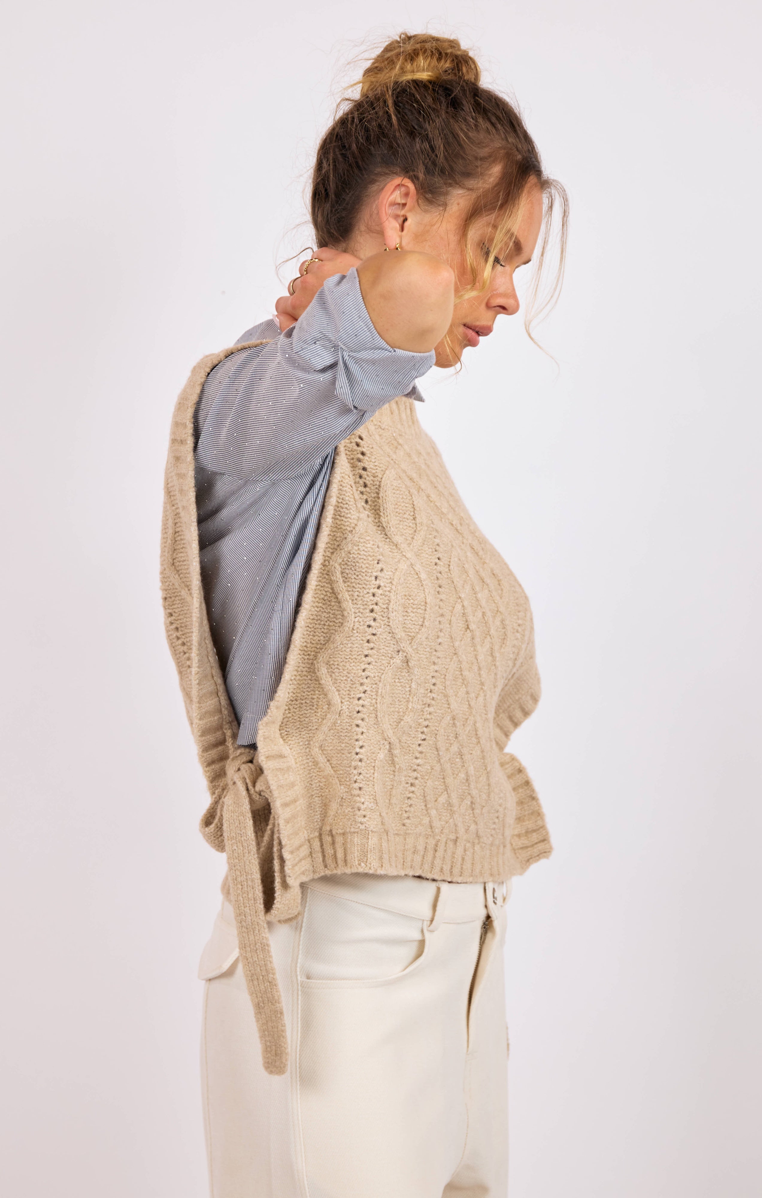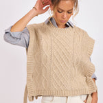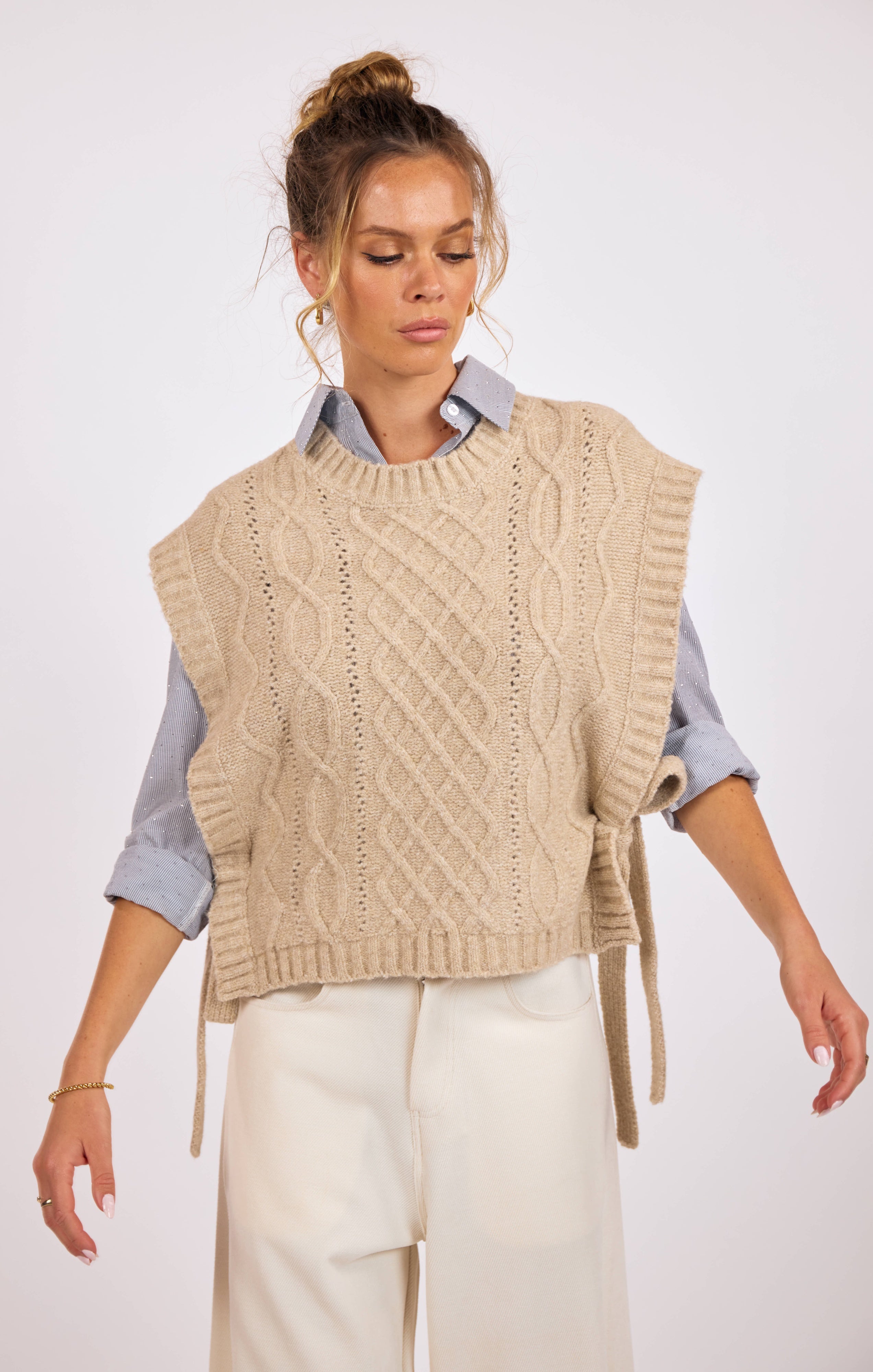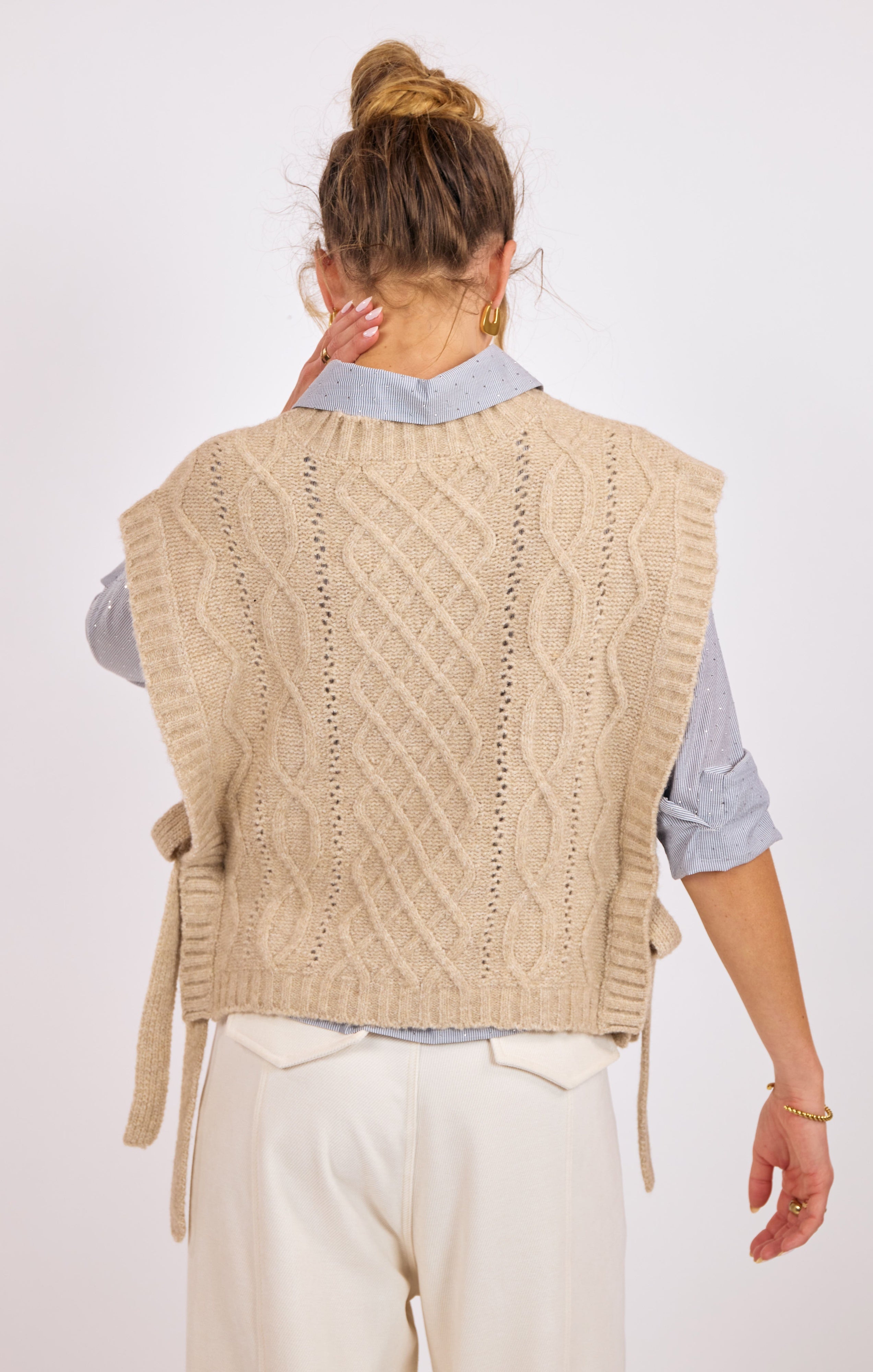 Layer on effortless style with this cozy cable knit vest, crafted in a warm oatmeal hue that pairs seamlessly with any wardrobe. Featuring classic textured detailing and chic side ties, it brings a modern twist to a timeless silhouette. Perfect for layering over crisp shirts or turtlenecks, this versatile piece adds depth and dimension to both casual and polished looks.