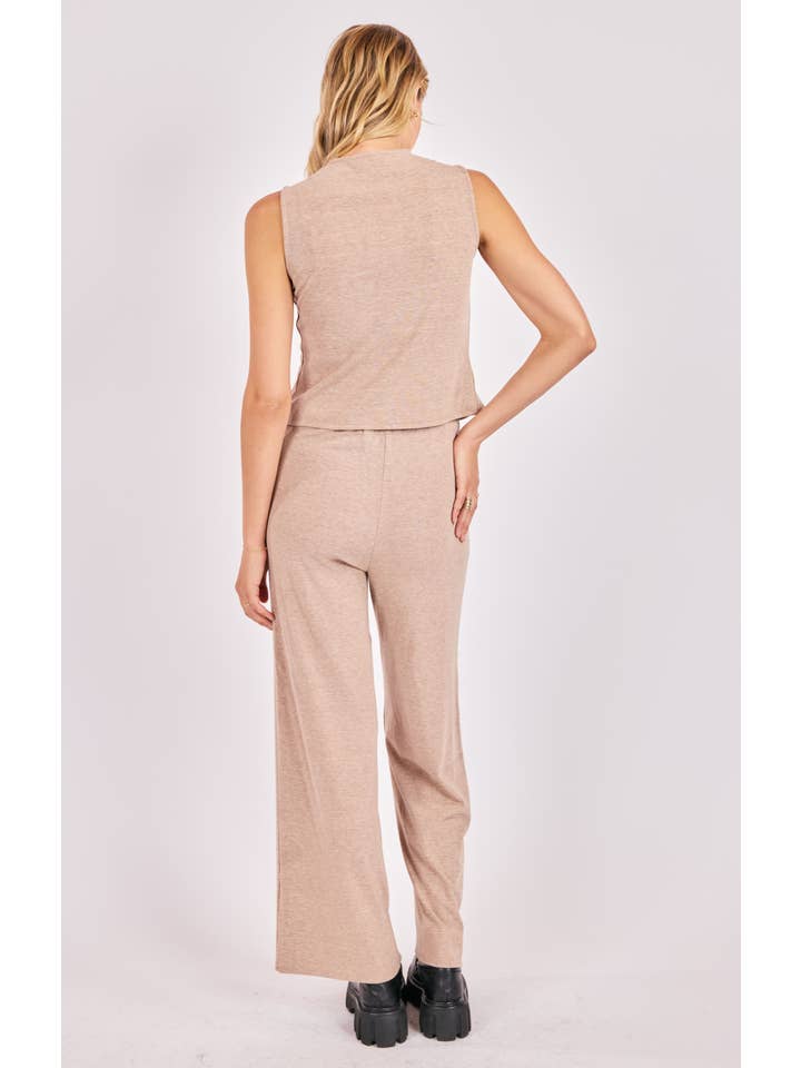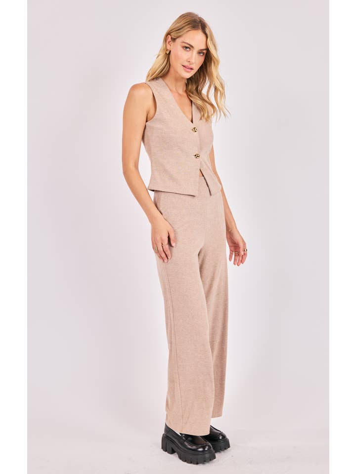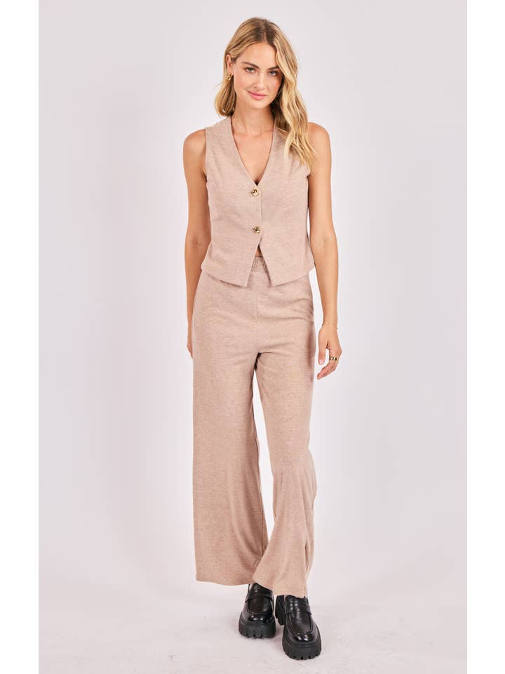 Comfort meets polish with the Oatmeal Rhapsody Pull On Pants. Crafted from a soft knit with a relaxed, wide-leg silhouette, these pants are designed for effortless wear without sacrificing style. The pull-on waistband keeps them easy and comfortable, while the neutral oatmeal shade makes them endlessly versatile. Pair them with the matching vest for a chic coordinated look, or style them with your favorite knits and blouses for an elevated everyday outfit.
