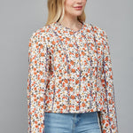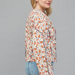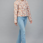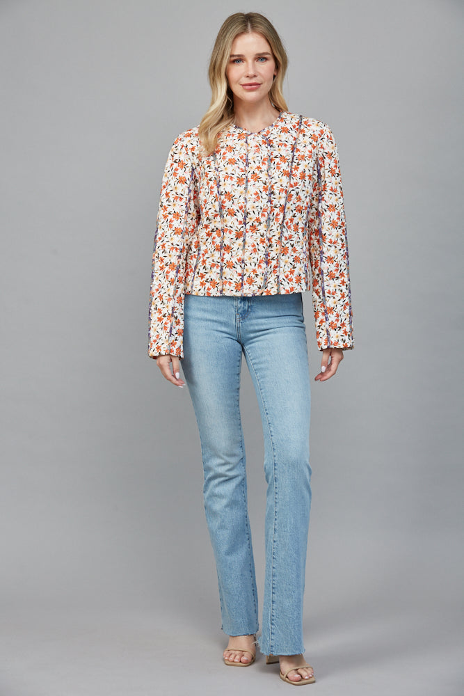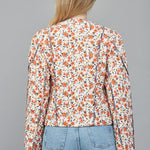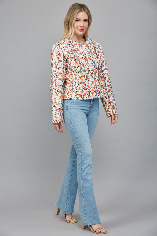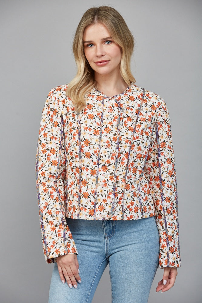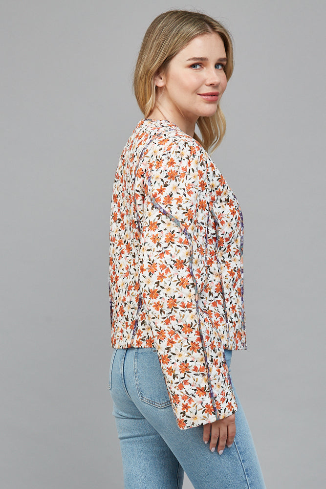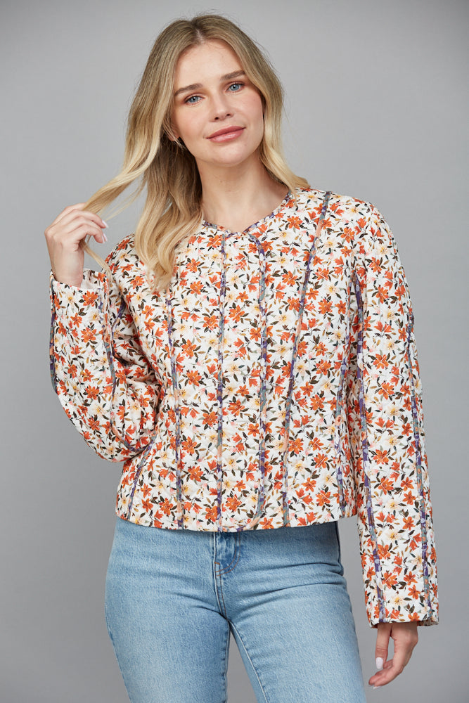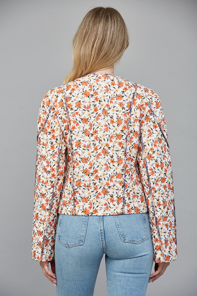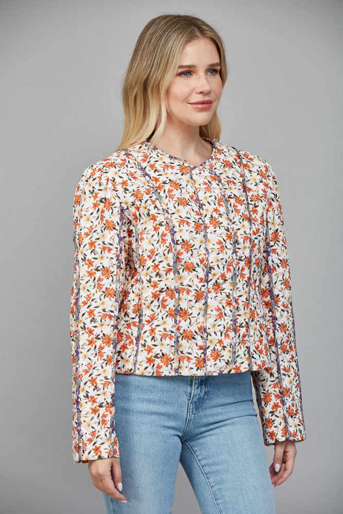 Off White Multi Contrasting Piping Floral Print Quilted Jacket