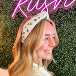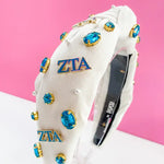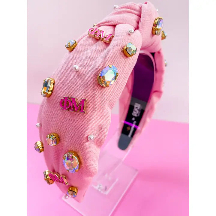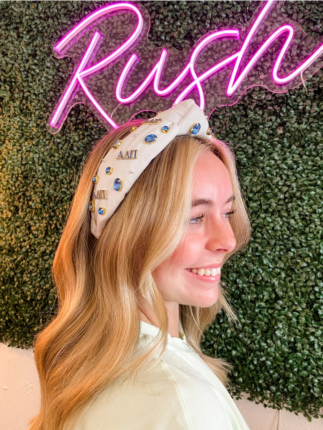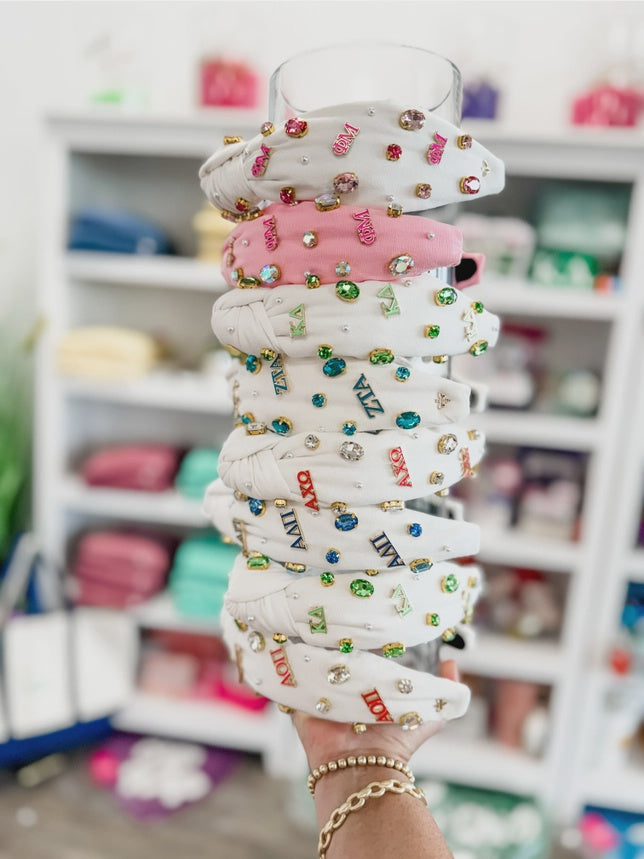 This exclusive headband, found only at Rush Greek Gifts, is officially licensed, made from cotton twill material with hand sewn jewels and custom die cut enamel Greek letters.